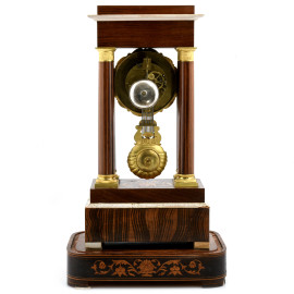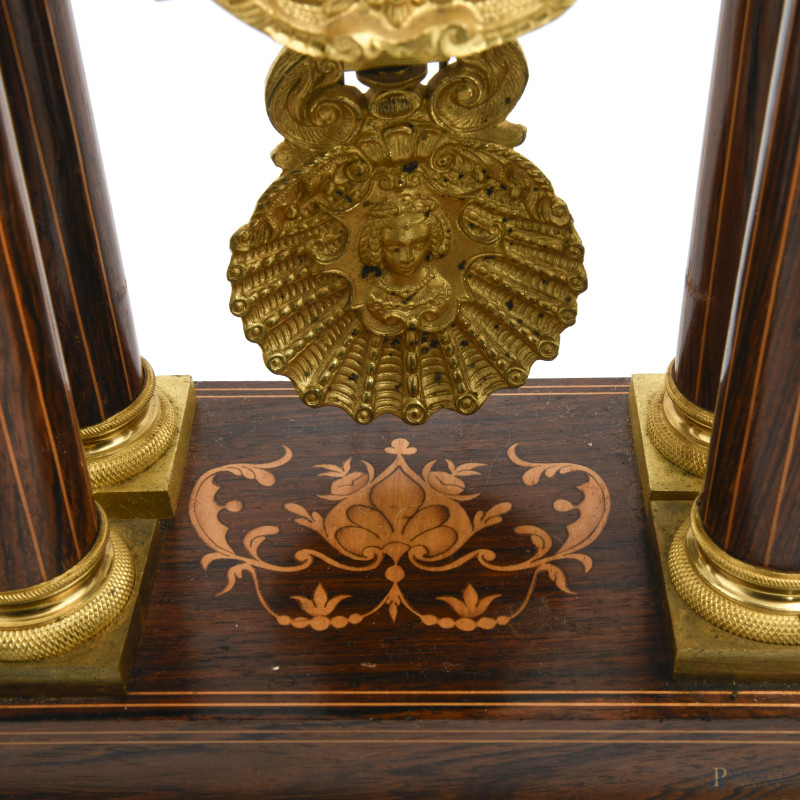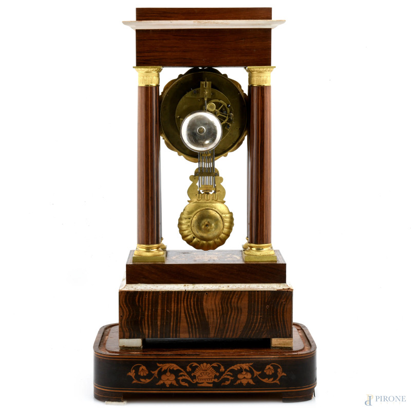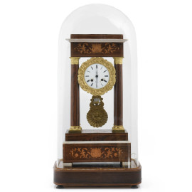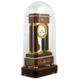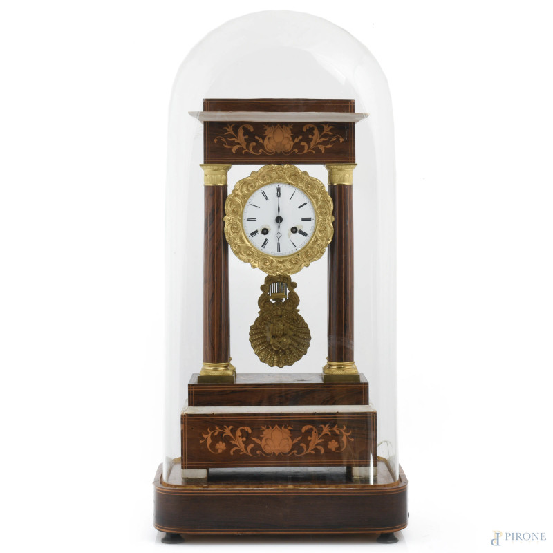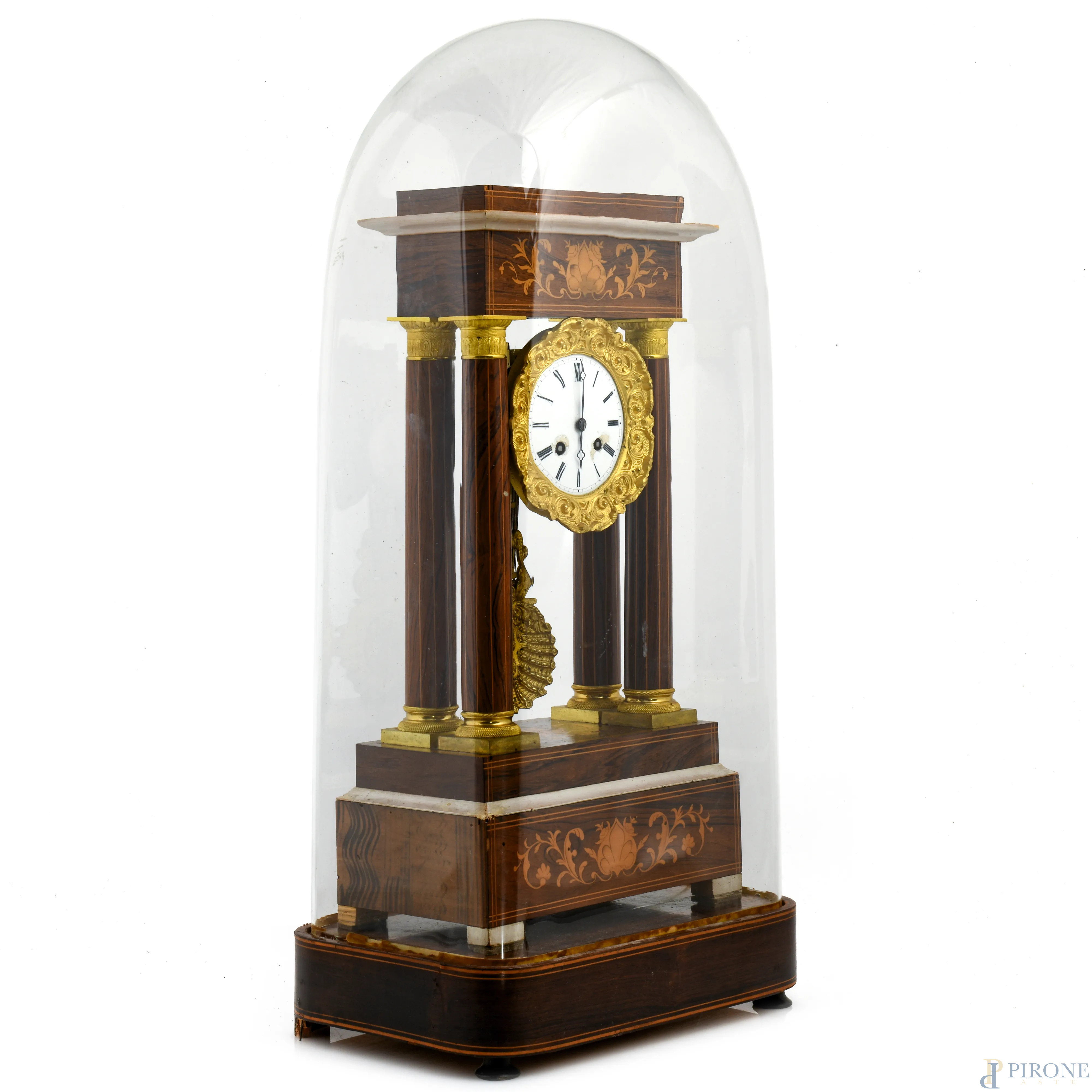Orologio in stile Carlo X in legno impiallacciato e intarsiato con quadrante in bronzo dorato e smalto a numeri romani tra quattro colonne a fusto liscio, entro campana in vetro, XX secolo, misure complessive 65x31x20, (segni di usura, scalfiture, rotture, difetti, da revisionare)
