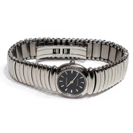 Orologio vintage da polso Mondia da donna, Swiss Made, cassa rotonda in metallo argentato impreziosita da diamanti incastonati lungo la lunetta, quadrante nero con indici applicati e firma MONDIA-DIAMONDS, movimento svizzero al quarzo, bracciale in acciaio, produzione anni 80