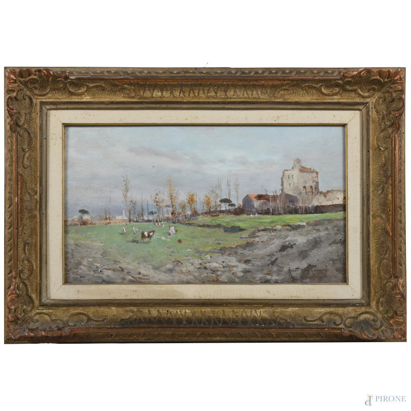 Oscar Ricciardi (1864- 1935), Sul Vomero, olio su compensato, cm 26,5x47, firmato in basso a destra, entro cornice