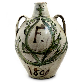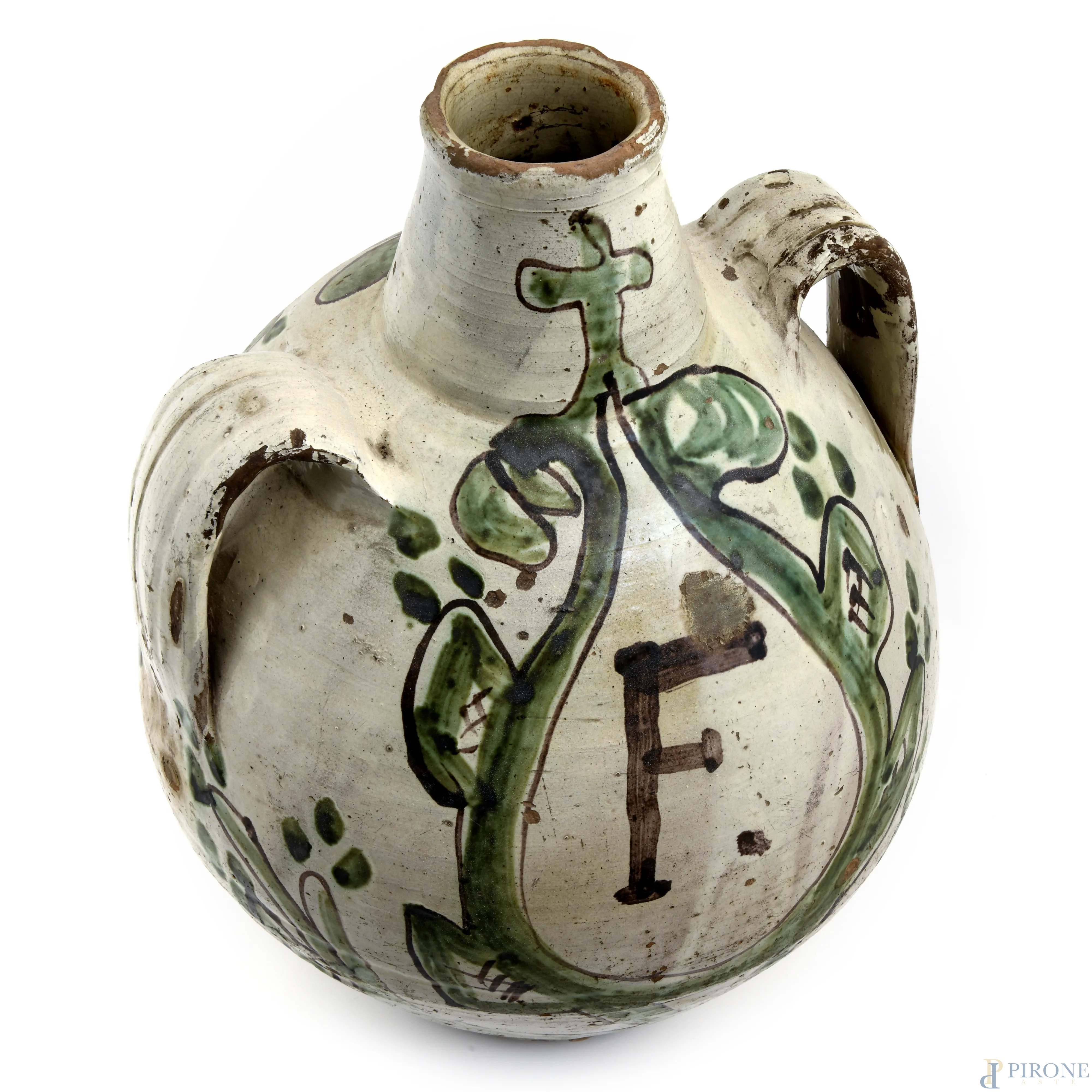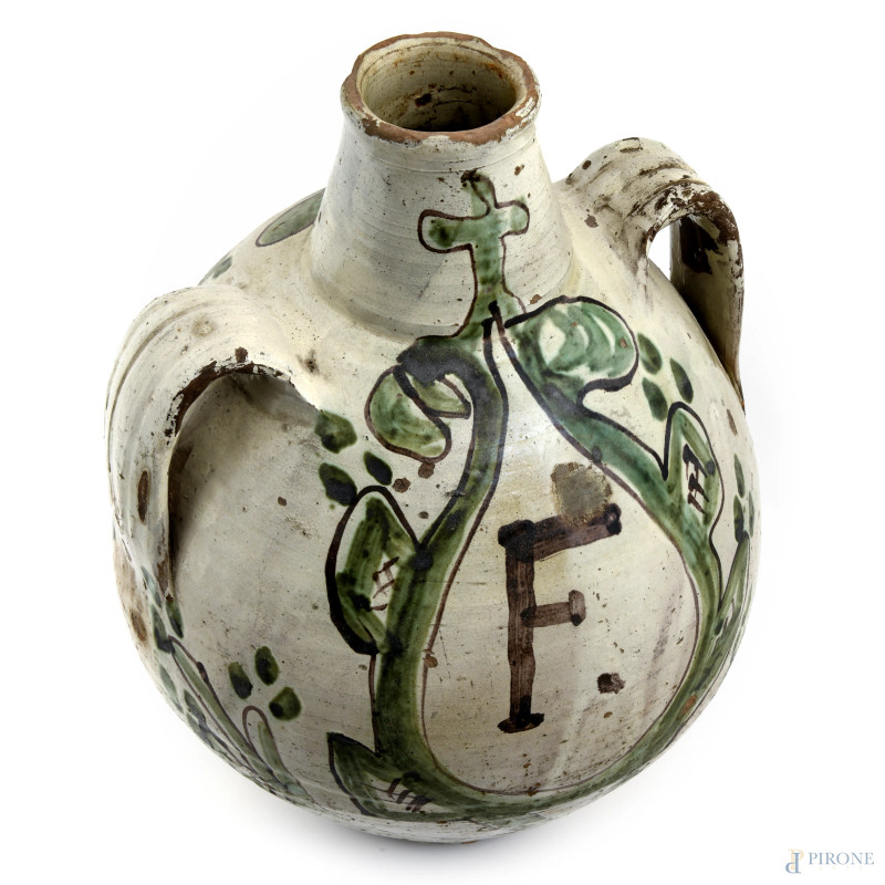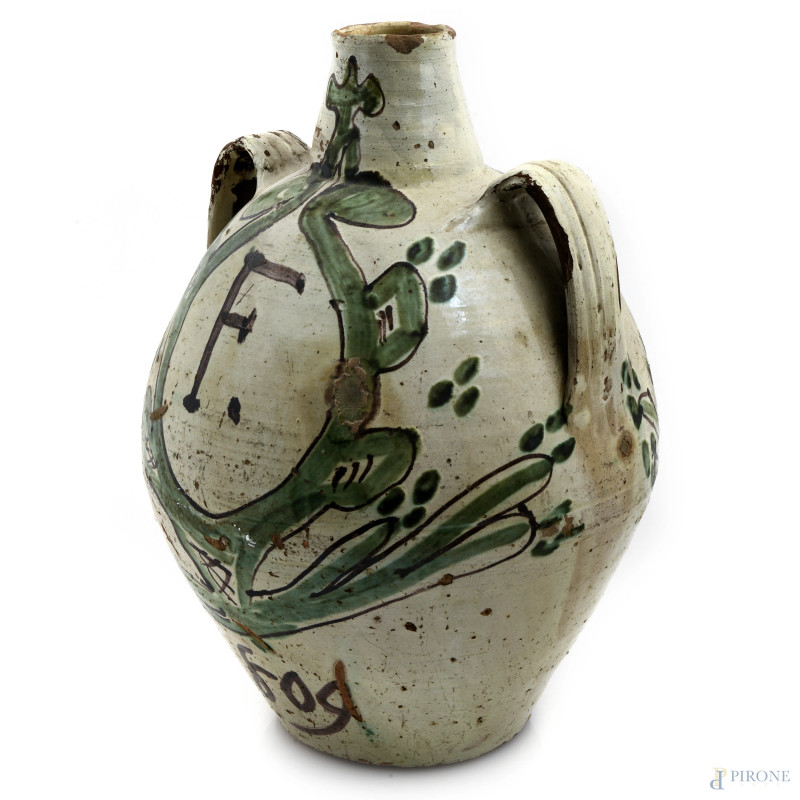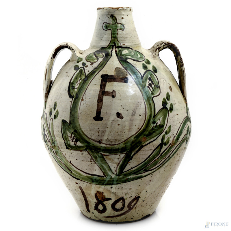 Otre biansato in maiolica dipinta e smaltata nei toni del bianco e del verde, XX secolo, altezza cm 45, (segni di usura, difetti, cadute di smalto, scalfiture)