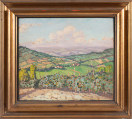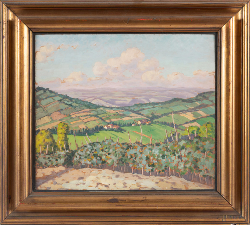 Paesaggio collinare, XX secolo, olio su compensato, cm 42x48, dedicato e datato al retro, entro cornice