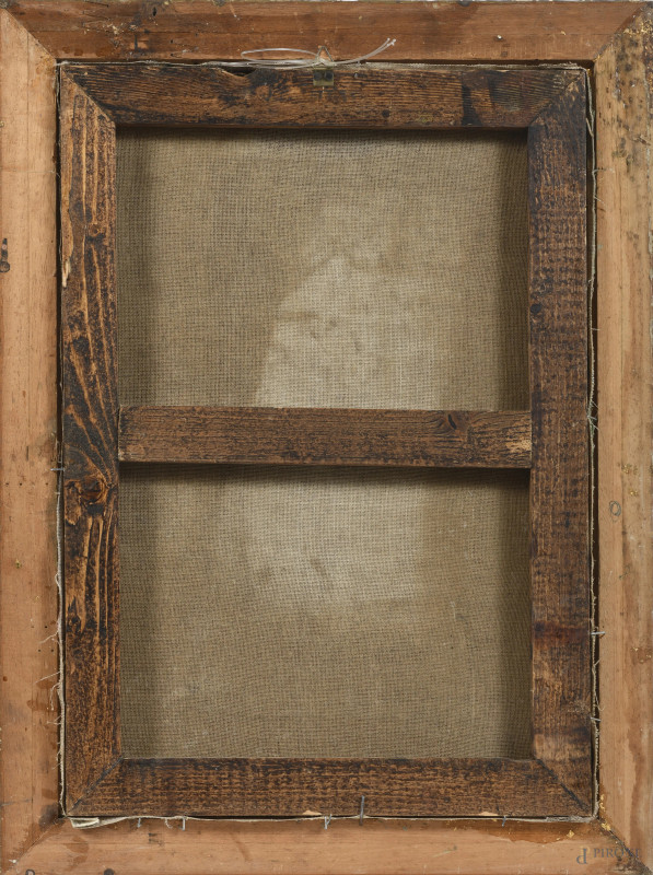 Paesaggio con figura, XIX -XX secolo, olio su tela, cm 53,5x38, entro cornice, (segni di usura, sollevamenti di colore, craquelure)