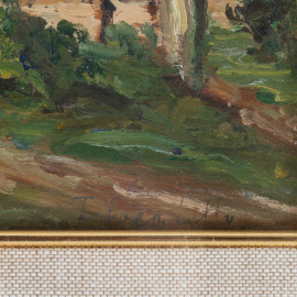 Paesaggio con ruscello, XX secolo, olio su tavoletta, cm 20x24,5, firmato in basso a destra, entro cornice