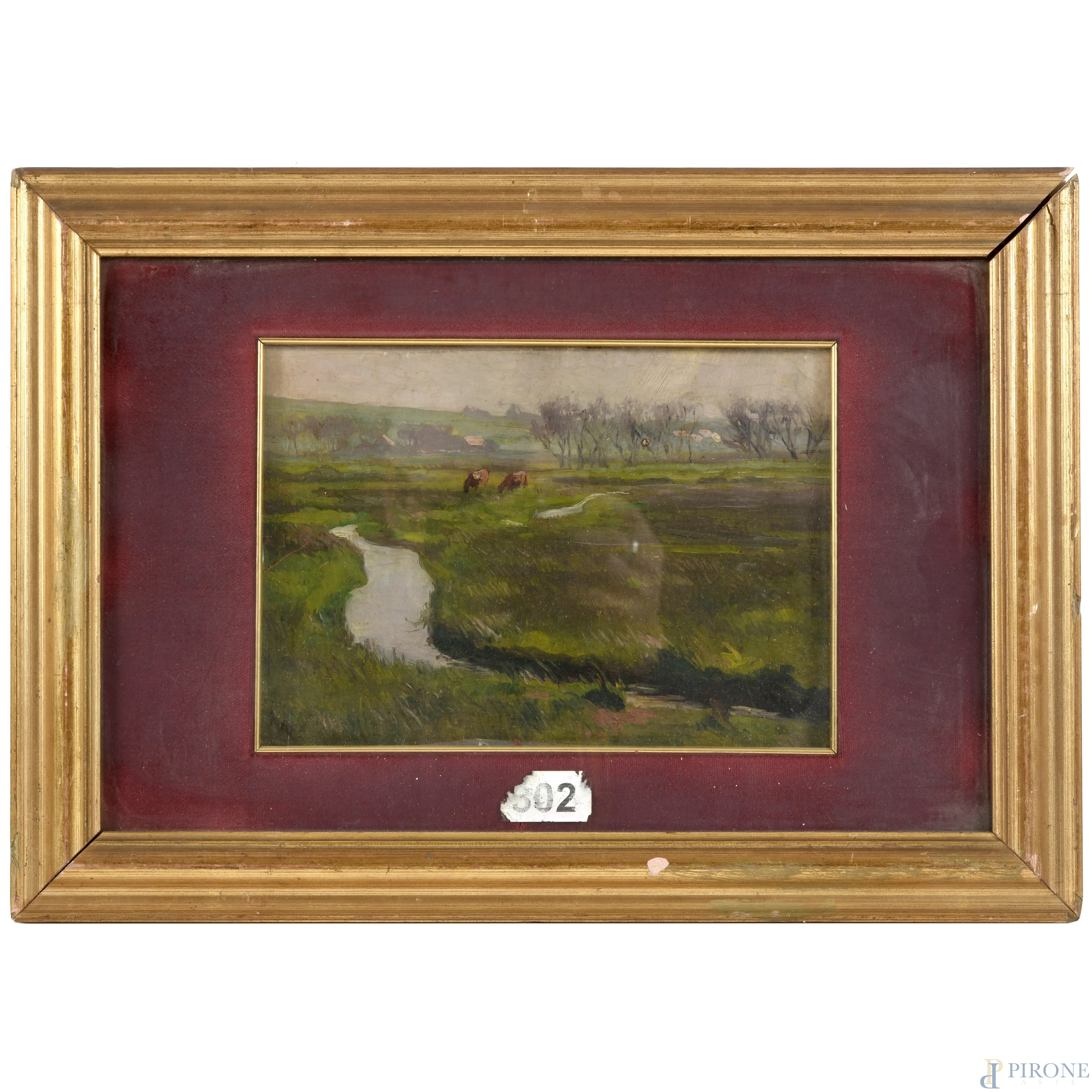 Paesaggio fluviale, XX secolo, olio su tela, cm 18x25, entro cornice