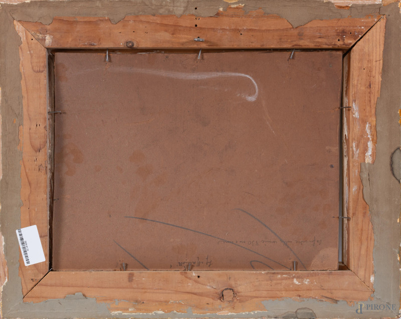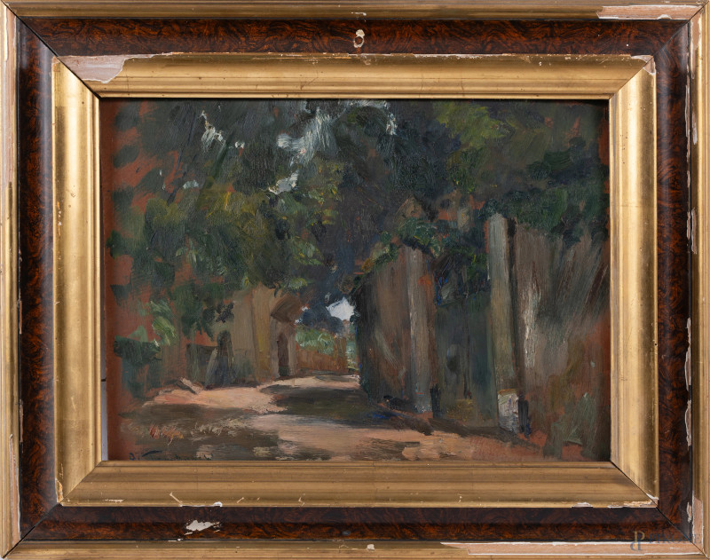 Paesaggio, XX secolo, olio su tavoletta, cm 34x43, entro cornice, firmato in basso a sinistra, (segni di usura, supporto lievemente imbarcato, difetti)