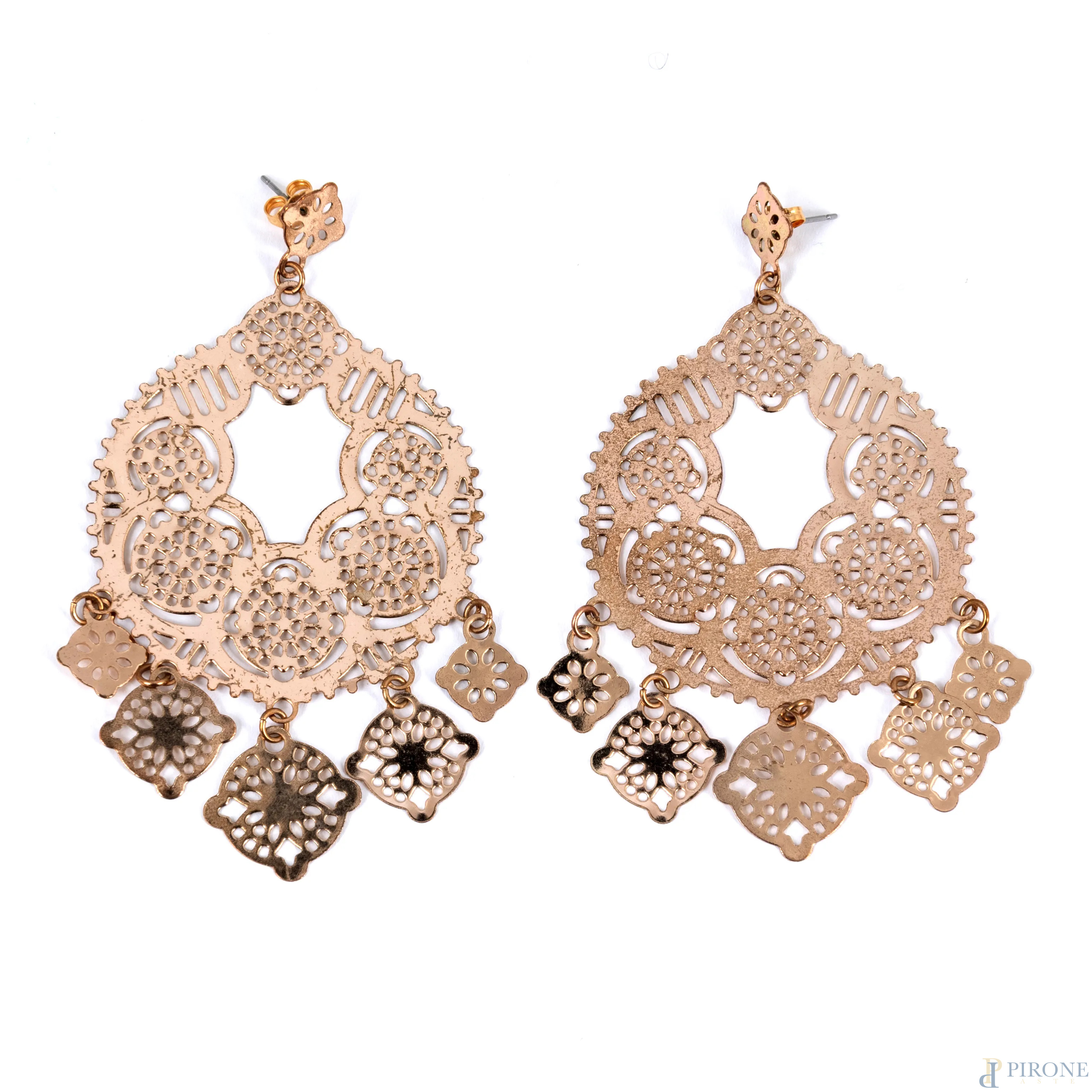 Paio di orecchini in metallo dorato e traforato, lunghezza cm 8