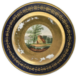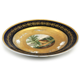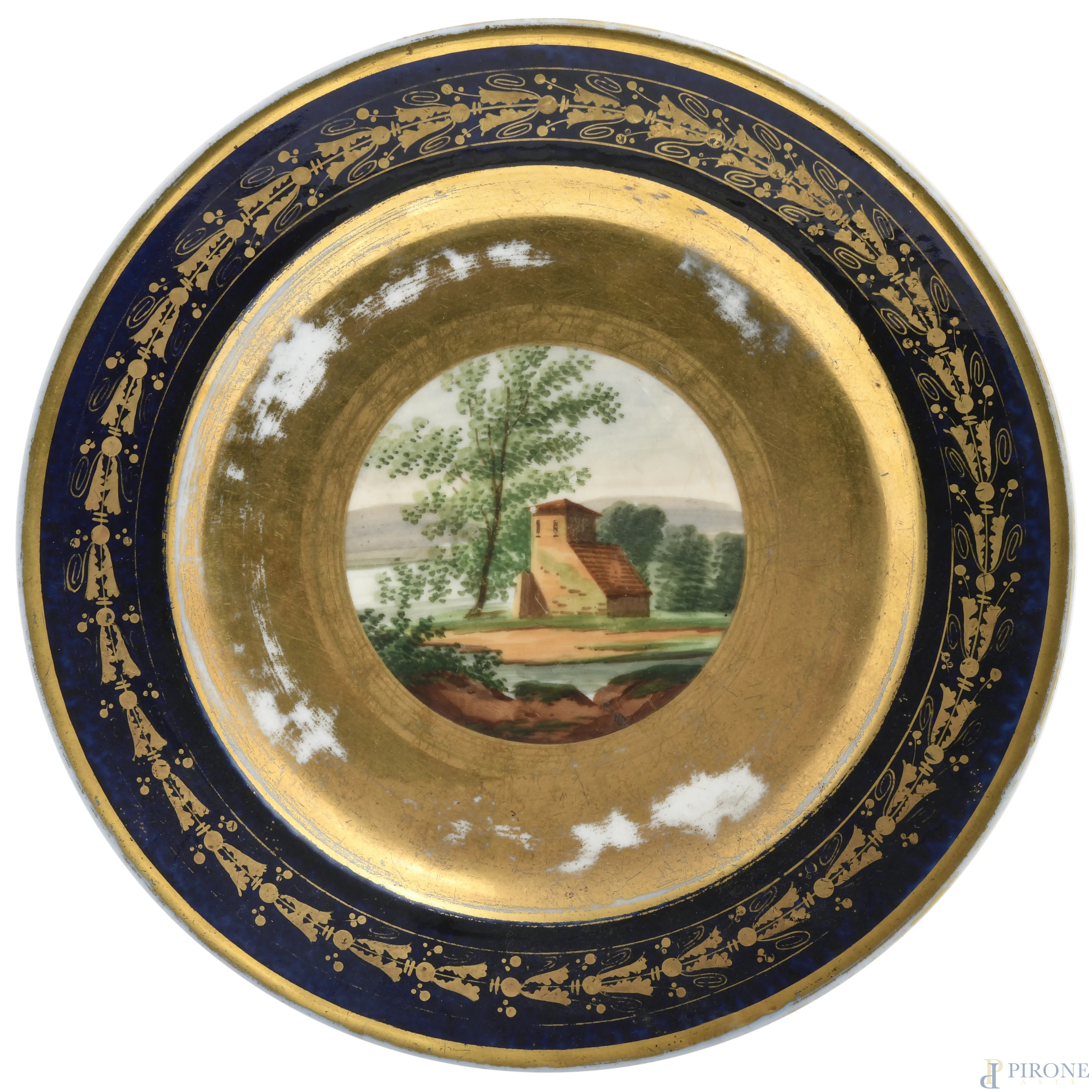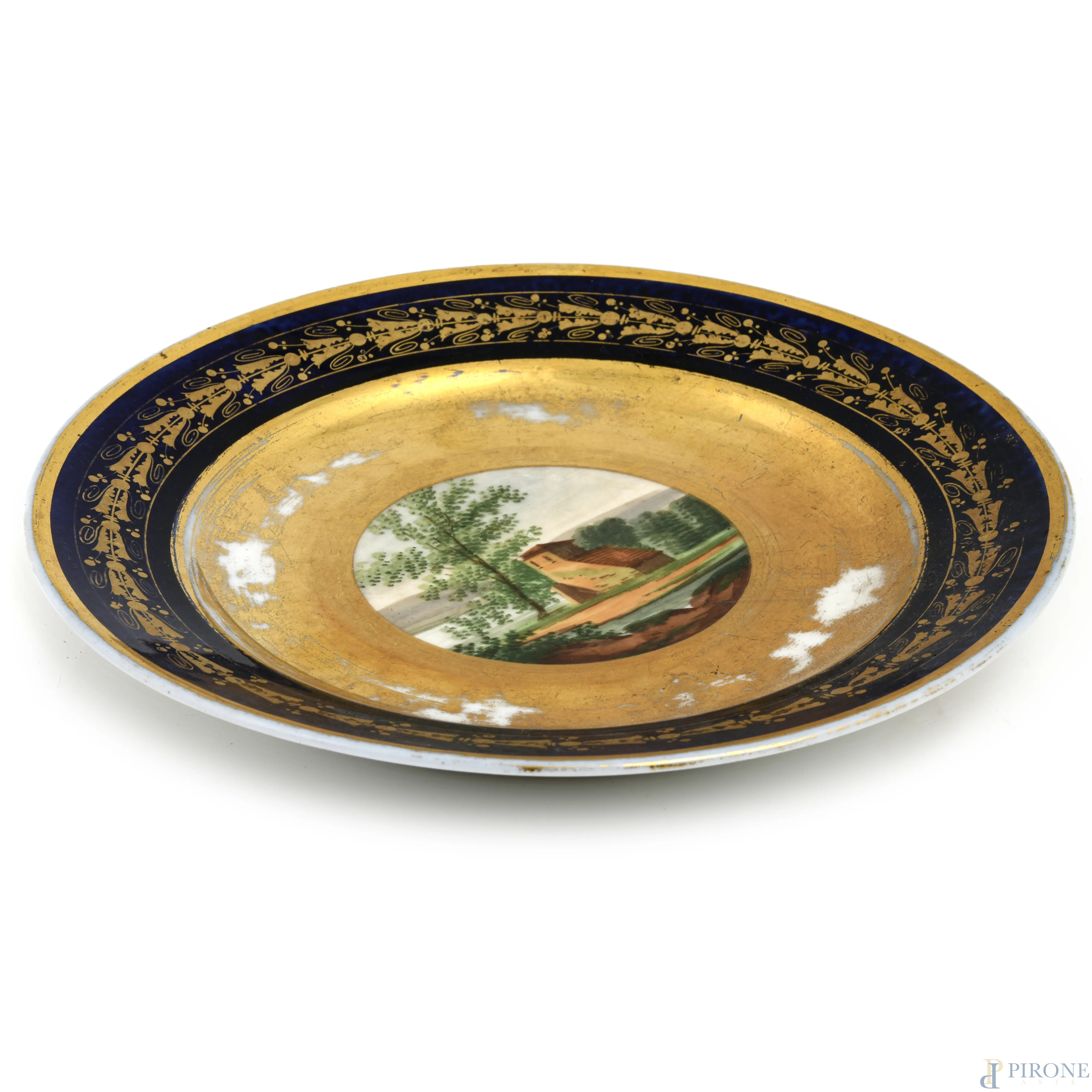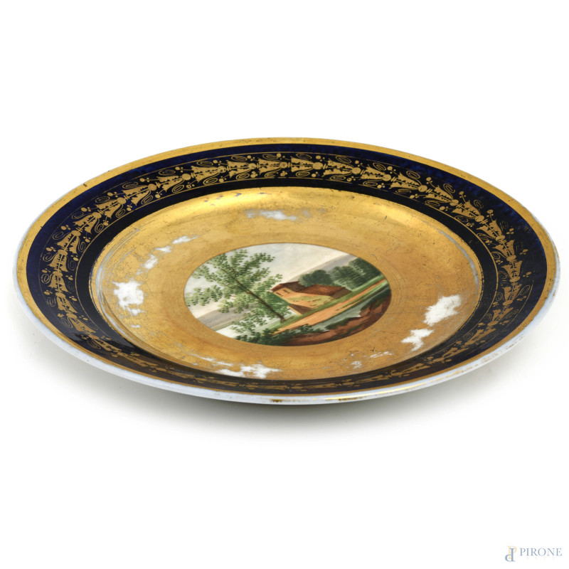 Piatto in porcellana con decori blu e oro e casolare al cavetto, XX secolo, cm 23, (segni di usura, difetti, cadute di doratura)