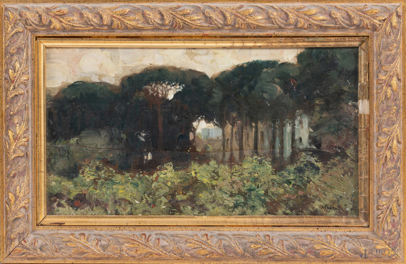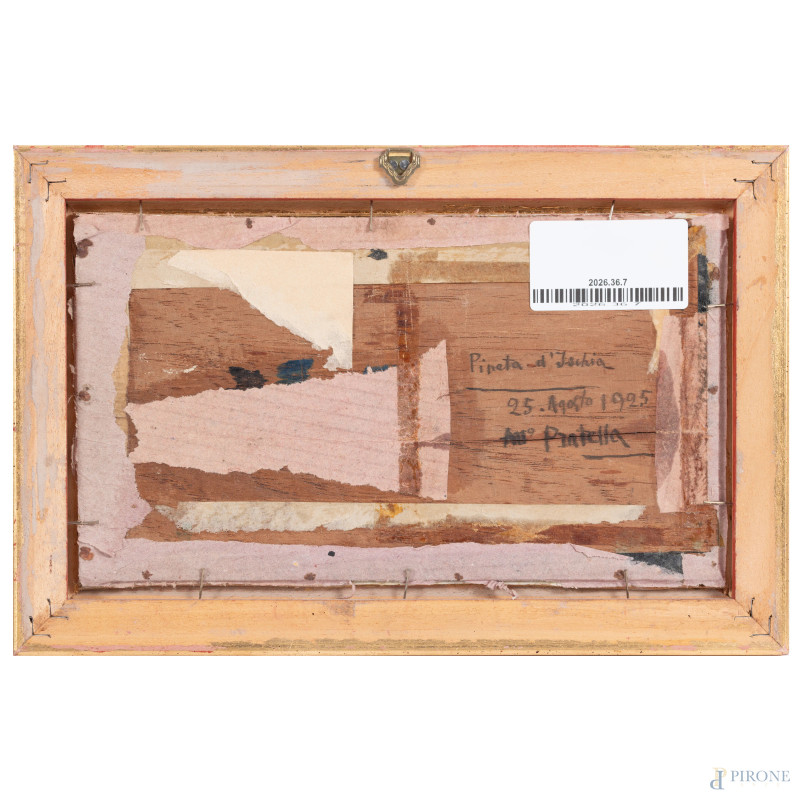 Pineta d'Ischia, XX secolo, olio su tavoletta, cm 13,5x23. firmato in basso a destra e firmato e datato al retro "25 agosto 1925", (fessurazioni, segni di usura)