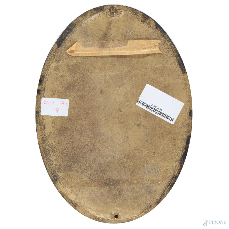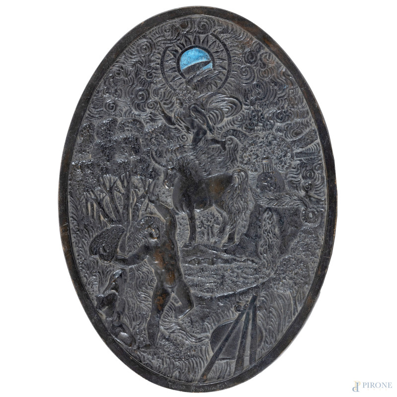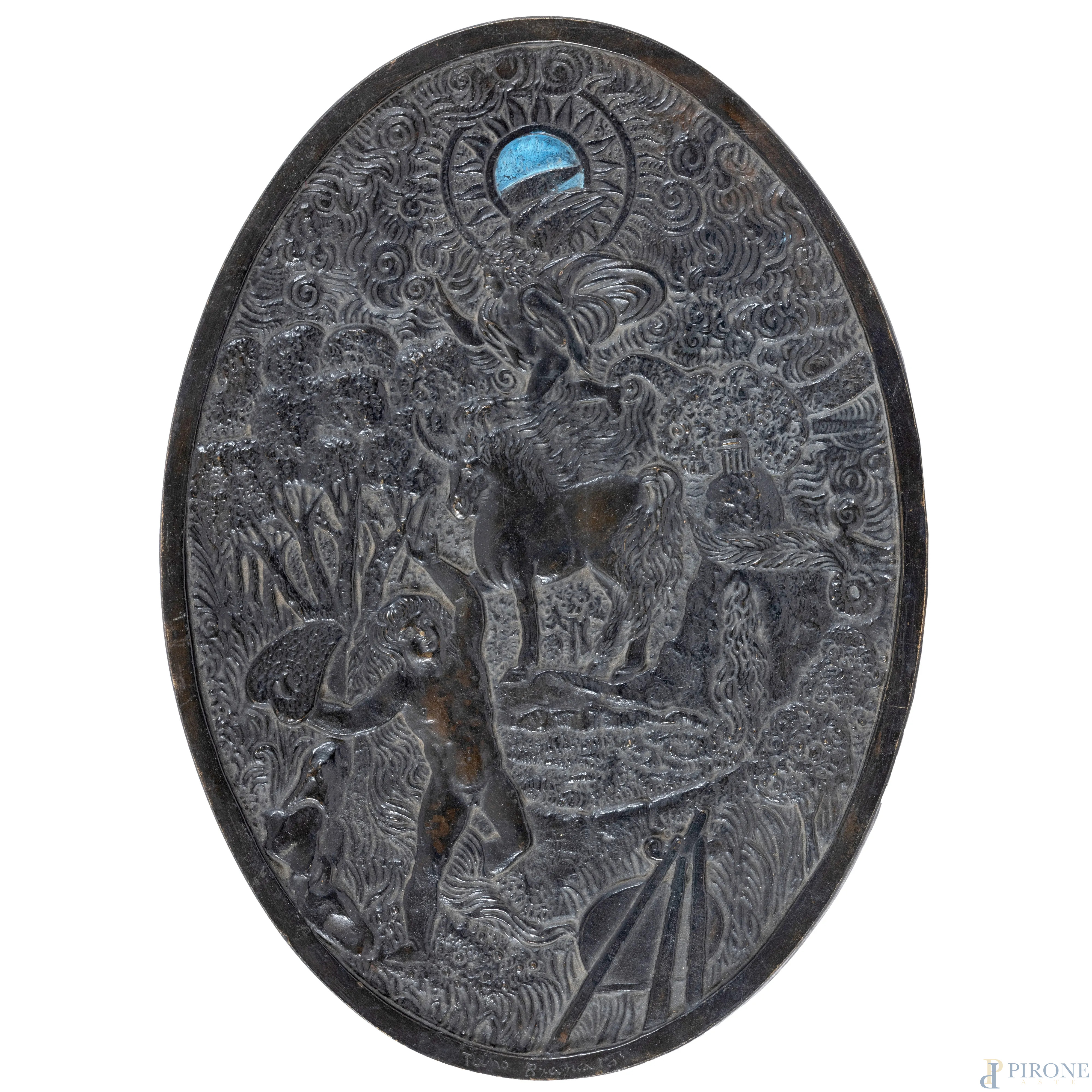 Placca in bronzo a serto ovale raffigurante scena onirica a bassorilievo, XX secolo, cm 29x21