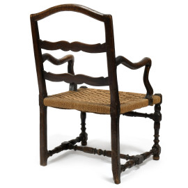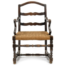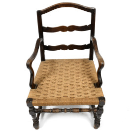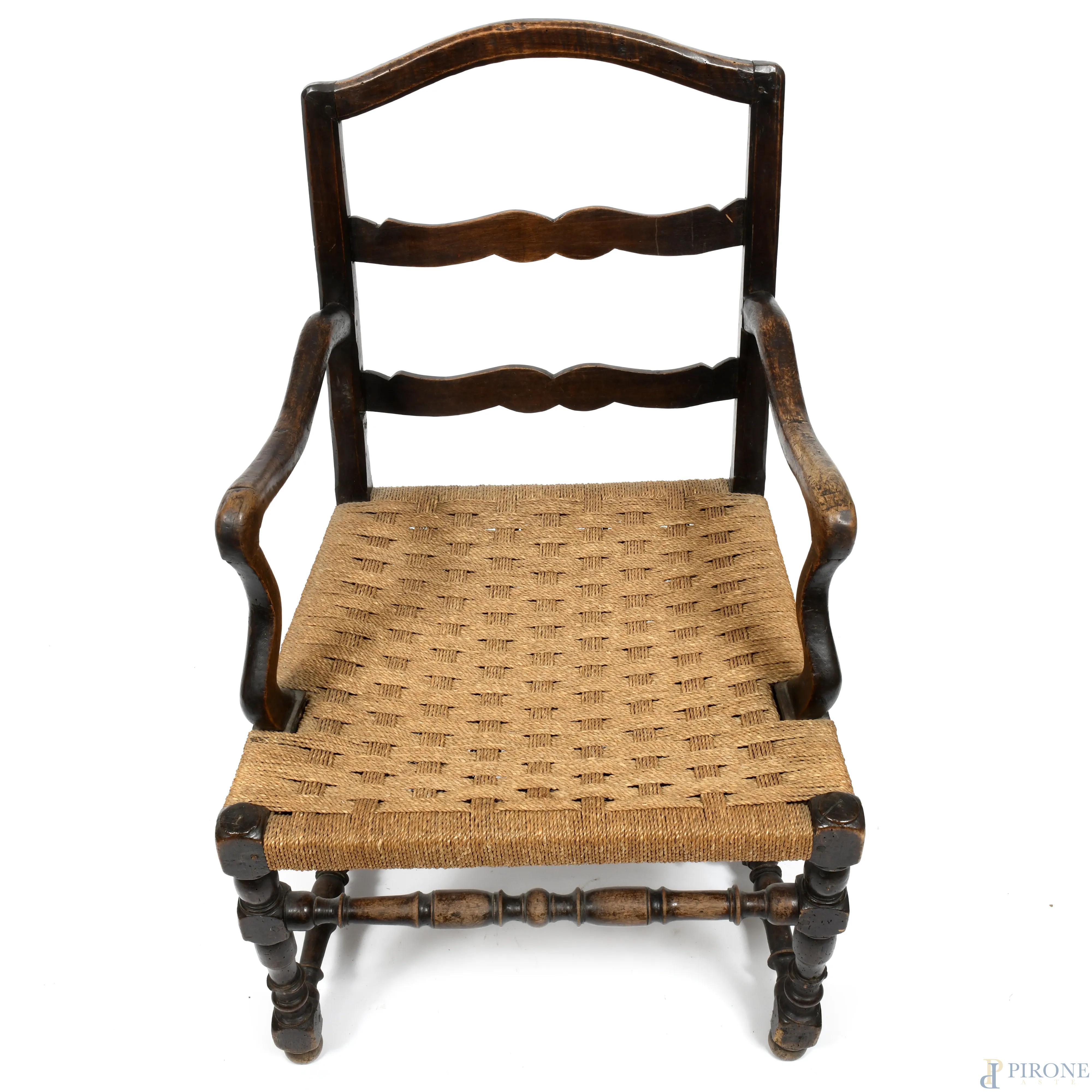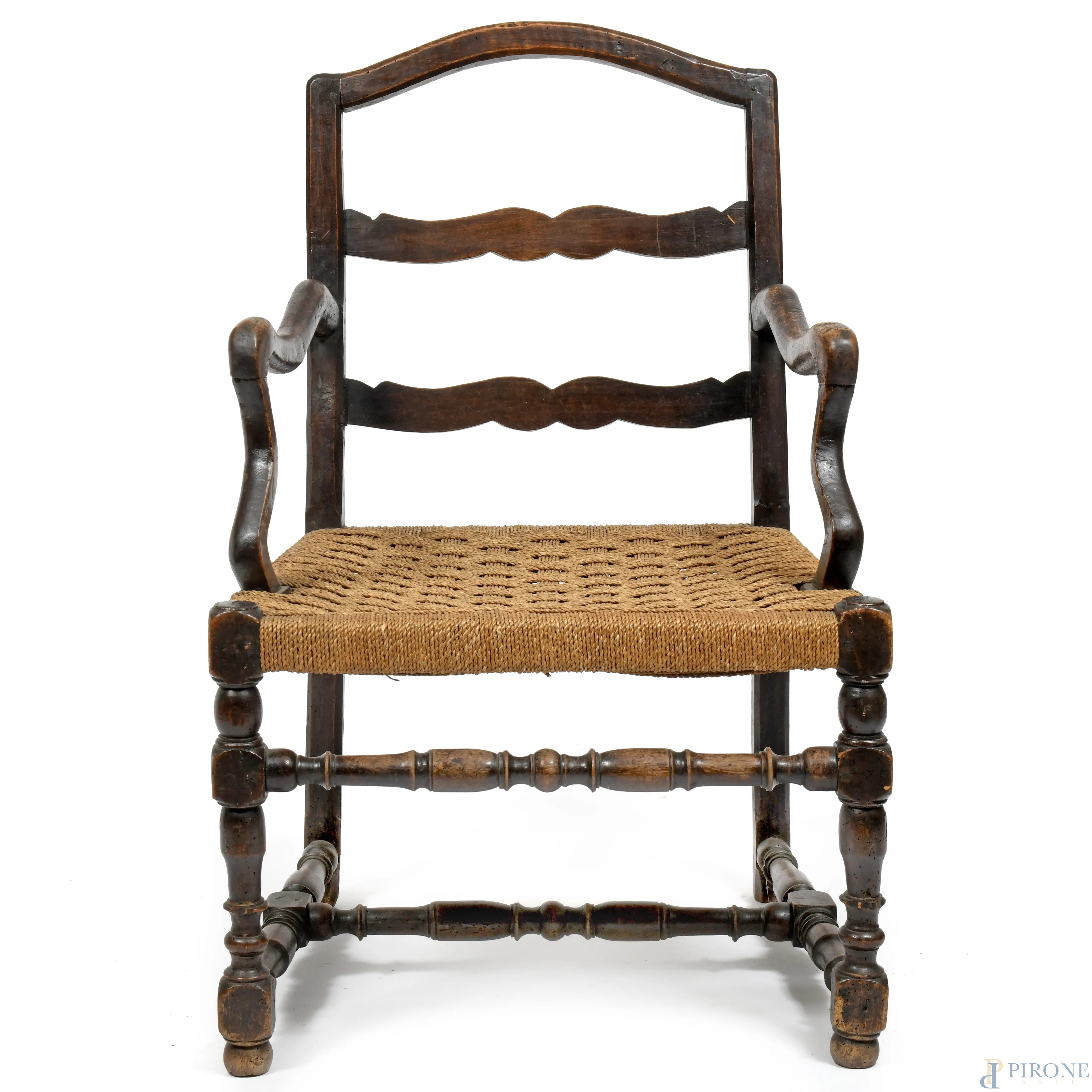 Poltrona in noce con gambe tornite raccordate da traverse e braccioli e schienale sagomati. Seduta in corda, XX secolo, cm 96x60x60, (segni di usura, fori di tarlo, difetti)