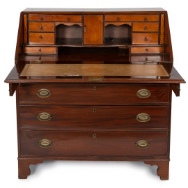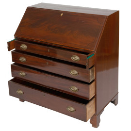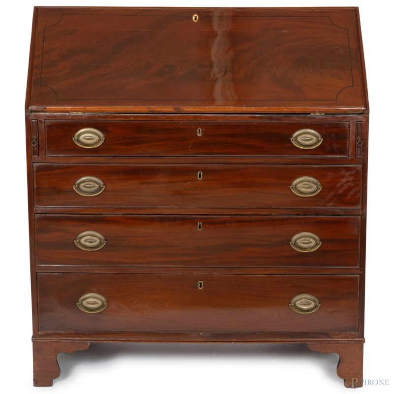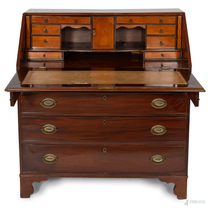 Ribalta impiallacciata in mogano con fronte scandito da quattro cassetti in colonna e ribalta celante vano scrittoio rivestito in cuoio panna e oro e cassettini portaoggetti, XX secolo, cm 109x96x53, (segni di usura, difetti, graffi, scalfiture)