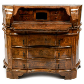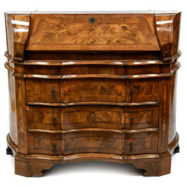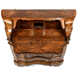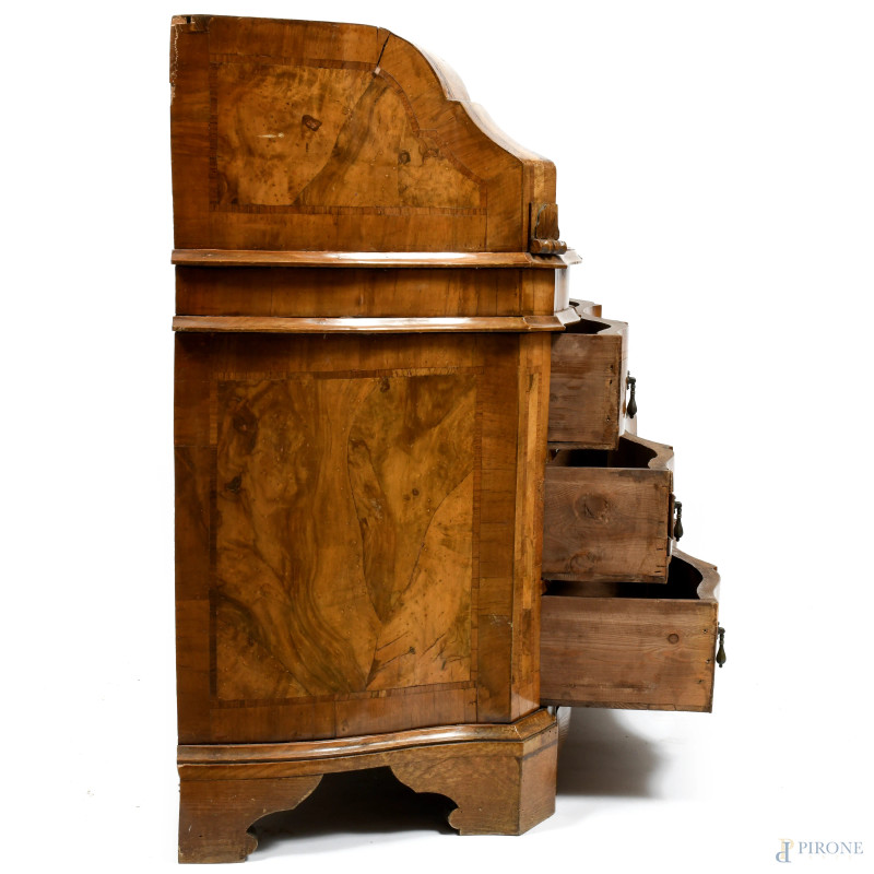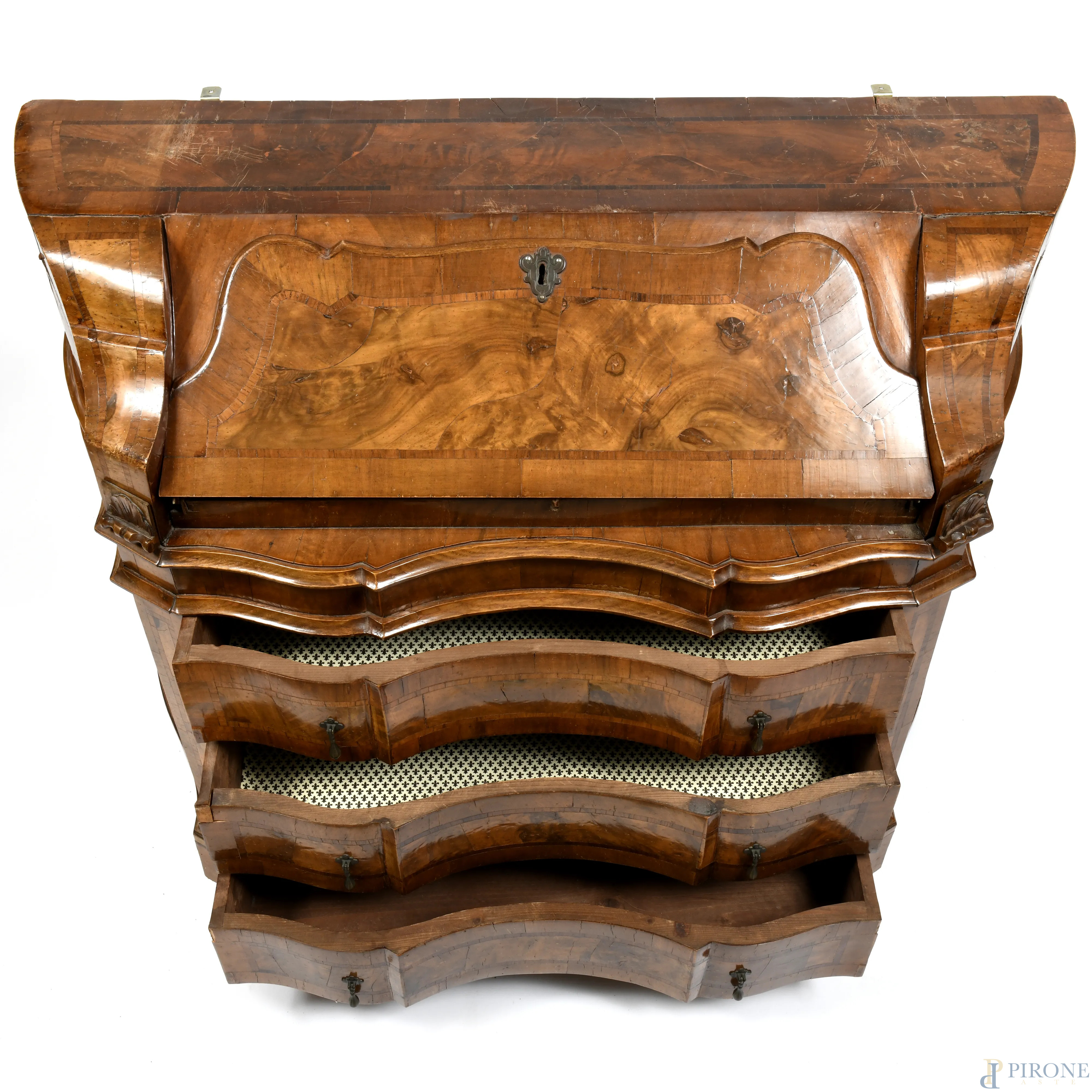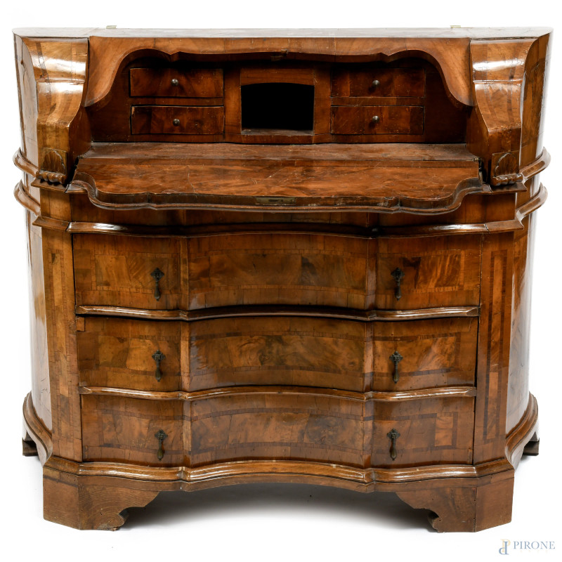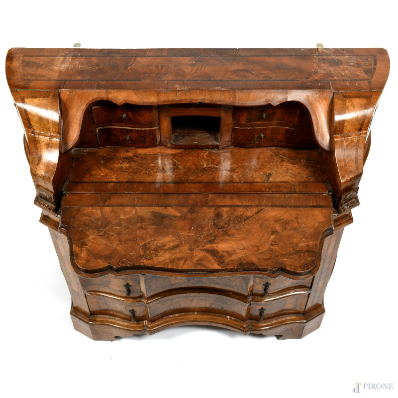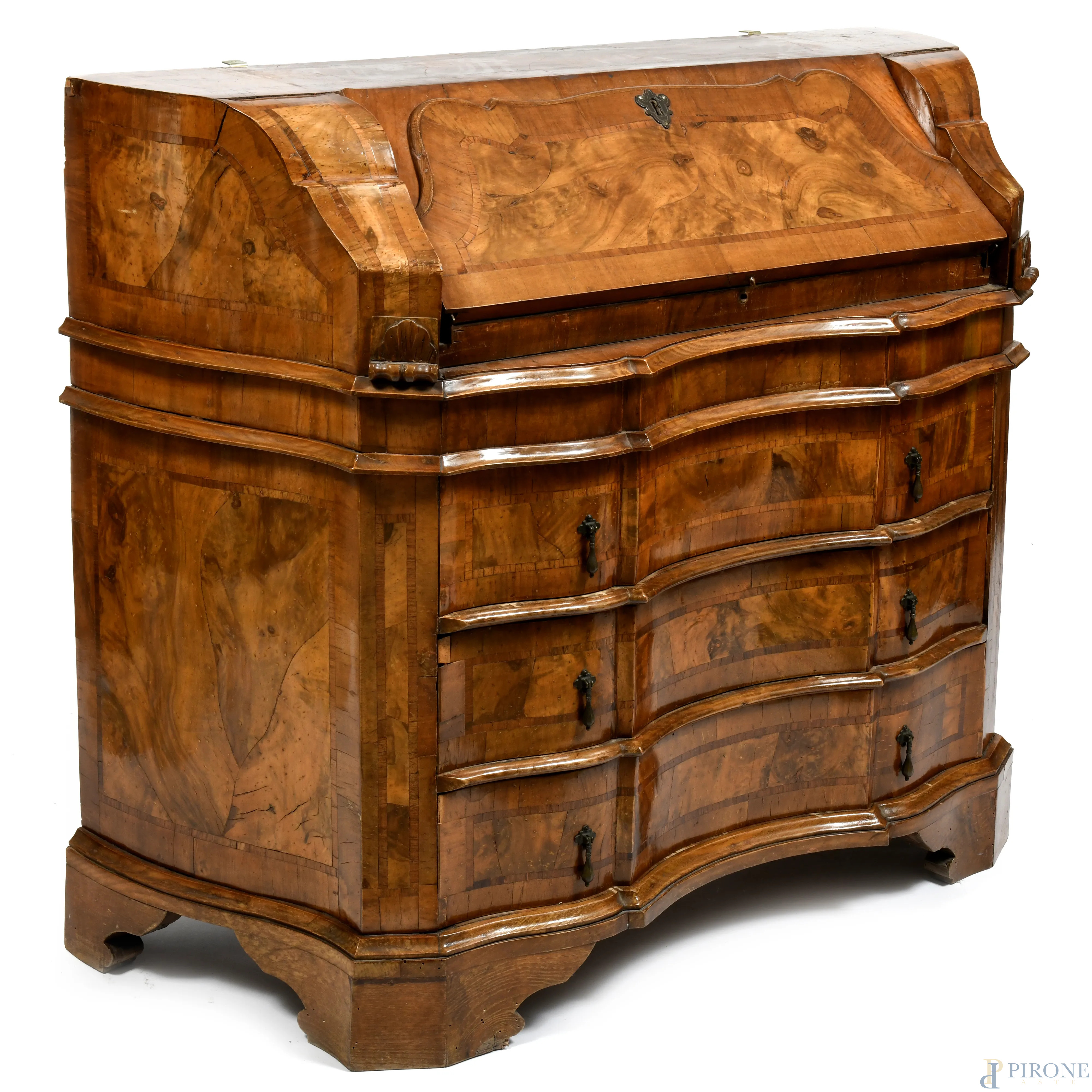 Ribalta Vecchia Verona impiallacciata in noce e radica di noce con fronte mosso con sportello a calatoia celante vano scrittoio, un cassettino e tre cassetti, XX secolo, cm 98x118x55, (Segni di usura, cadute di impiallacciatura, scalfiture, difetti, rotture)