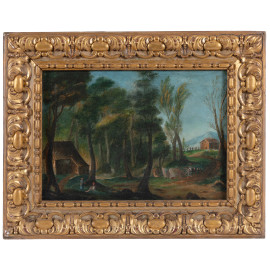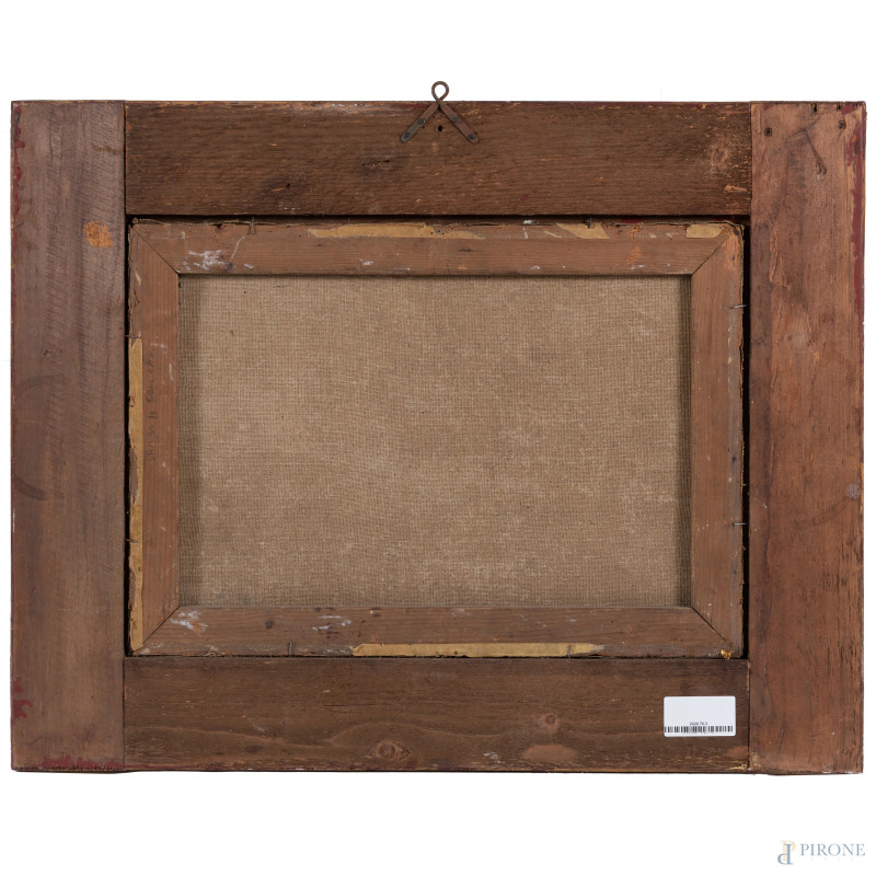 Riposo nel bosco, XIX secolo, olio su tela, cm 35x49, entro cornice, (craquelure e piccole abrasioni della superficie)