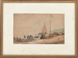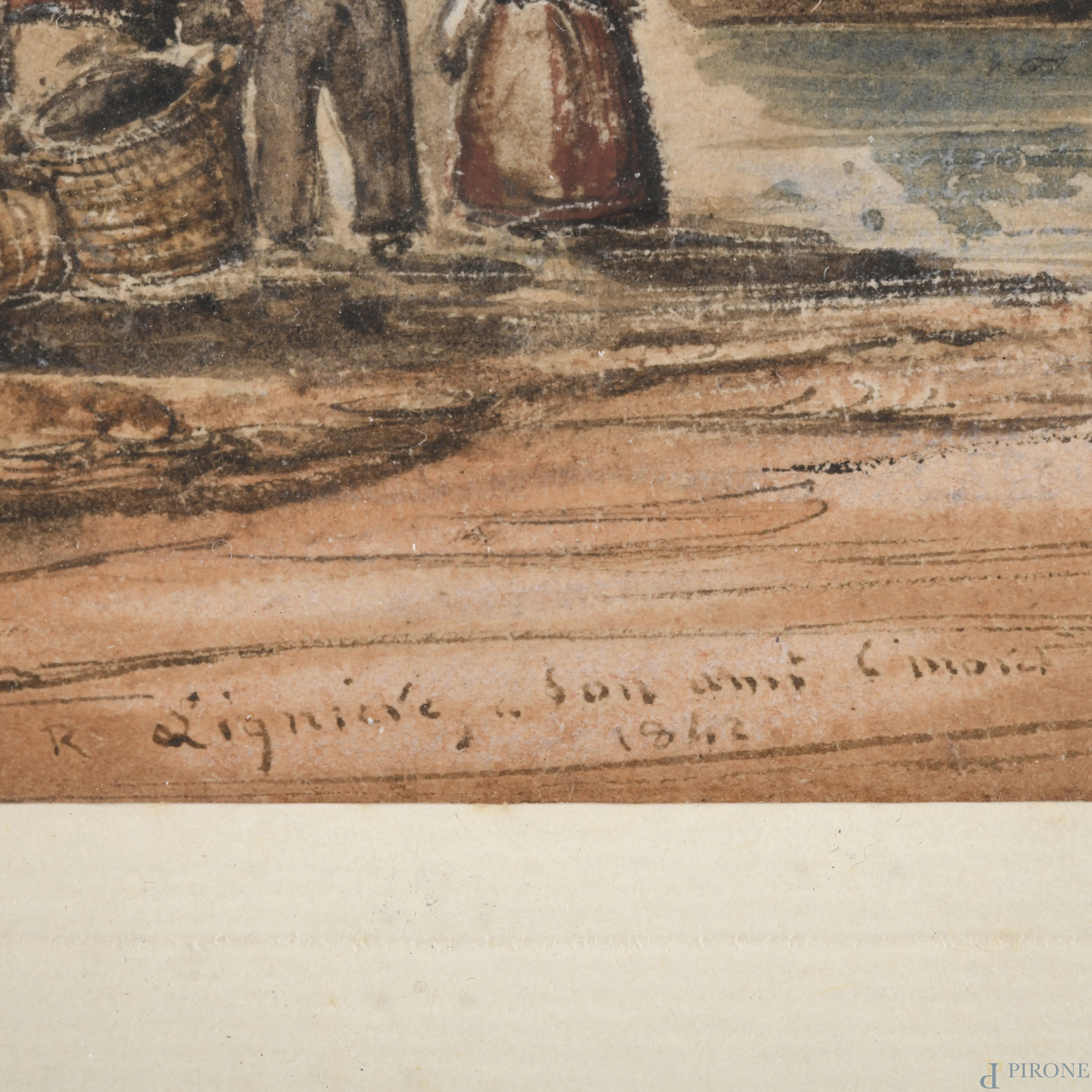 Ritorno dei pescatori, XX secolo, stampa ritoccata, cm 13,5x22,5, entro cornice, (gore, foxing, bruniture, tracce di umidità, piegature)