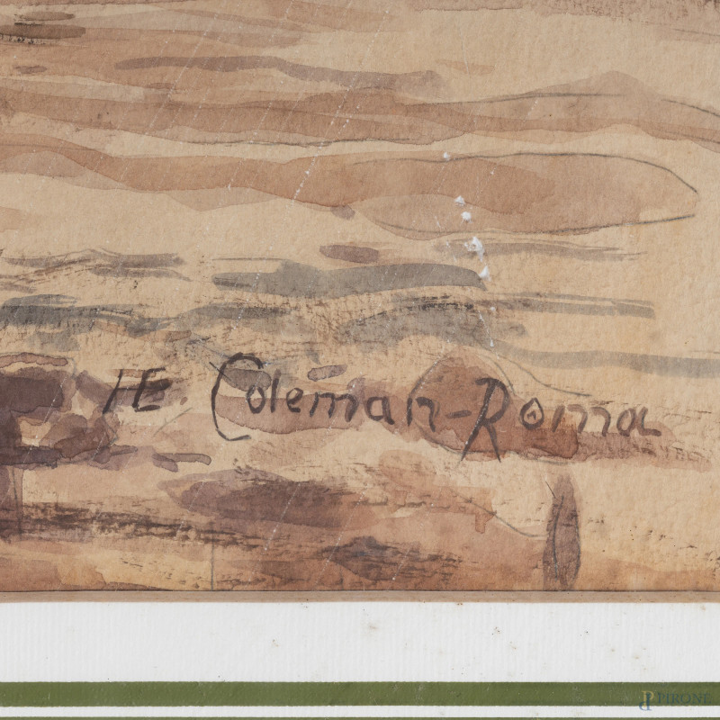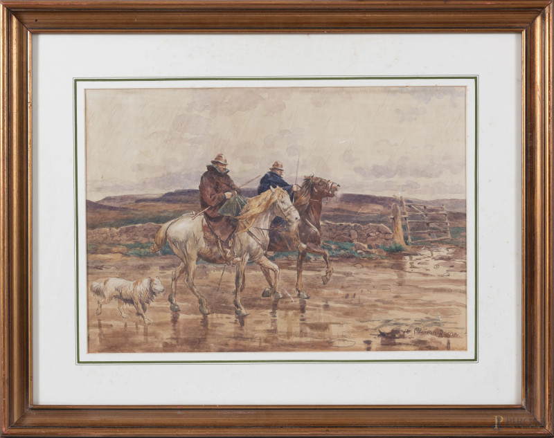 Ritorno uggioso, XX secolo, acquerello su carta, cm 37x54, firmato in basso a destra, entro cornice, (ondulazioni della carta)