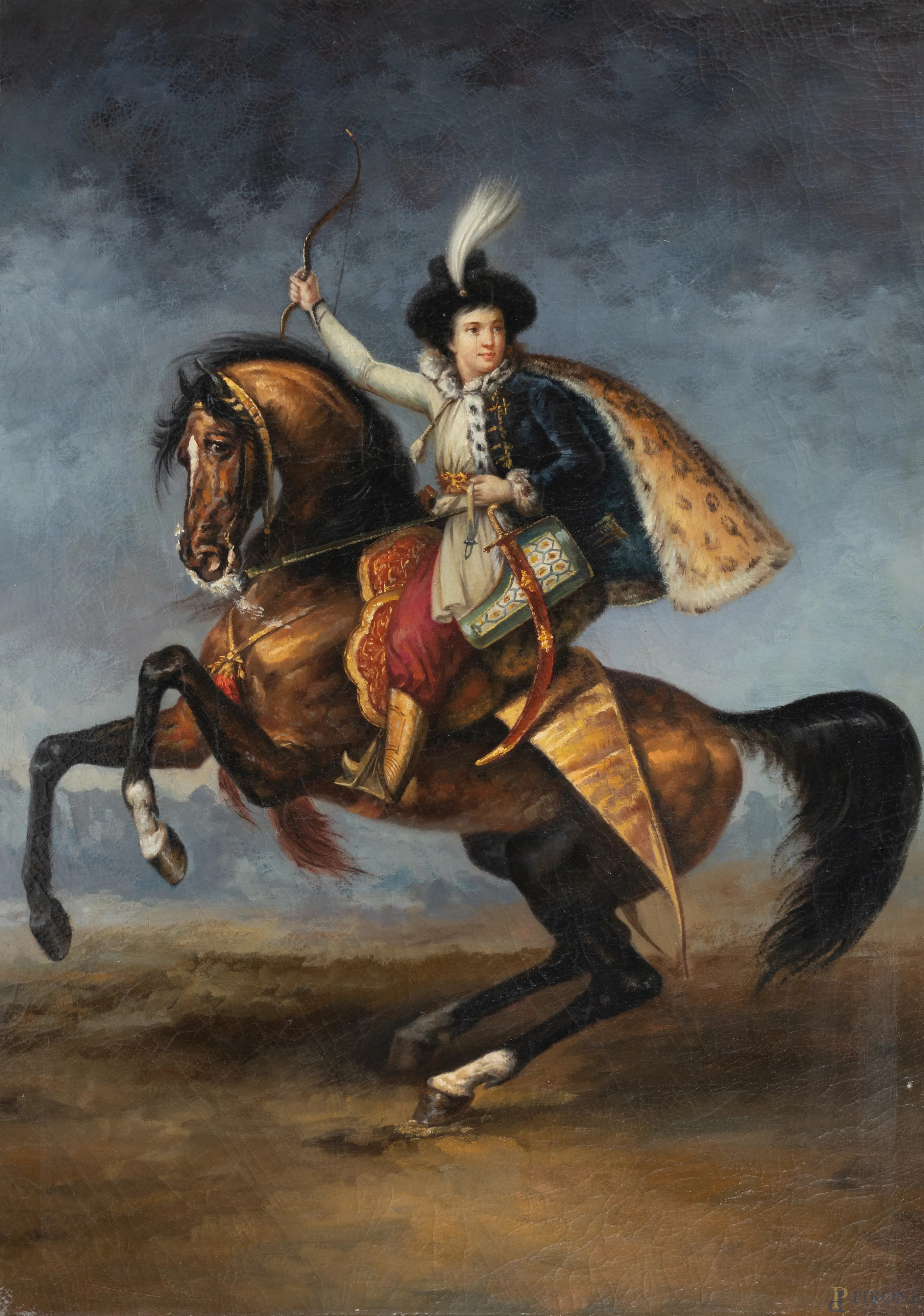 Ritratto di Boris Ysupov, copia da Antoine Jean Gros, XX secolo, stampa ritoccata su tela, cm 100,5x70, (difetti)