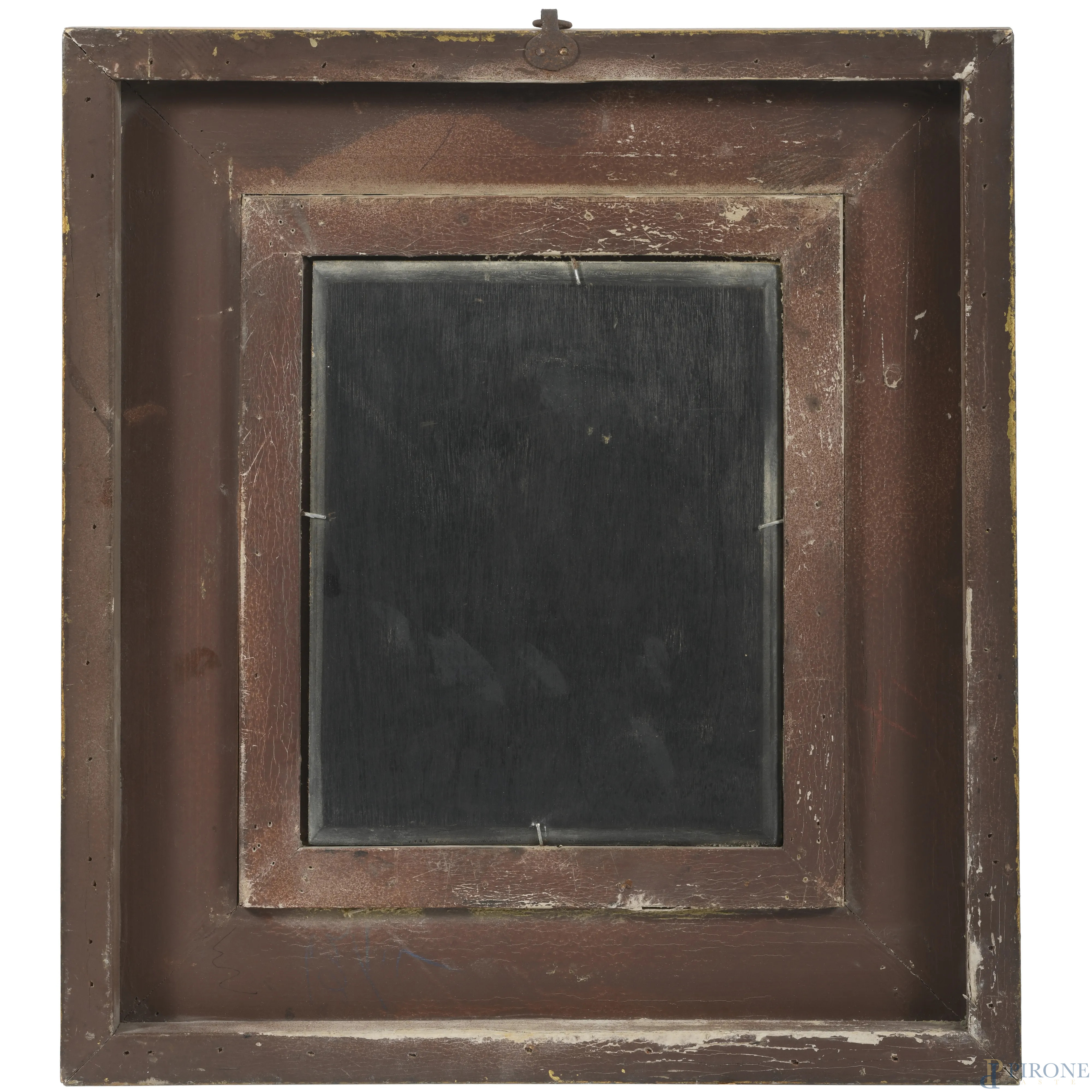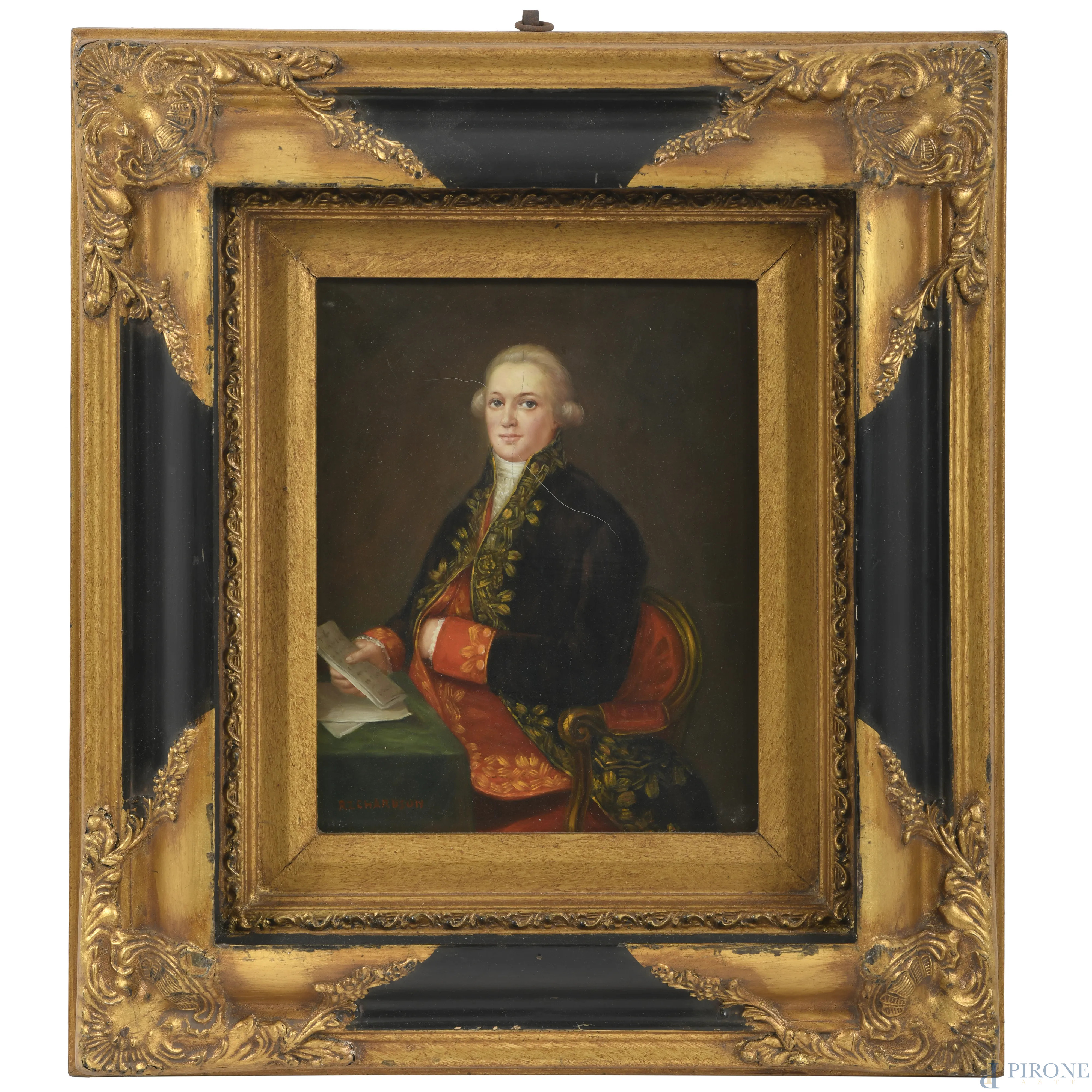 Ritratto di nobiluomo, XX secolo, olio su tavoletta, cm 25x20, firmato in basso a sinistra, entro cornice, (graffi della superficie)