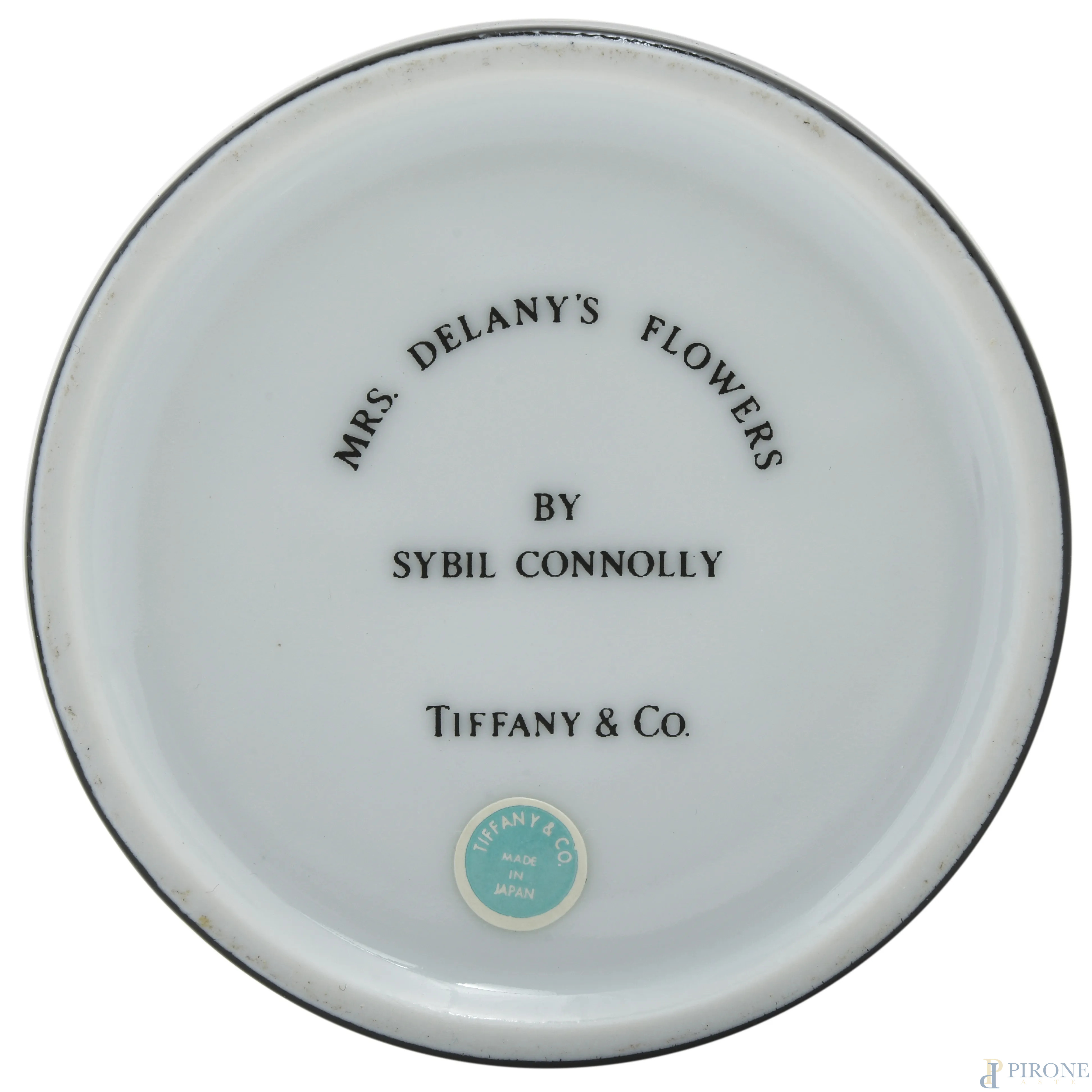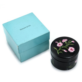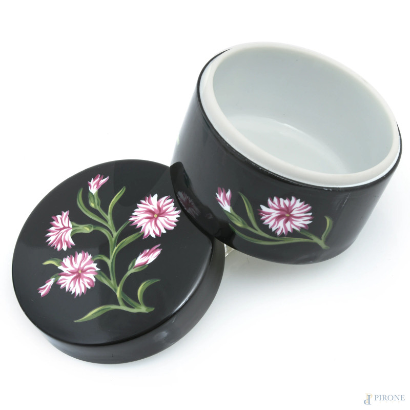 Scatolina in porcellana smaltata a fondo nero con decoro floreale Tiffany by Sybil Connolly, cm 6x8, (segni di usura)