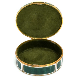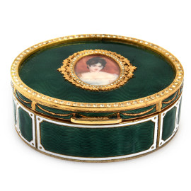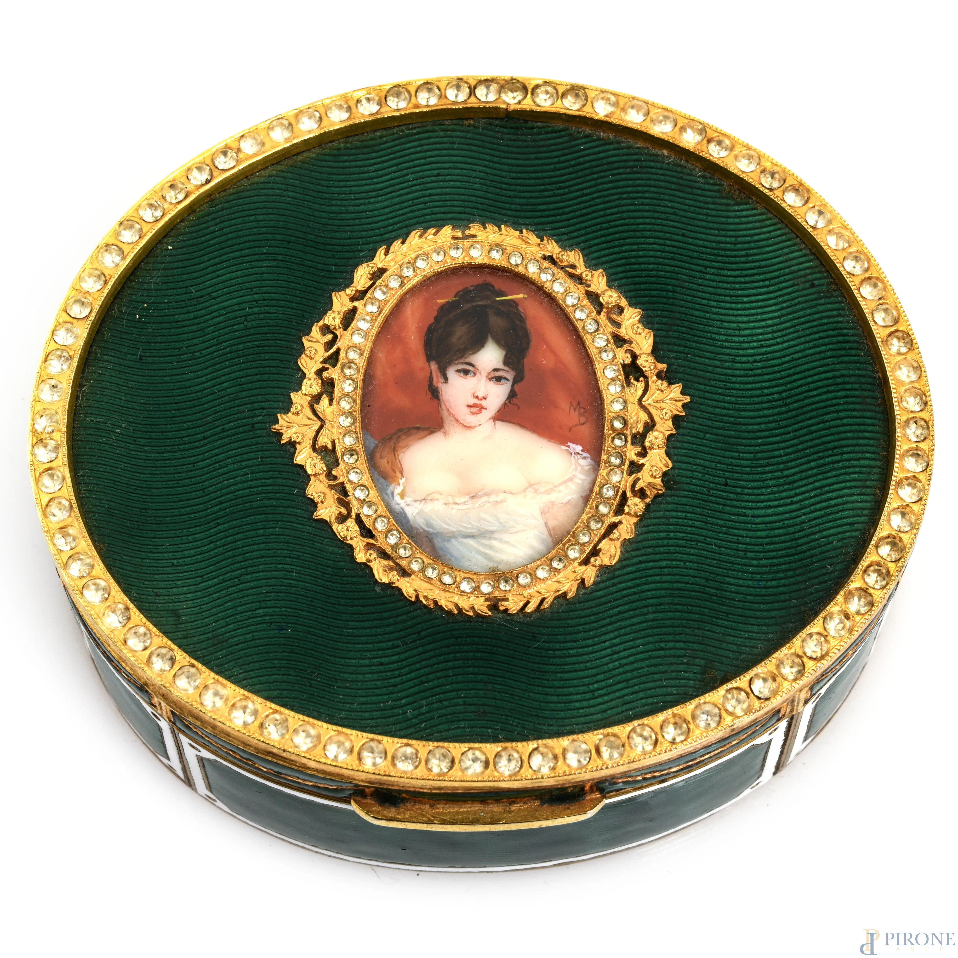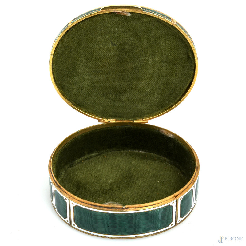 Scatolina portagioie in metallo dorato e smalto verde. Al coperchio miniatura raffigurante gentildonna, XX secolo, cm 3,5x7,5x8,5, (segni di usura)