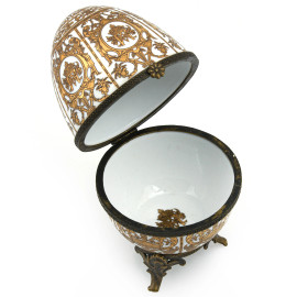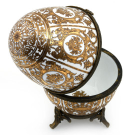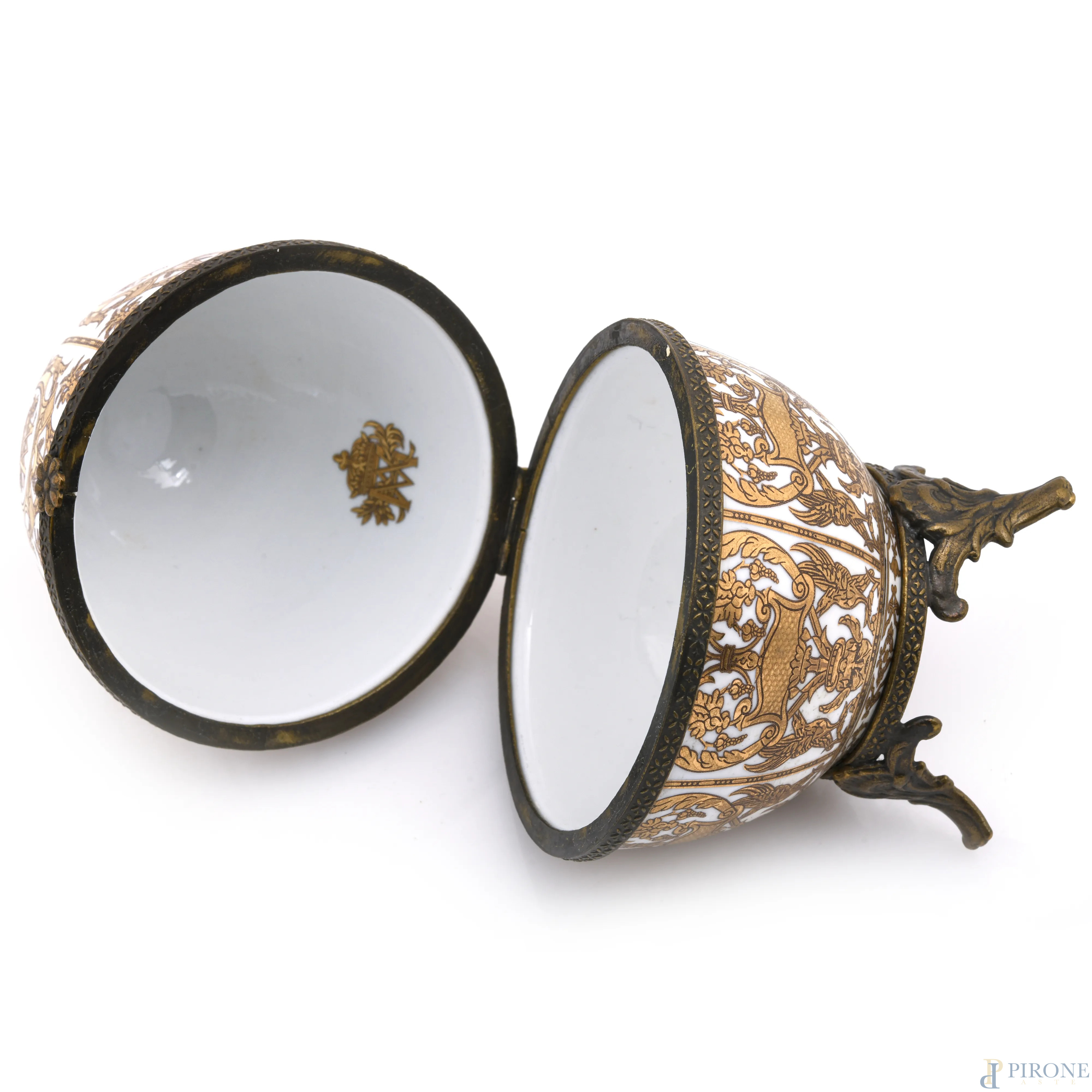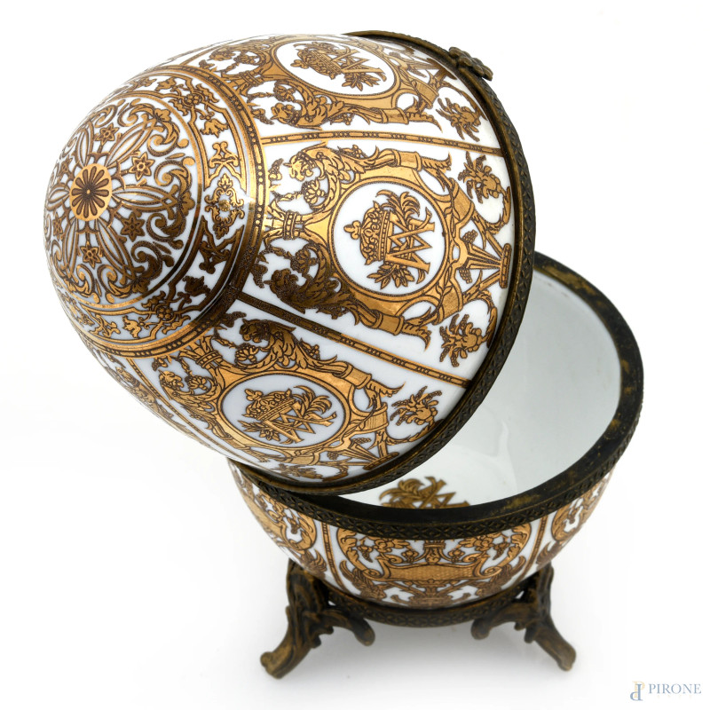 Scrigno a foggia di uovo stile Faberge in porcellana Royal Family bianca-oro con rifiniture e supporto in metallo dorato, XX secolo, altezza cm 15, (lievi segni di usura)