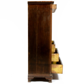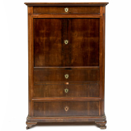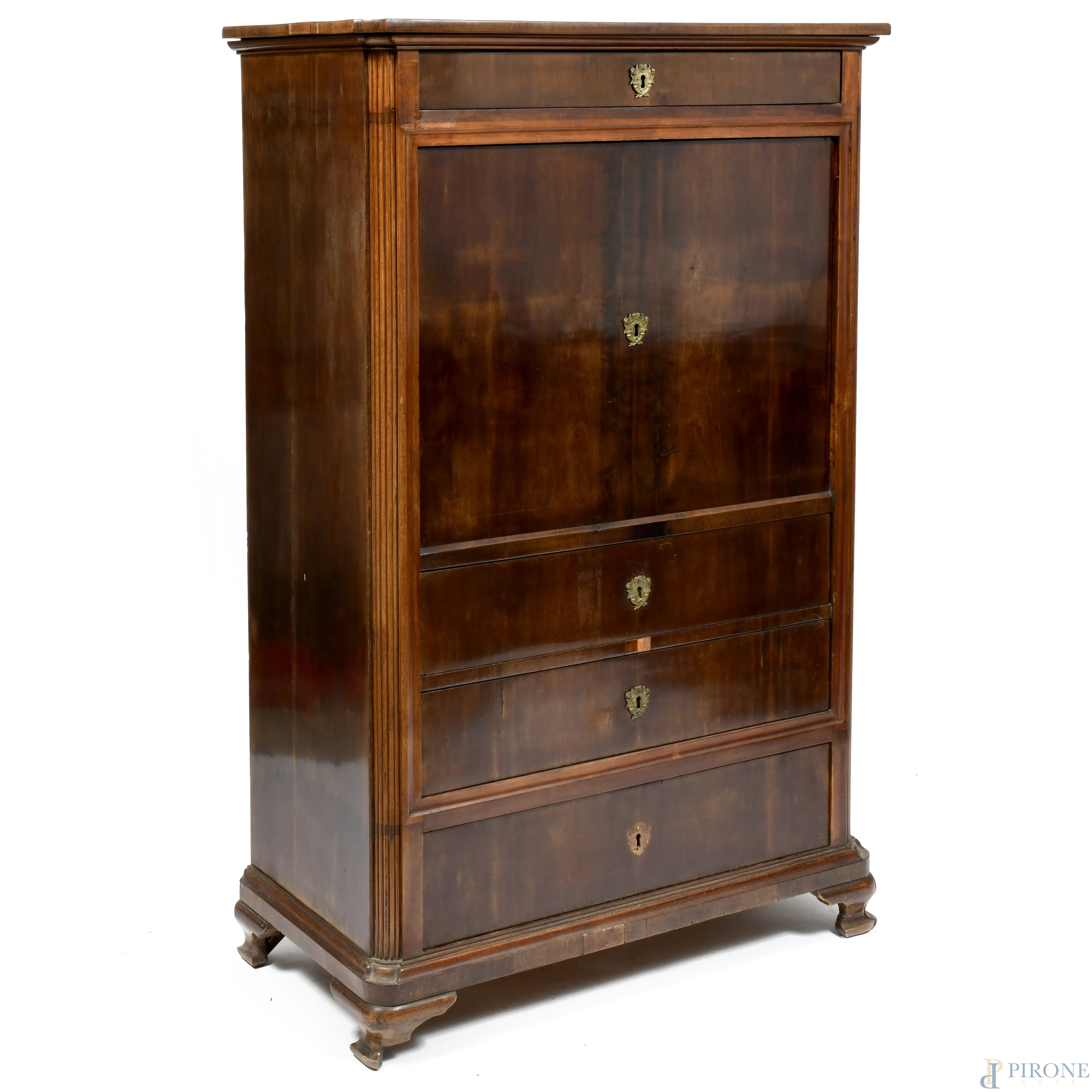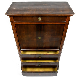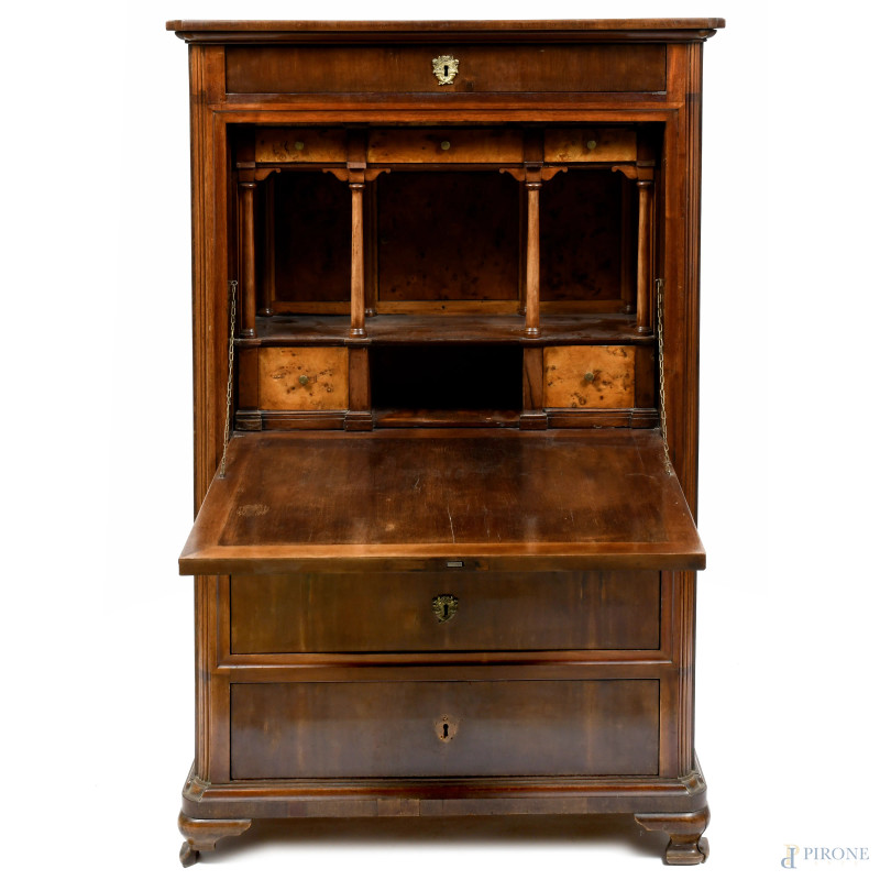 Fronte con piano a ribalta celante piano scrittoio e vani e segreti intervallati da colonnine. Un cassetto superiore e cassetti inferiori.