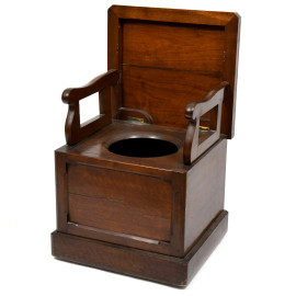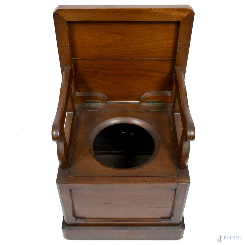 Sedia toilette in noce con schienale richiudibile, XX secolo, misure aperto cm 92,5x50,5x55,5, misure chiuso cm 49,5x51,5x55, (segni di usura, difetti)