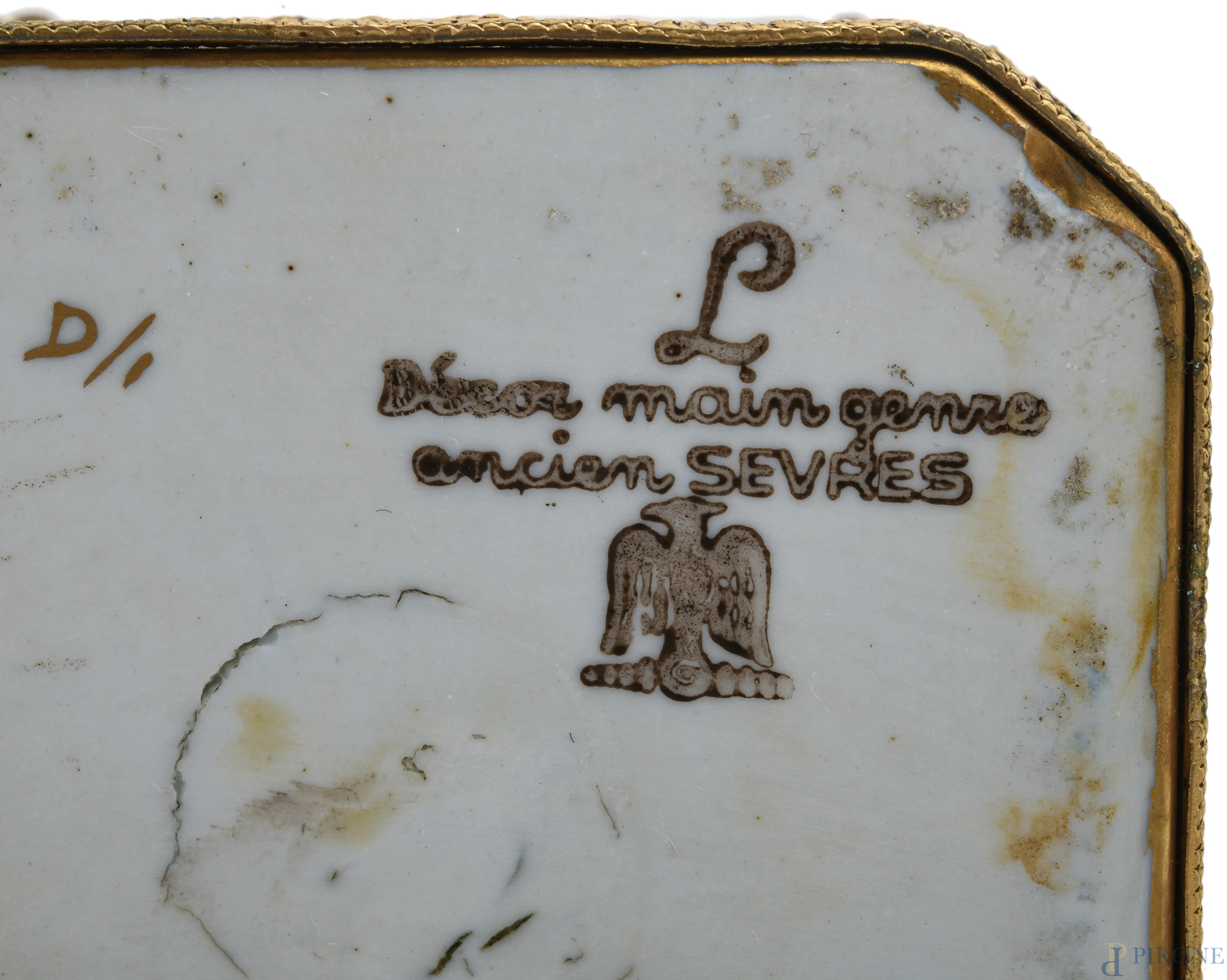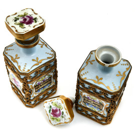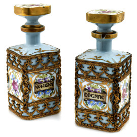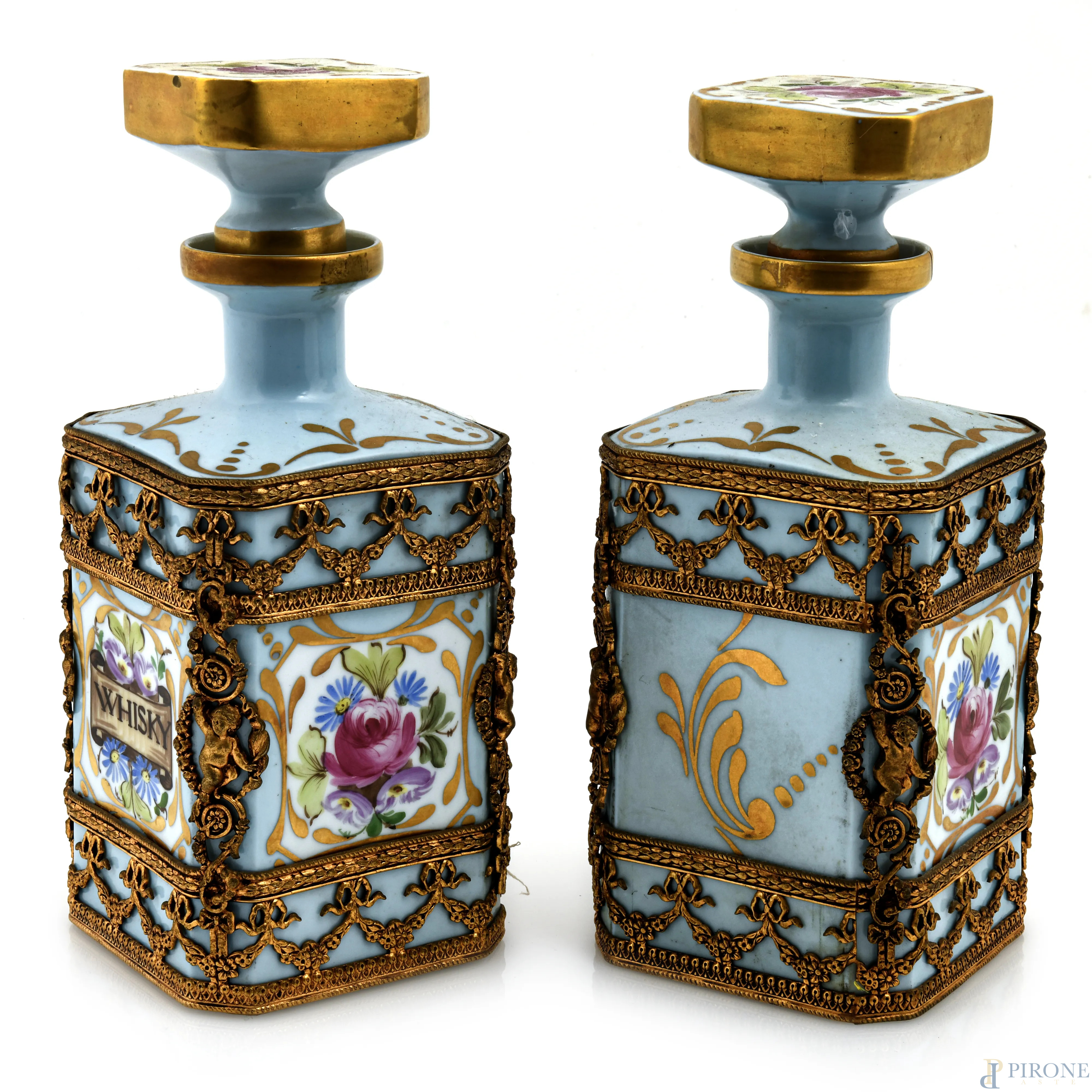 Servizio composto da due bottiglie in porcellana Sevres decorata a motivi floreali policromi con fondo oro e azzurro con inserti in metallo dorato, XX secolo, altezza cm 23, (segni di usura, sbeccature, rotture, cadute di smalto)