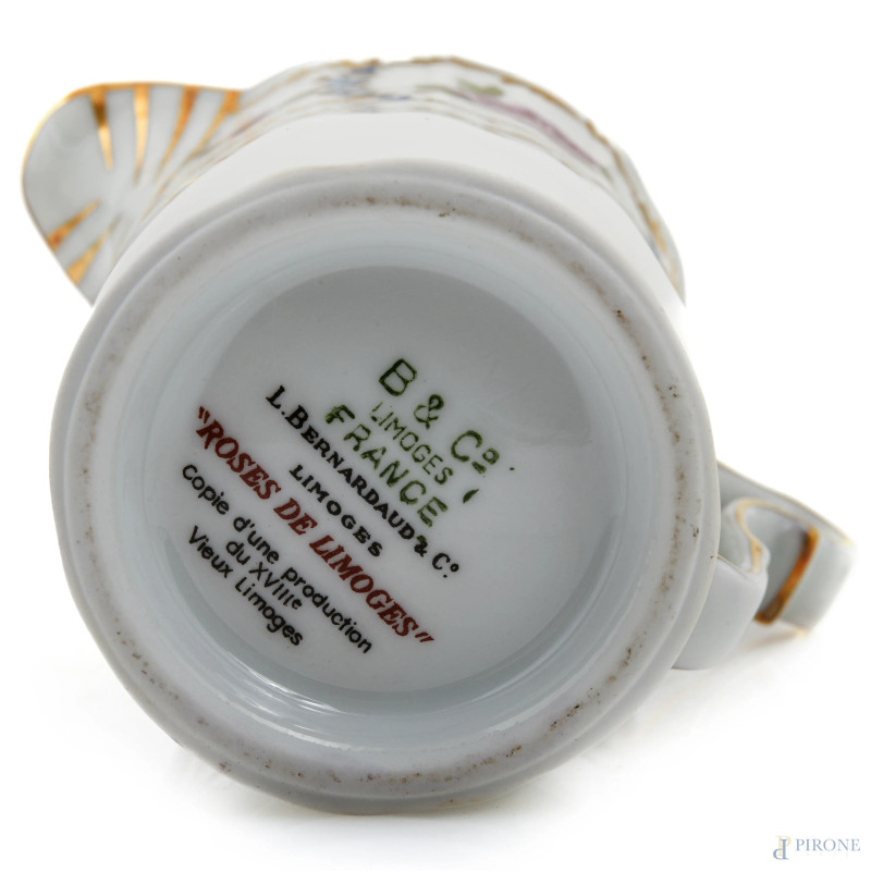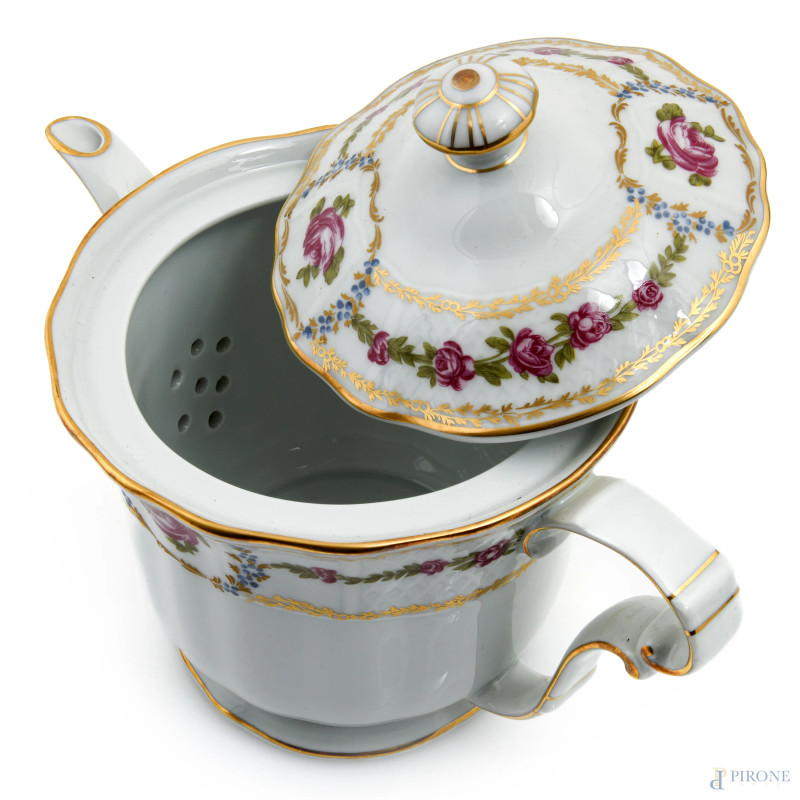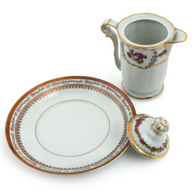Servizio da caffè e the in porcellana Limoges composto da teiera, lattiera, caffettiera e piattino, XX secolo, altezza massima cm 22,5, (segni di usura)