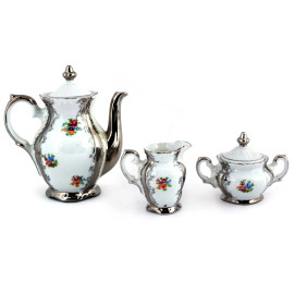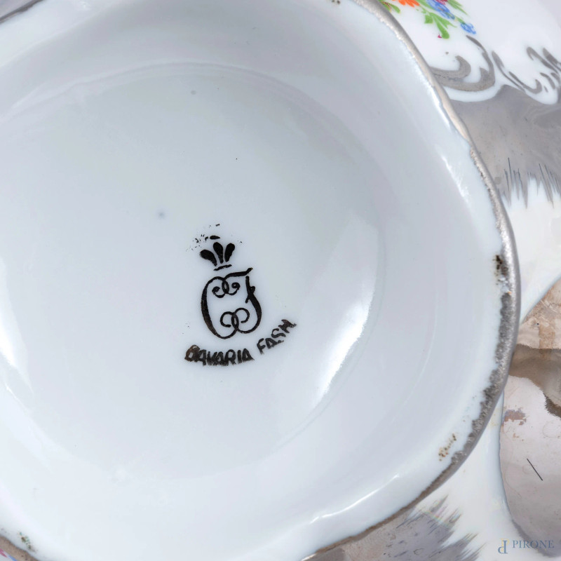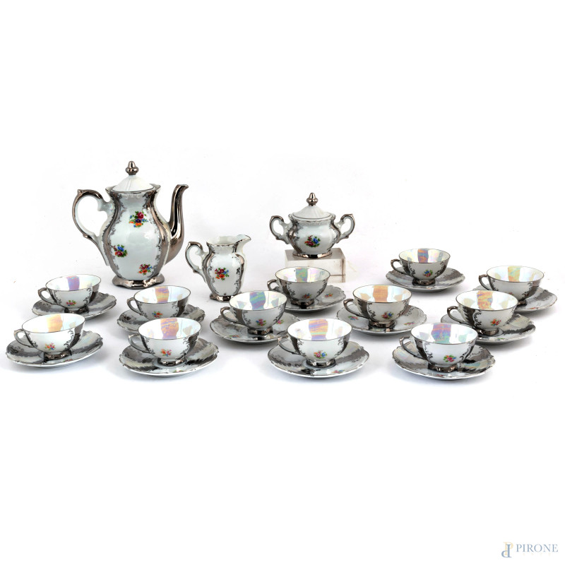 Servizio da caffè in porcellana Bavaria nei toni del bianco e dell'argento composto da una caffettiera, una zuccheriera, una lattiera, 12 tazzine e 12 piattini, altezza massima cm 19, (segni di usura, scoloriture, sbeccature, difetti)