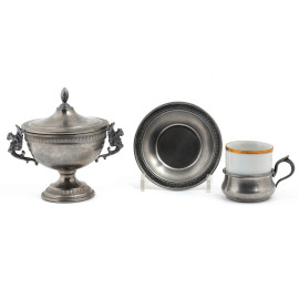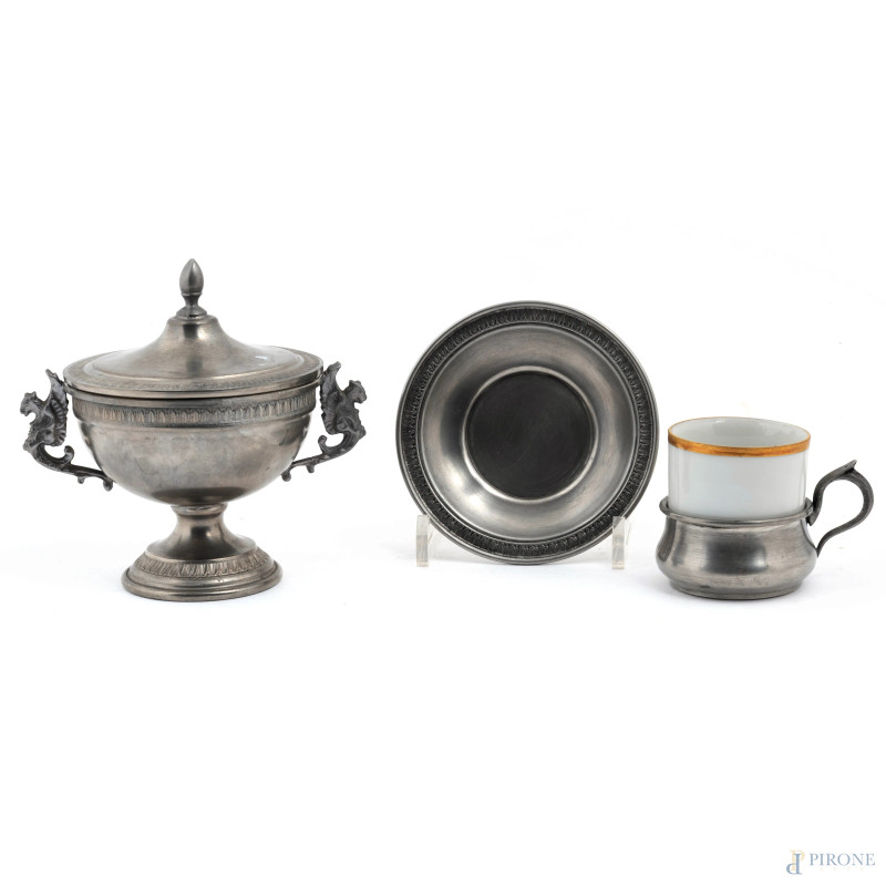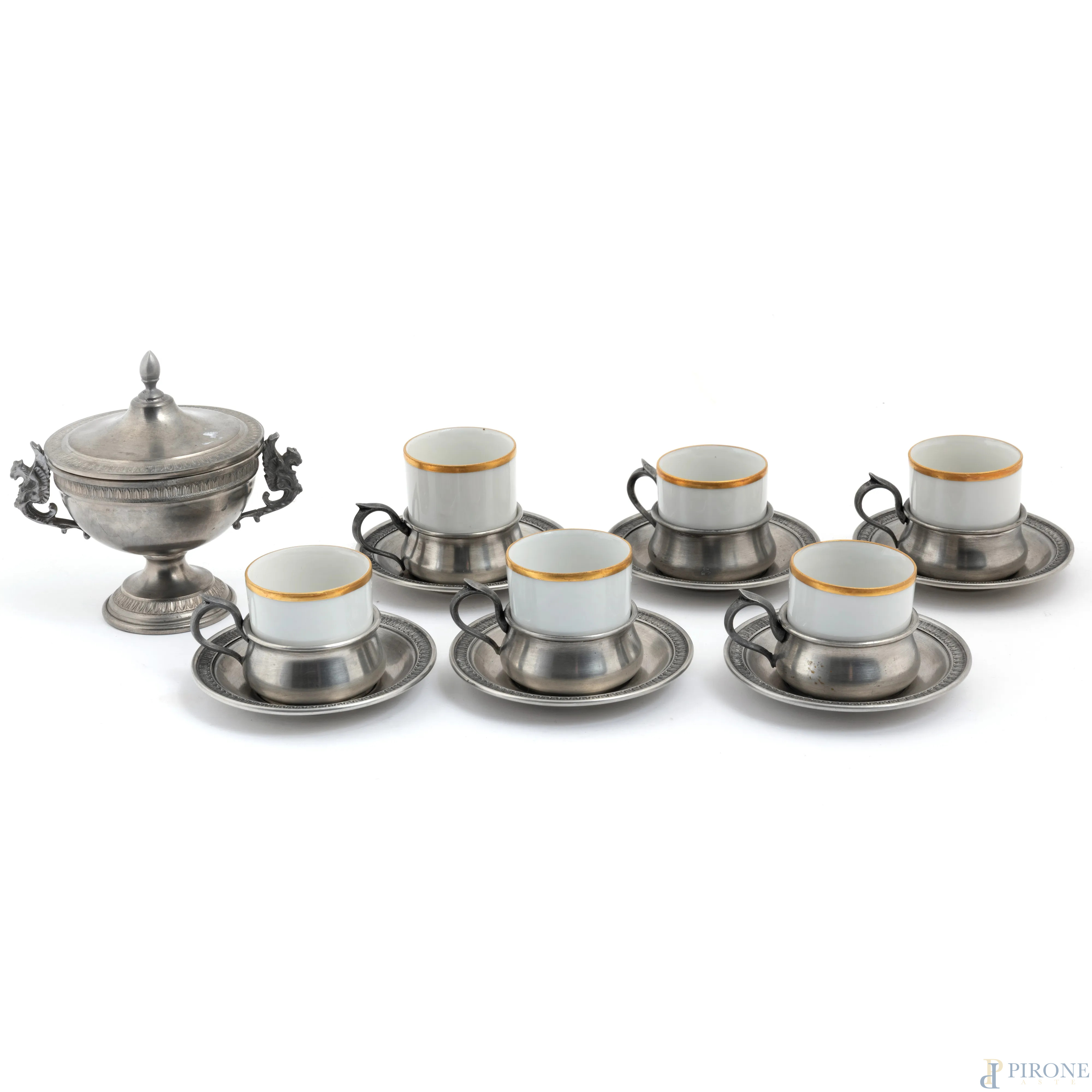 Servizio da caffè in porcellana e peltro composto da zuccheriera, 6 tazzine, 6 portatazzine e 6 piattini, XX secolo, altezza massima 5,5, diametro cm 10, (segni di usura, difetti)