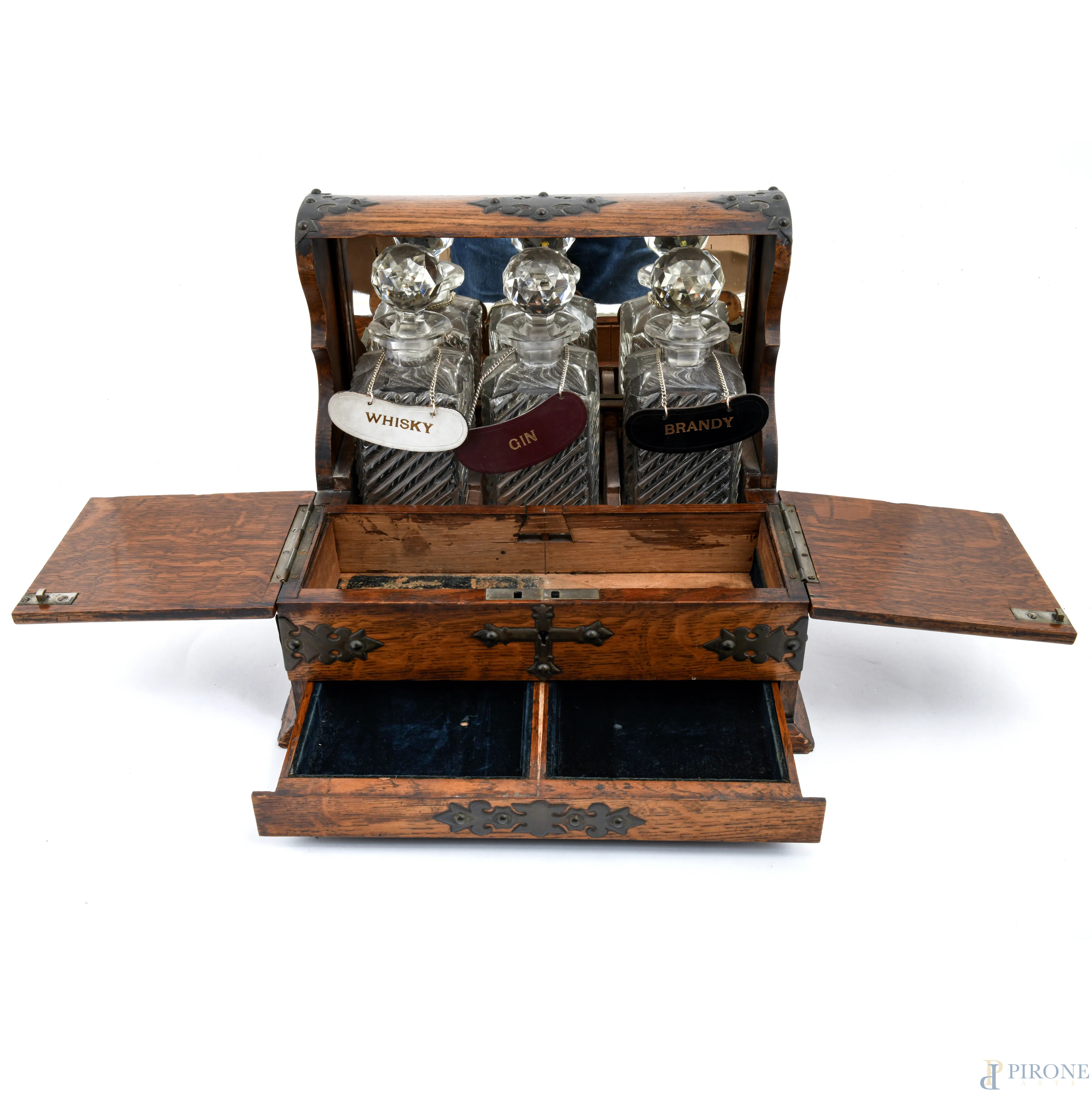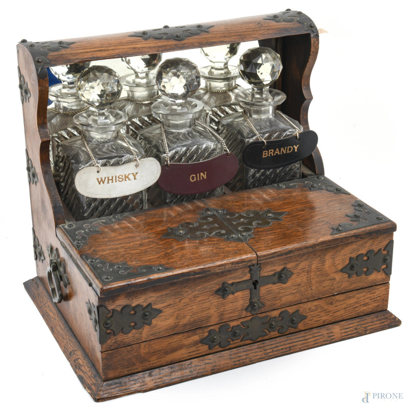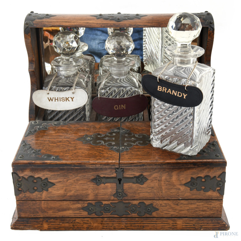 Servizio da liquore con struttura in rovere con inserti in metallo a doppia anta celante vano, un cassettino e fondo specchiato. Completo di tre bottiglie in cristallo, XX secolo, misure complessive della struttura cm 32x27x37, (segni di usura, difetti, s