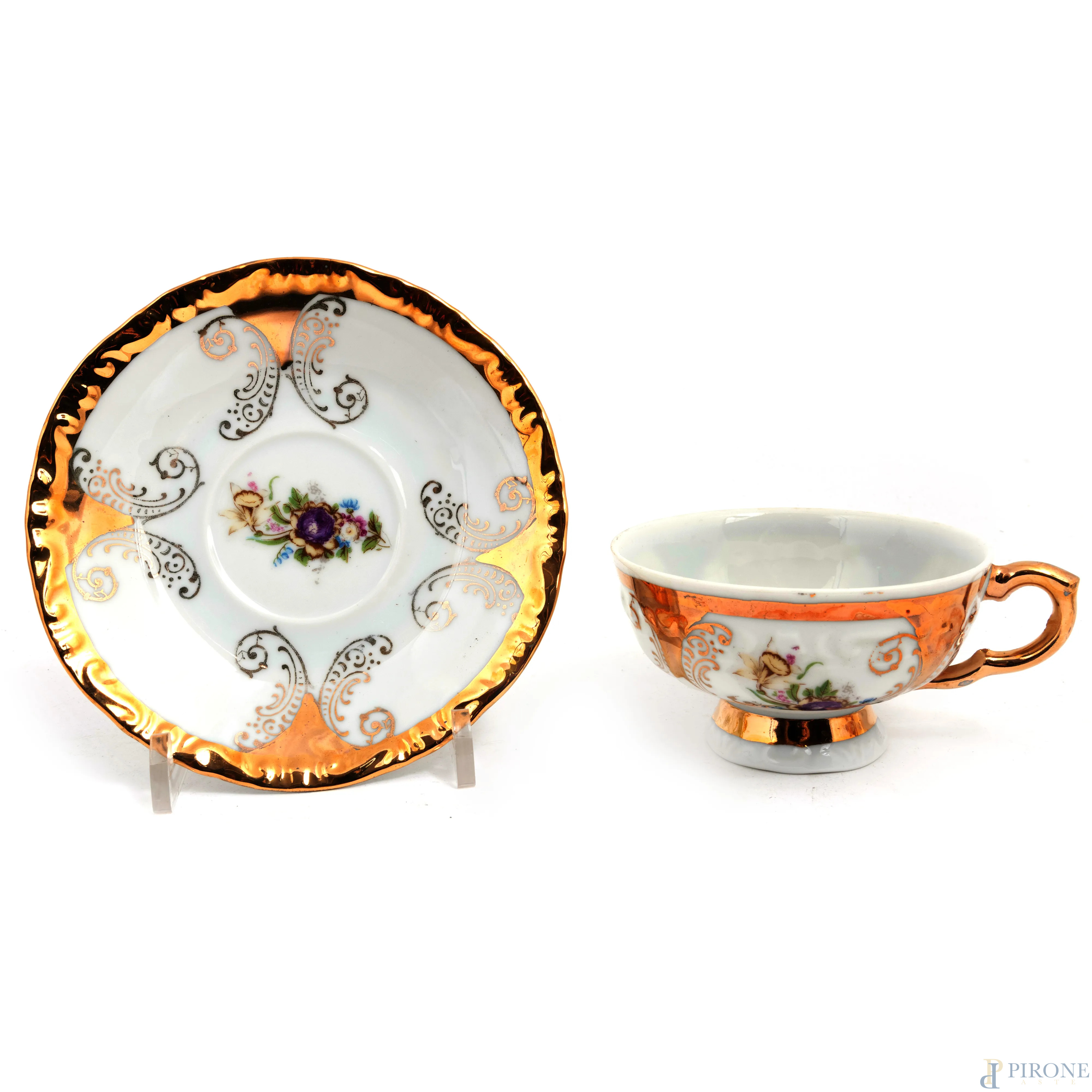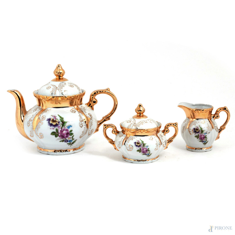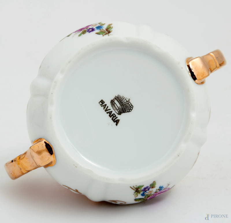 Servizio da the in porcellana Bavaria a fondo bianco con profili oro e decori floreali composta da 12 tazze, 12 piattini, zuccheriera, lattiera, teiera, XX secolo, misure massime altezza cm 18, (segni di usura, lievi scalfiture)
