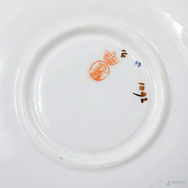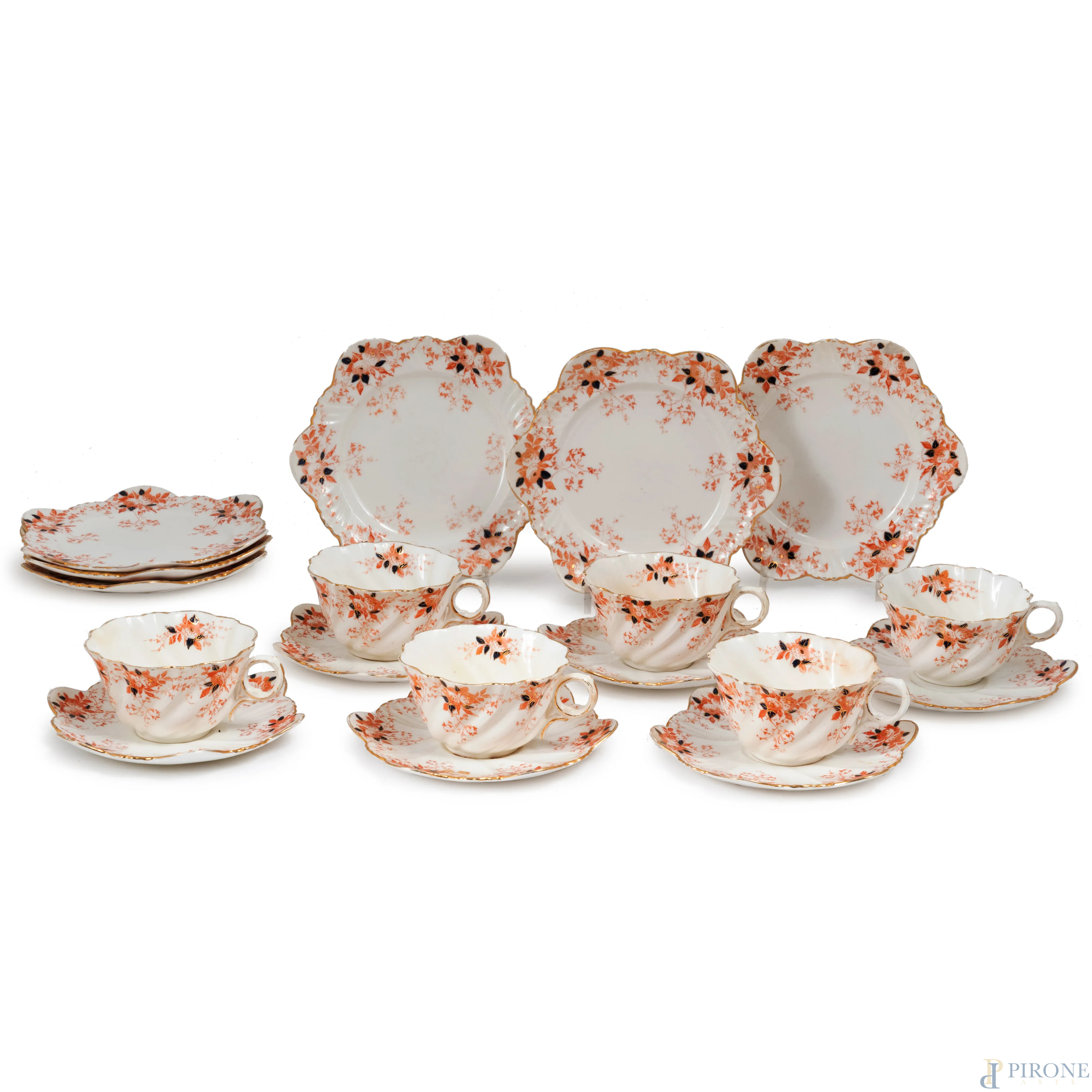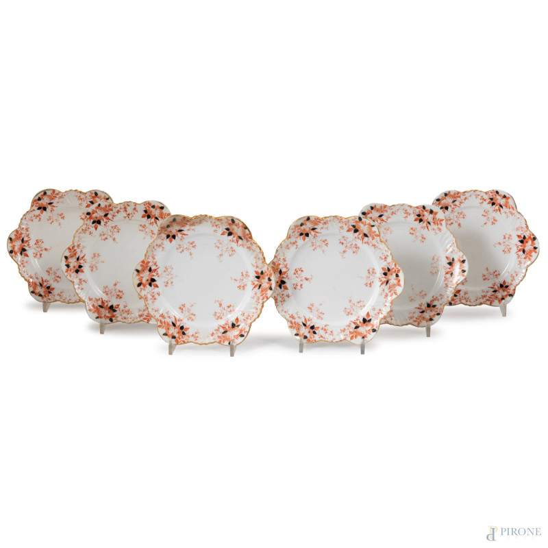 Servizio da the in porcellana inglese composto da 6 tazzine, 6 piattini e 4 piattini da dolce, altezza massima cm 5, diametro massimo cm 18, (segni di usura)