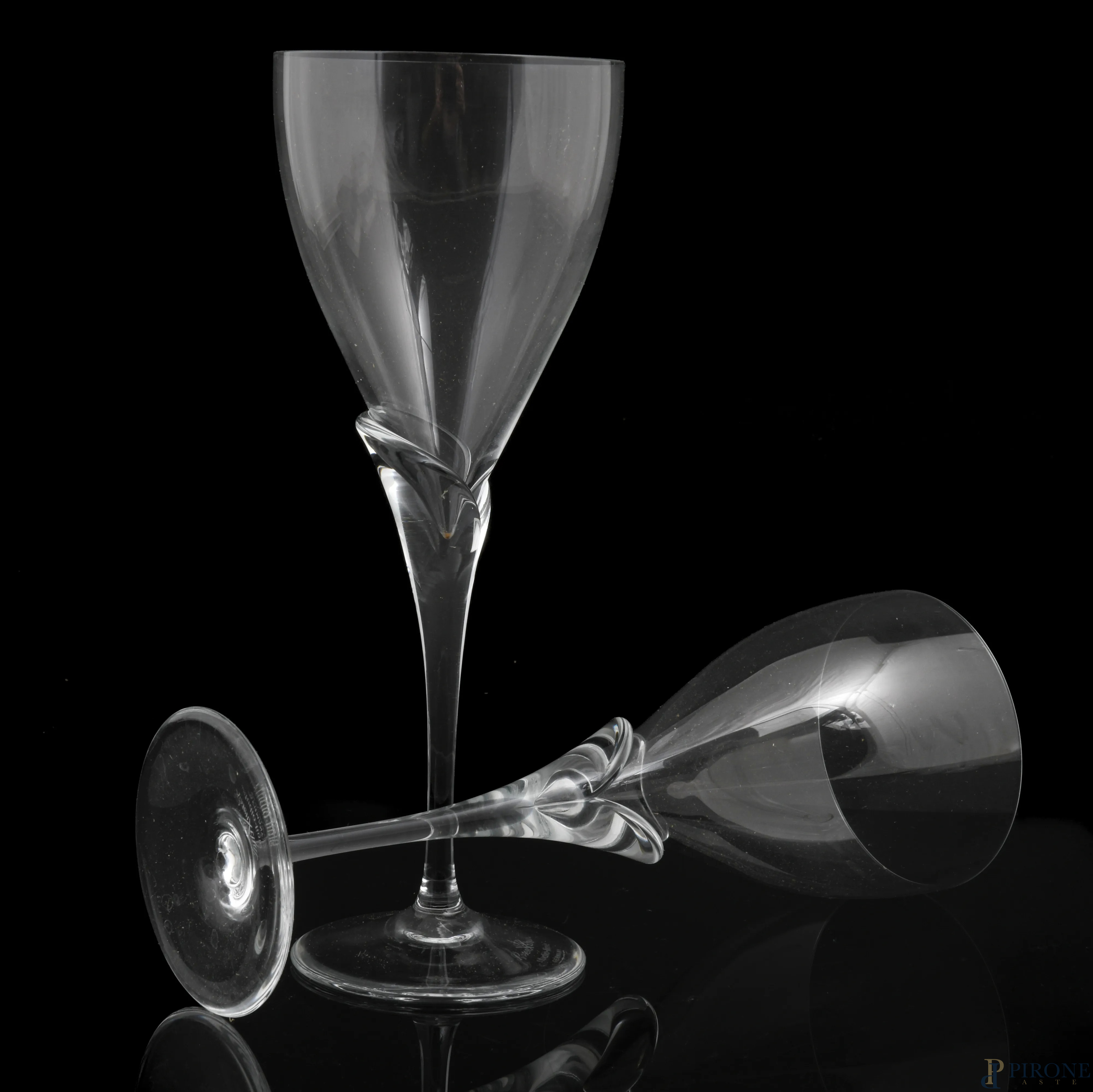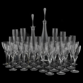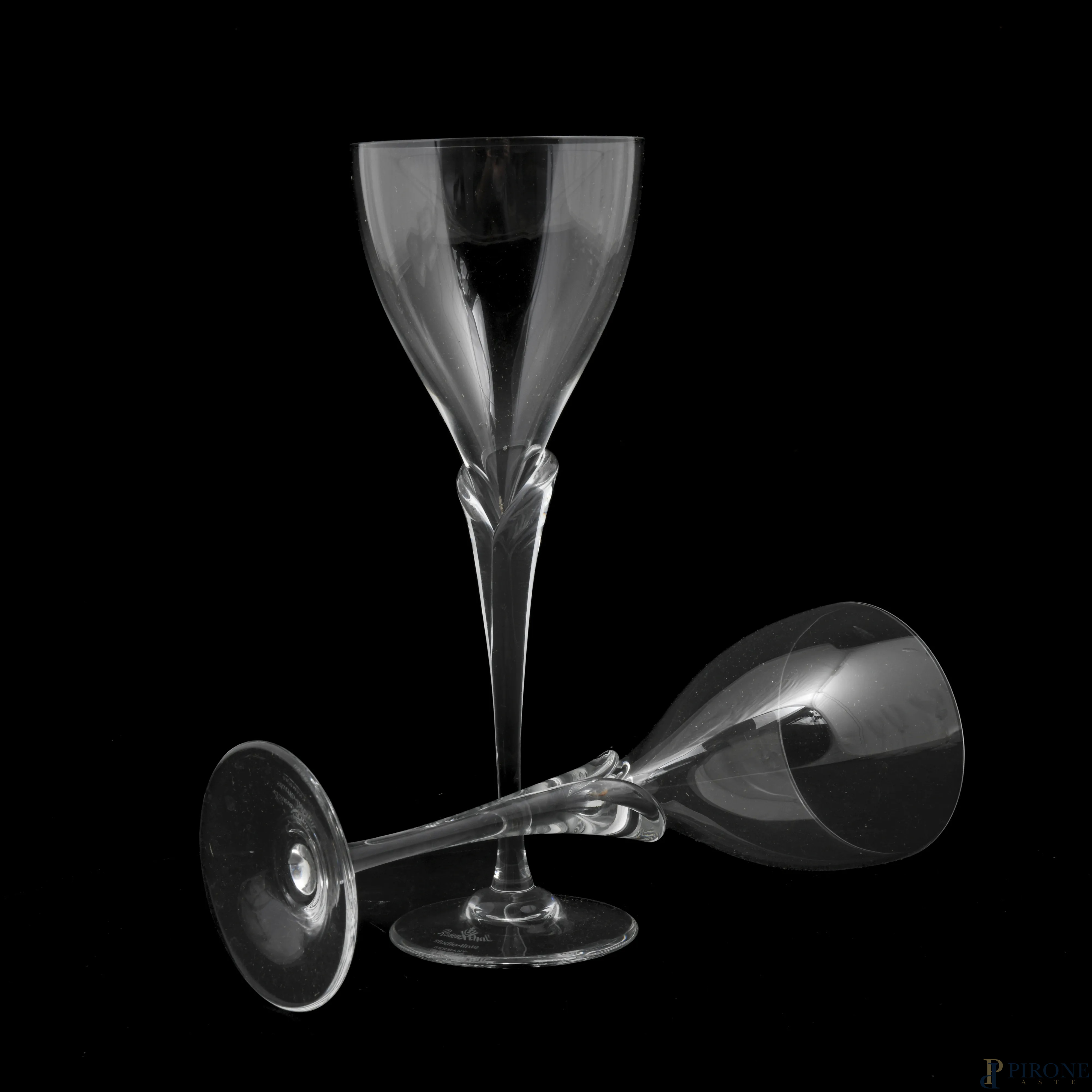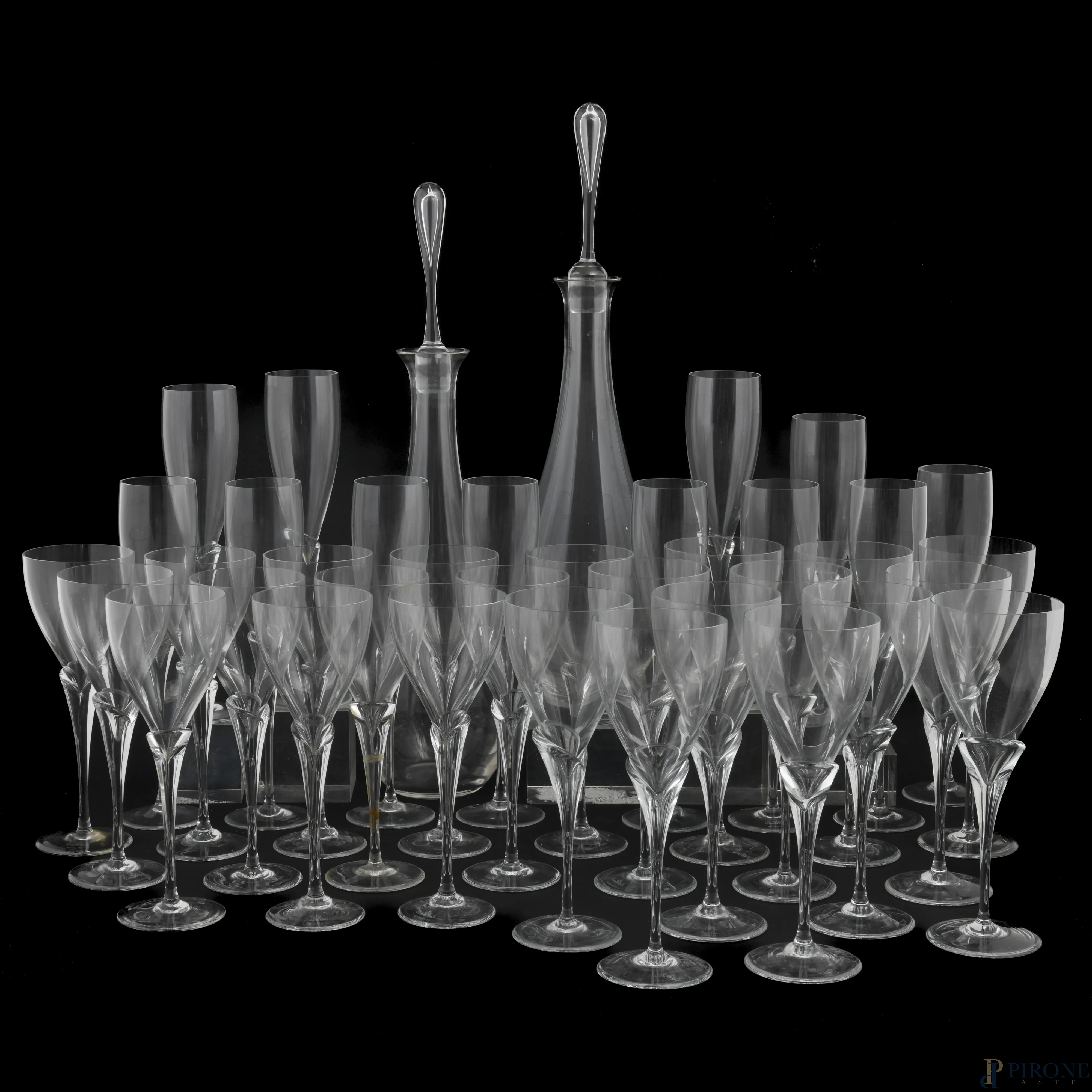 Servizio di bicchieri Rosenthal in vetro trasparente composto da 12 calici da vino rosso e 12 calici da vino bianco, 12 flutes e da coppia di bottiglie in vetro trasparente, XX secolo, altezza massima cm 45,5, (segni di usura)