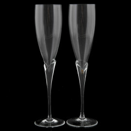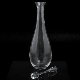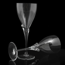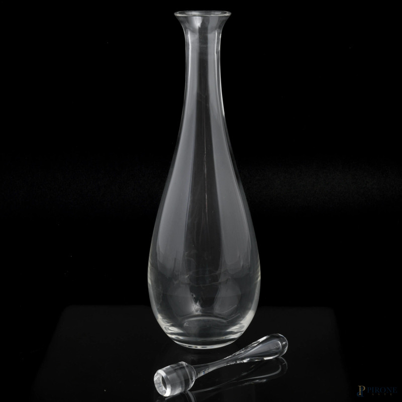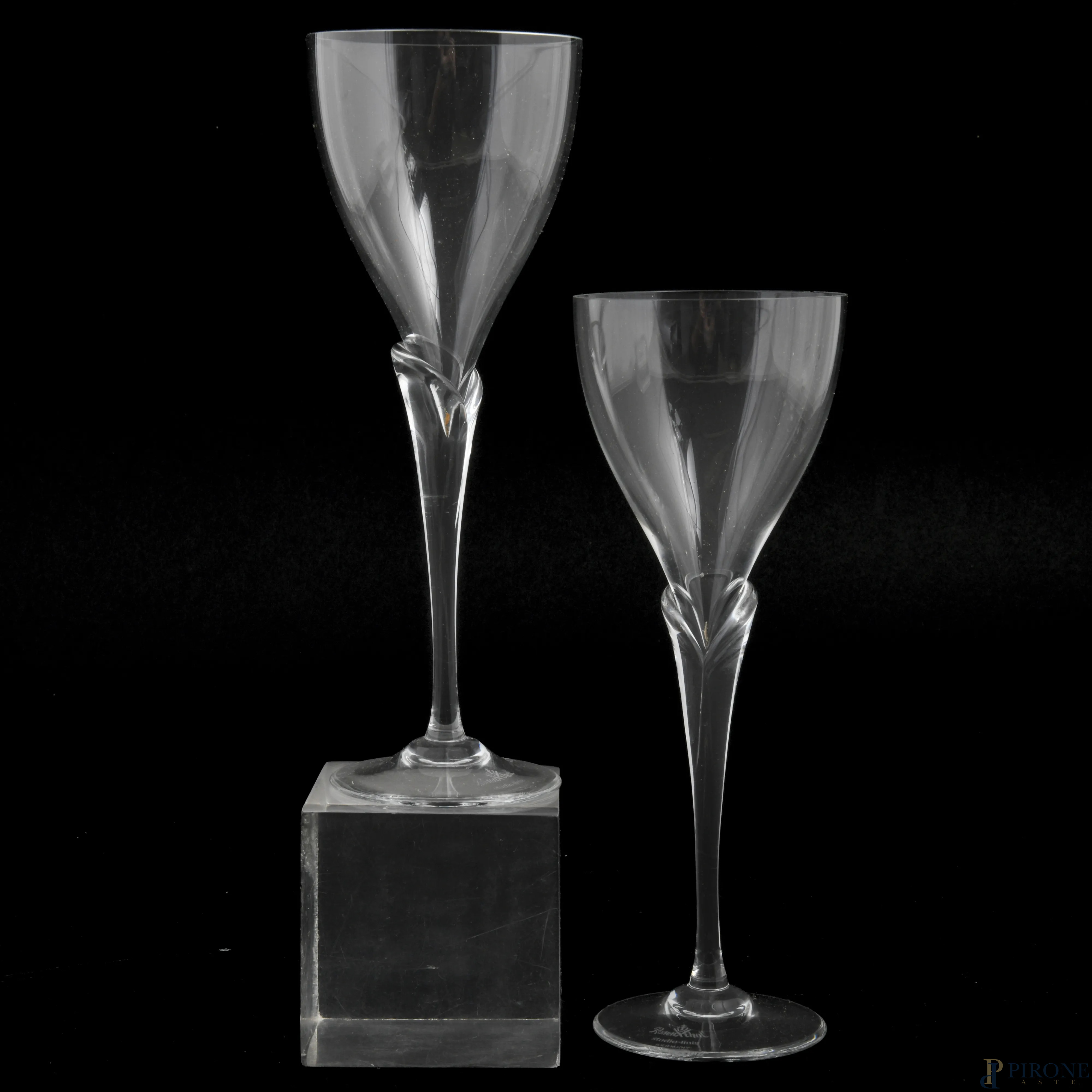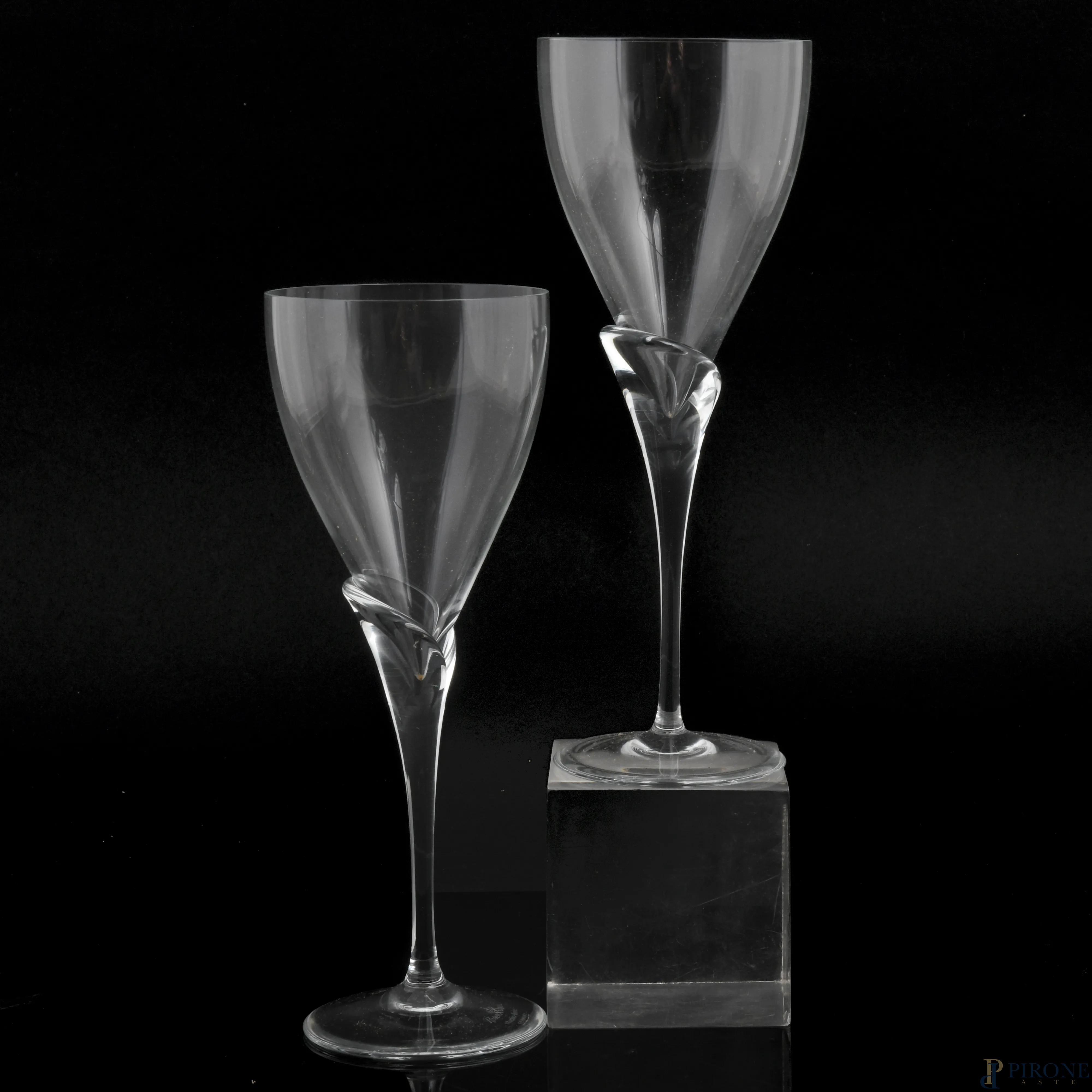 Servizio di bicchieri Rosenthal in vetro trasparente composto da 12 calici da vino rosso e 12 calici da vino bianco, 12 flutes e da coppia di bottiglie in vetro trasparente, XX secolo, altezza massima cm 45,5, (segni di usura)