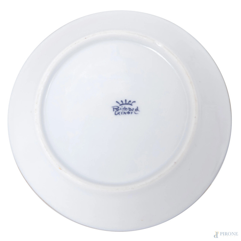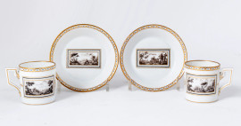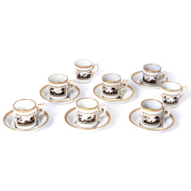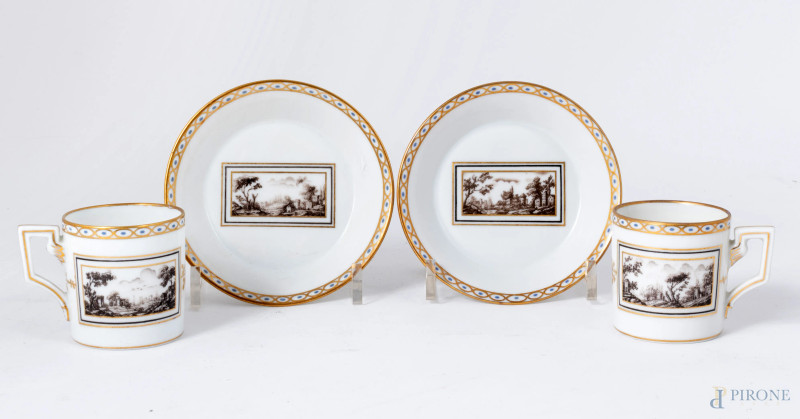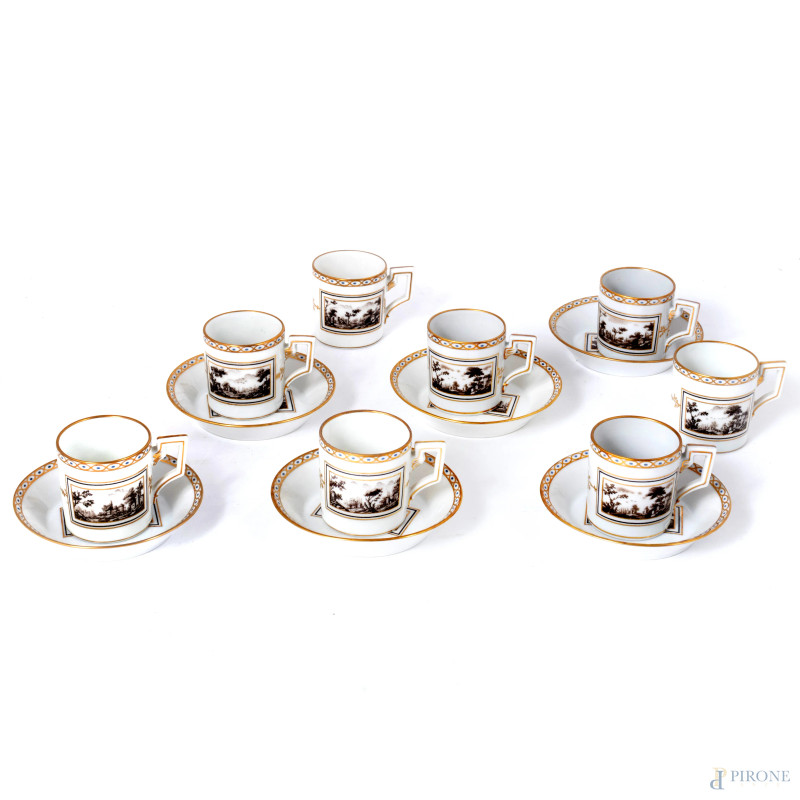 Servizio in porcellana Ginori con decori a paesaggio composto da otto tazzine e sei piattini, XX secolo, altezza massima cm 5,5, (segni di usura)