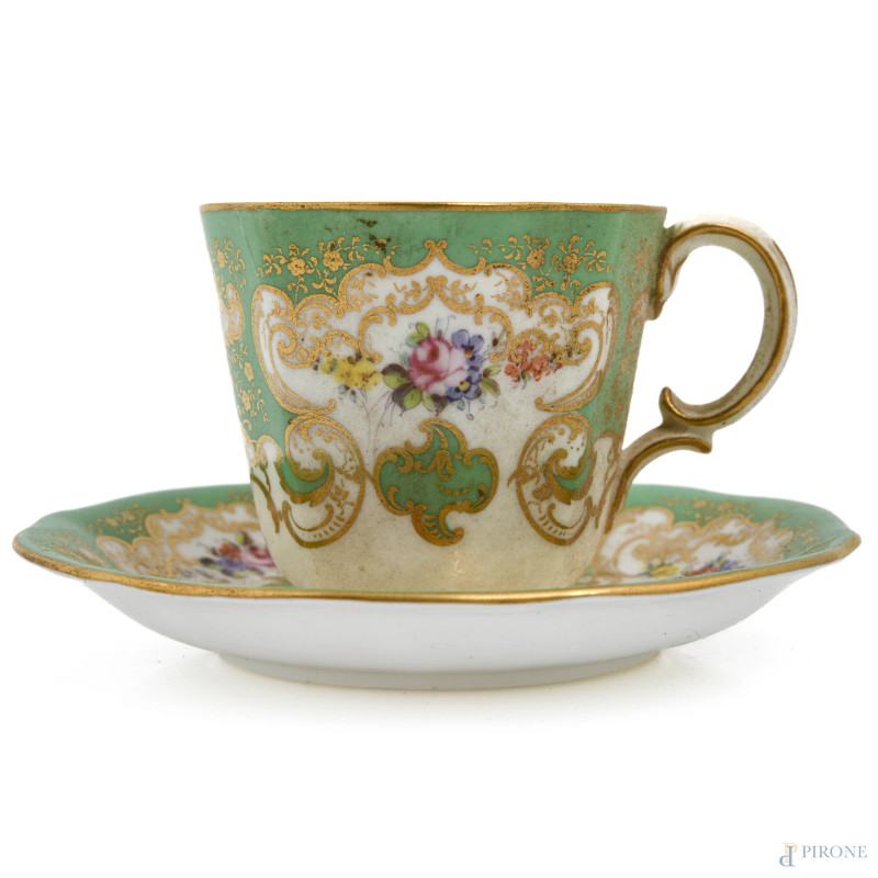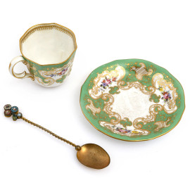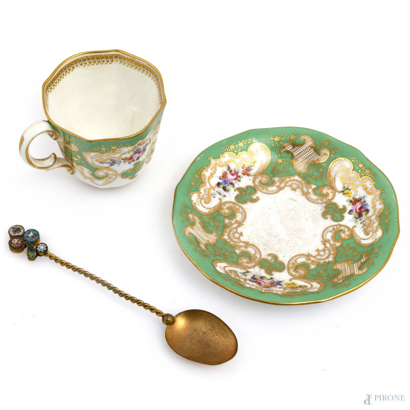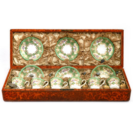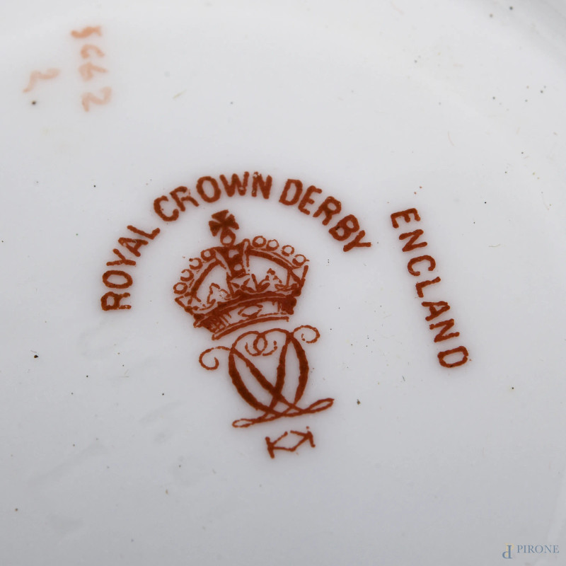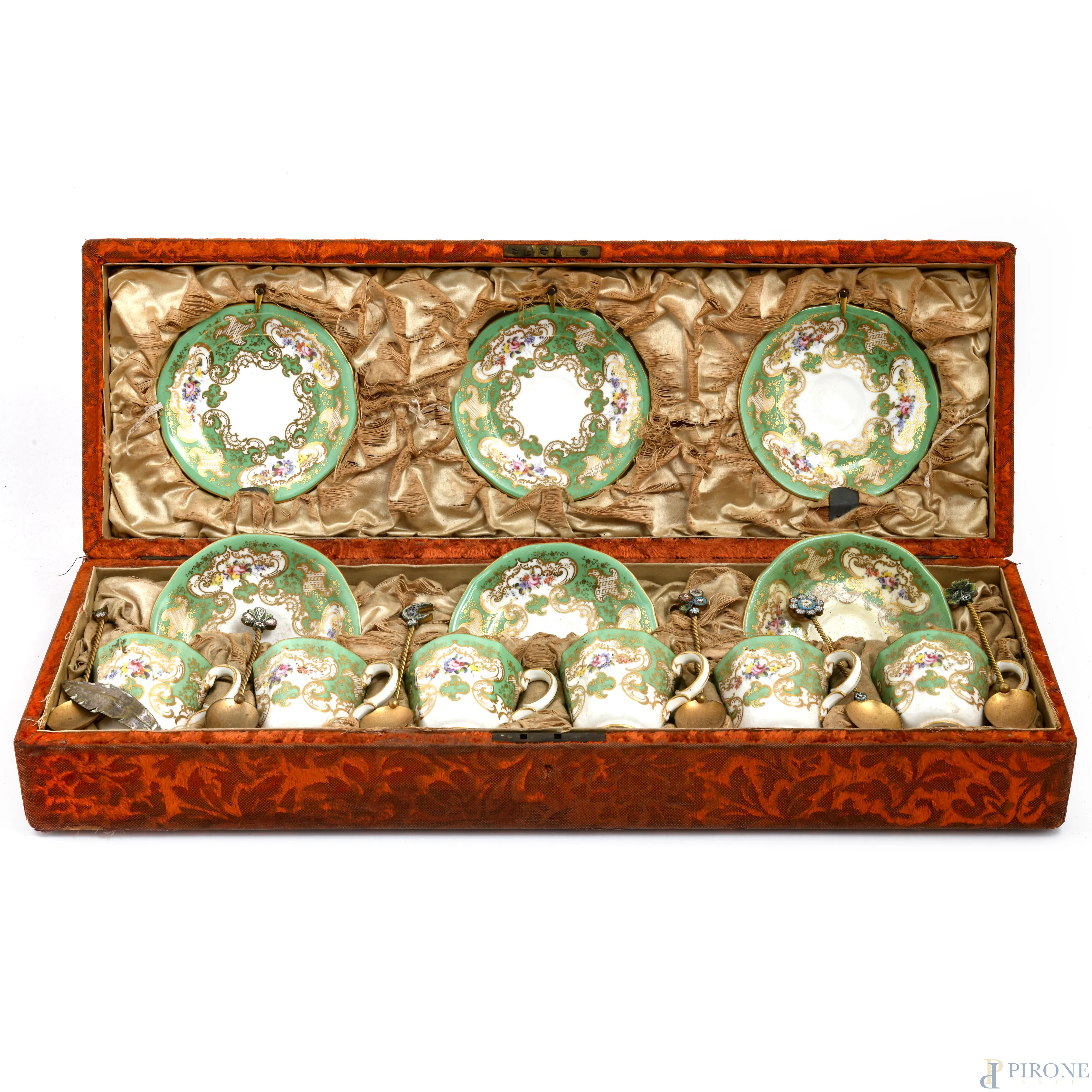 Servizio Royal Crown Derby composto da sei piattini, sei tazzine in porcellana dipinta nei toni del bianco e del verde e sei cucchiaini in metallo dorato, entro cofanetto rivestito in tessuto rosso (segni di usura)