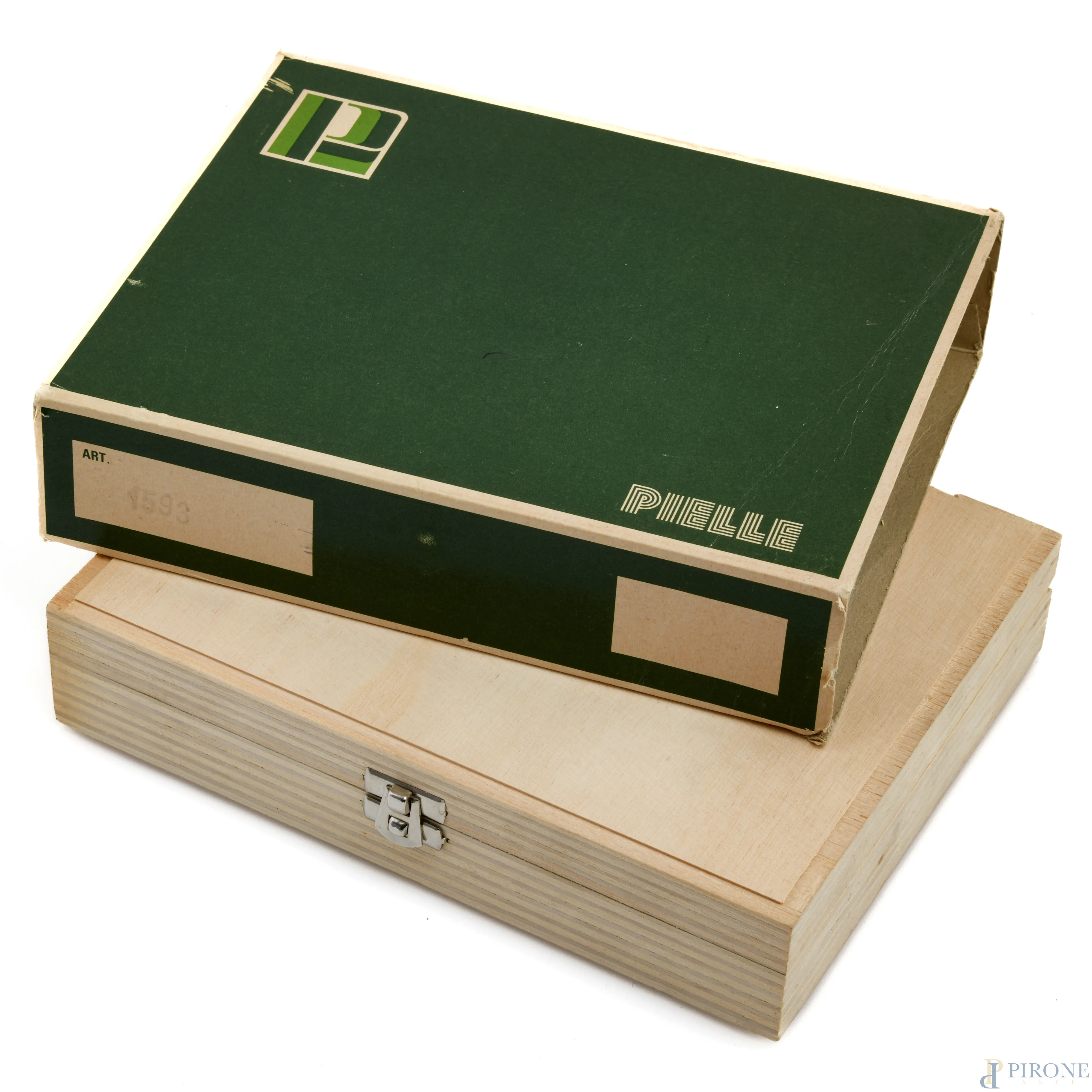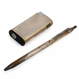 Set di accendino e penna rivestiti in argento, entro scatola di legno, XX secolo, lunghezza penna cm 13,5, (segni di usura, difetti, da revisionare)