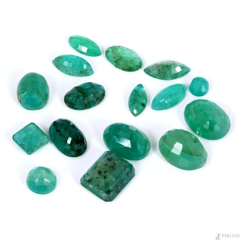 Smeraldi di taglio vario, caratura complessiva 7,17, corredato da certificato rilasciato da LGEML