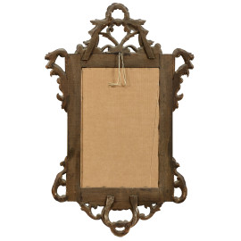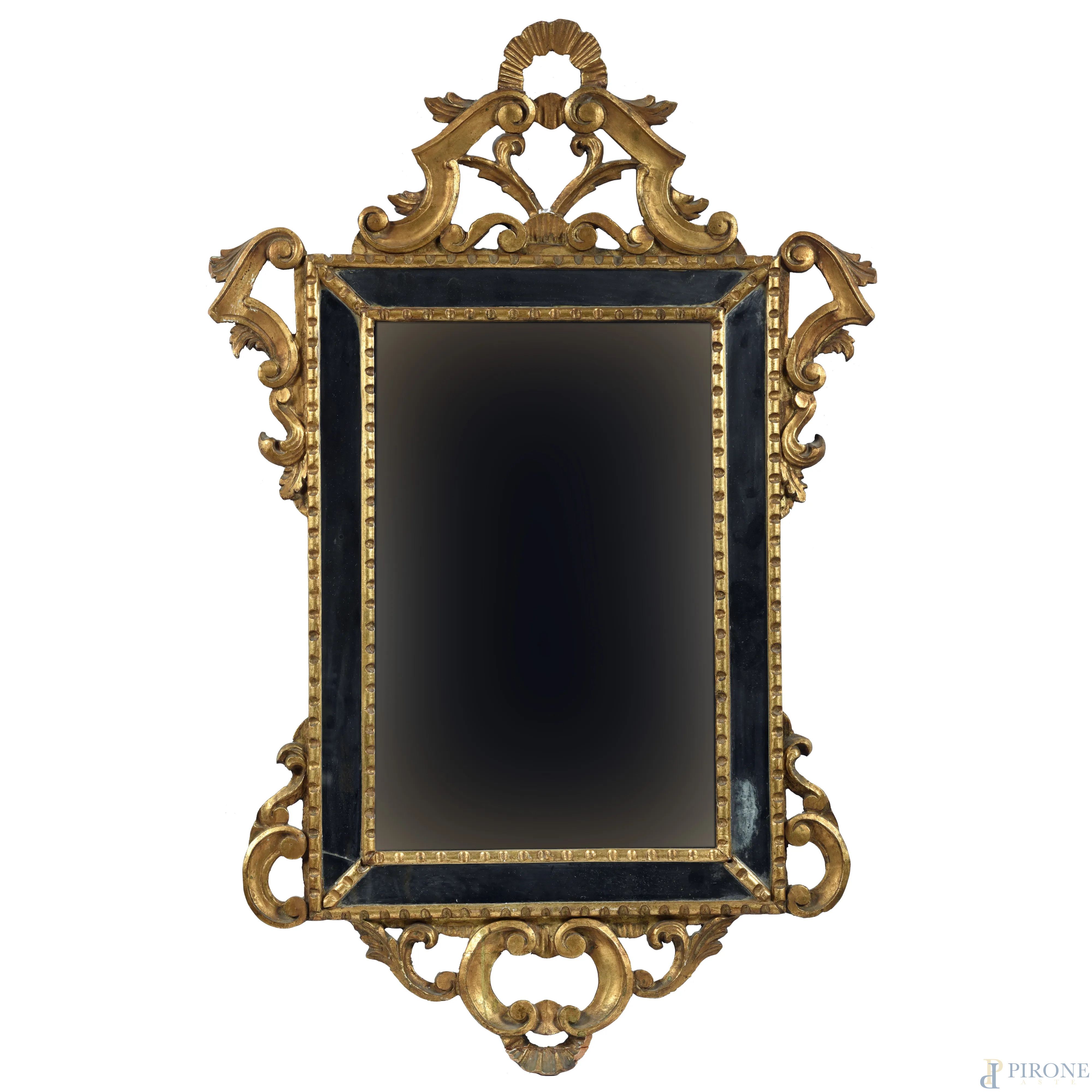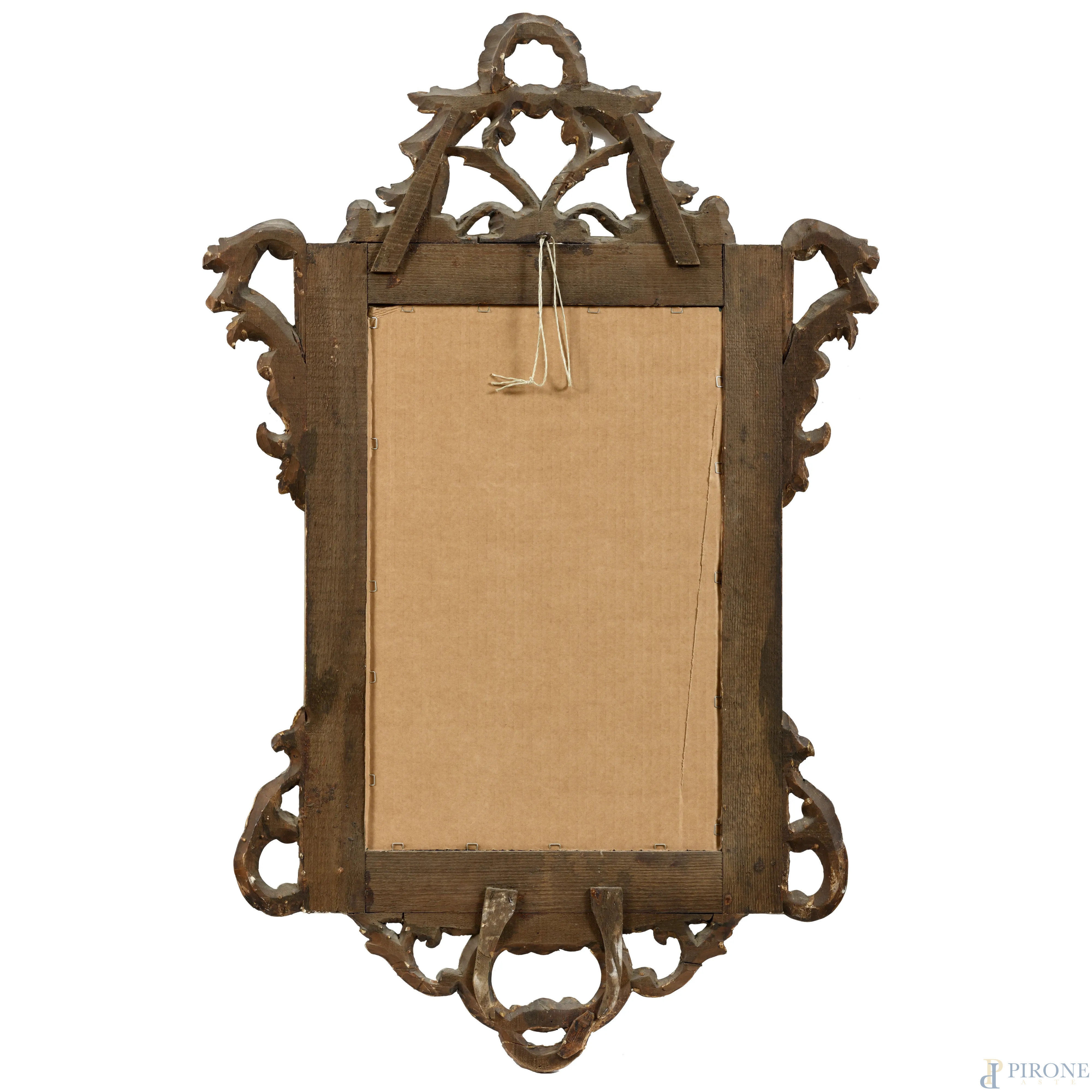 Specchiera in legno intagliato e dorato a volute, XX secolo, cm 88x56, (segni di usura, rotture, difetti)