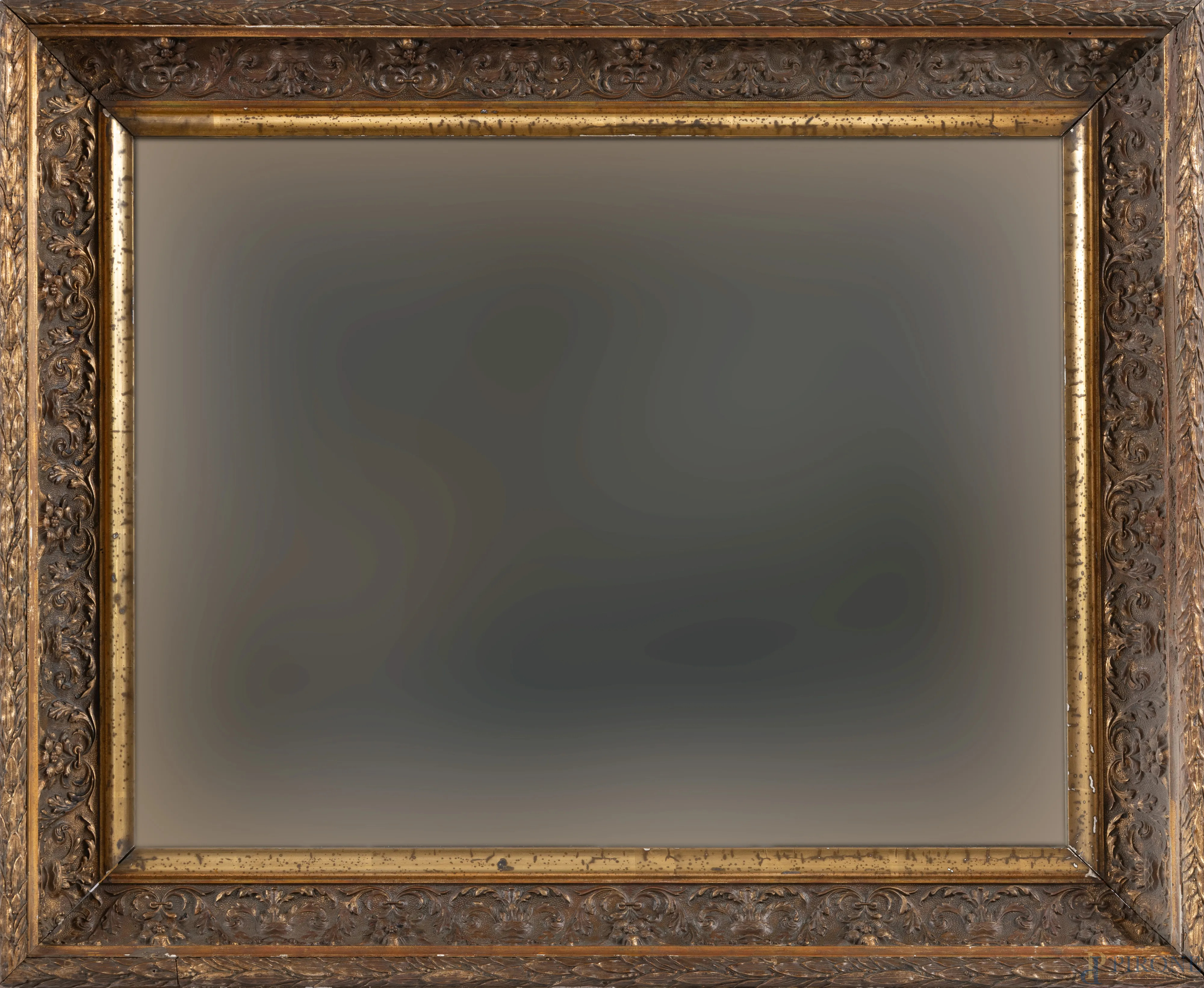 Specchiera in stucco e legno intagliato e dorato con ricco intaglio a volute e girali fogliati, XIX-XX secolo, cm 82,5x66,5, (segni di usura, difetti)