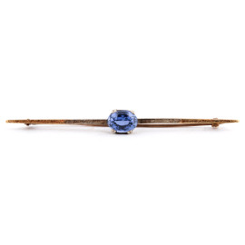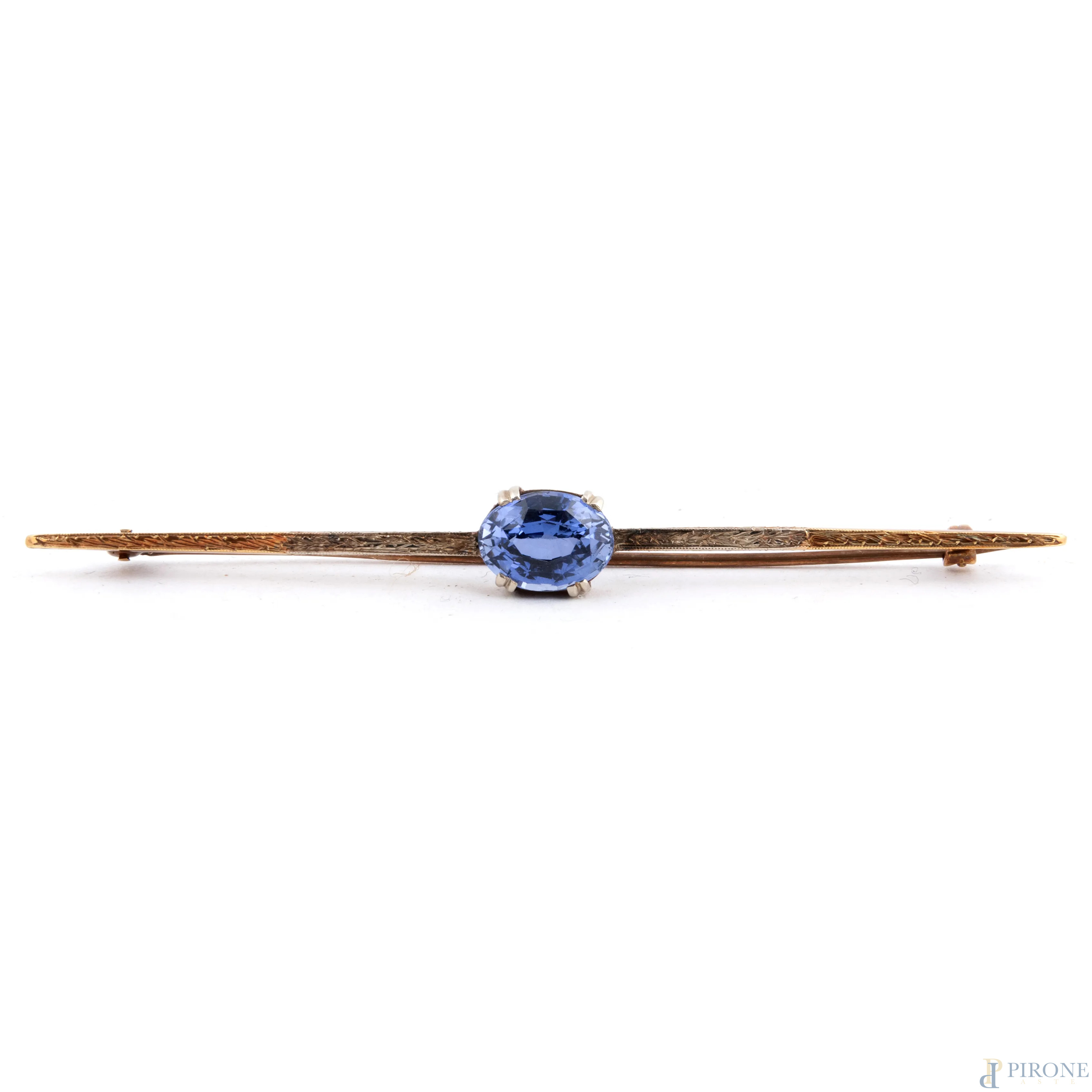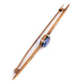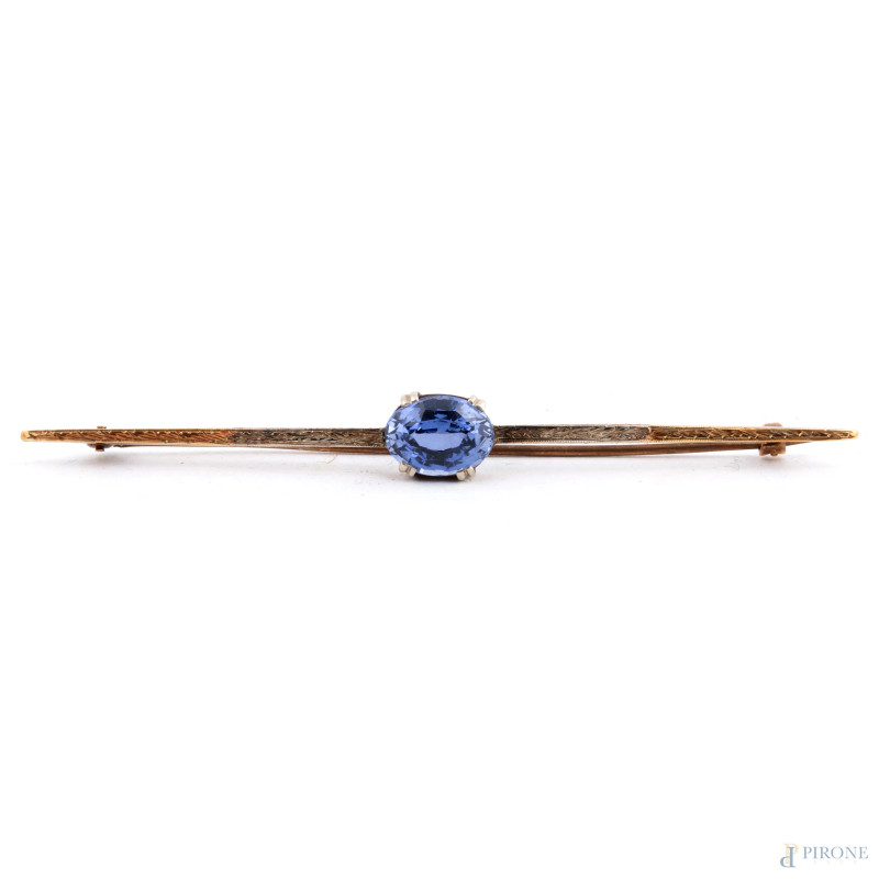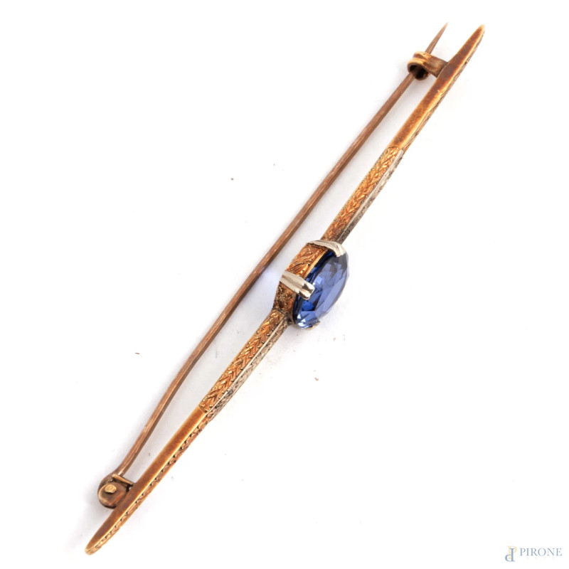 Spilla in oro basso con ametista, lunghezza cm 8, peso lordo complessivo gr 4,5