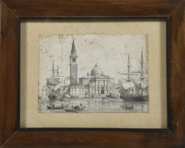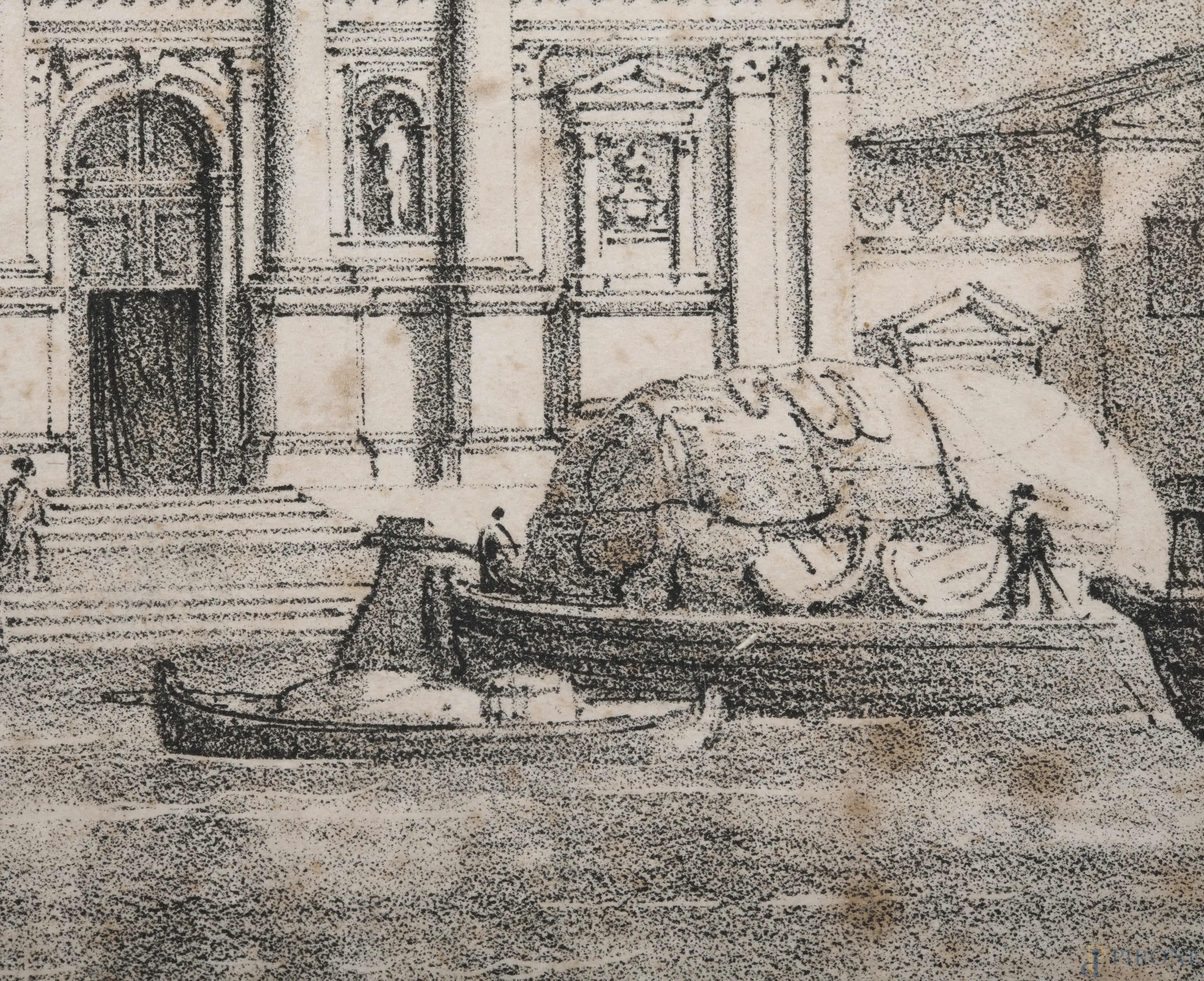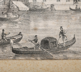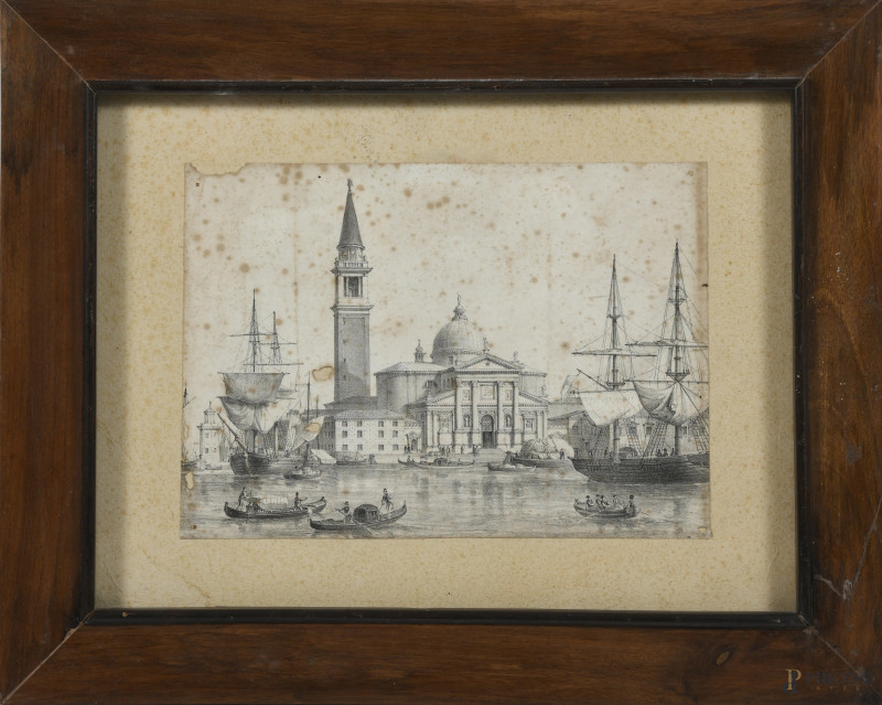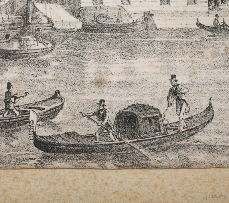 Stampa raffigurante scorcio veneziano, XIX secolo, cm 20x28, entro cornice, (segni di usura, gore, lacune, foxing, rotture)
