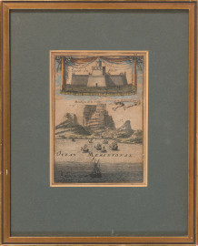 Stampa ritoccata raffigurante Oceano Meridionale, XVIII-XIX secolo, cm 25,5x20 compreso passepartout, entro cornice, (bruniture, ondulazioni della carta)