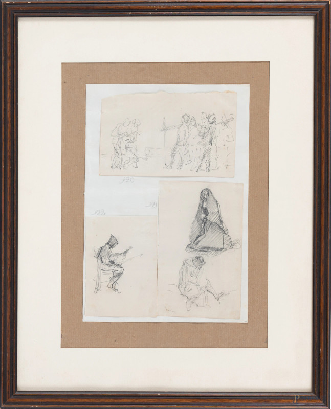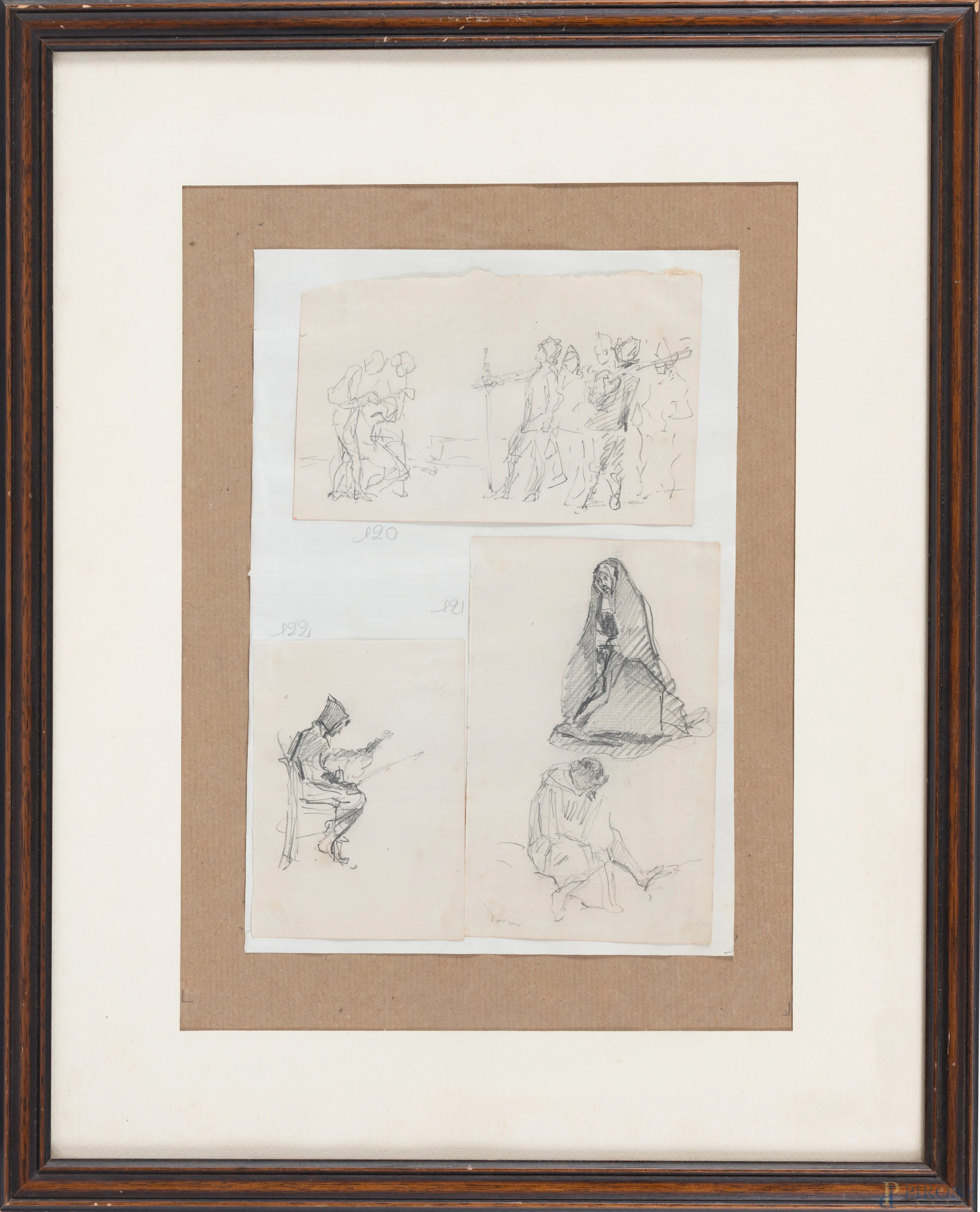 Studi di figura, XX secolo, 3 bozzetti a grafite su carta entro unica cornice, cm complessivi 48x38 compreso passepartout (ondulazioni della carta, segni di usura ai margini)