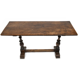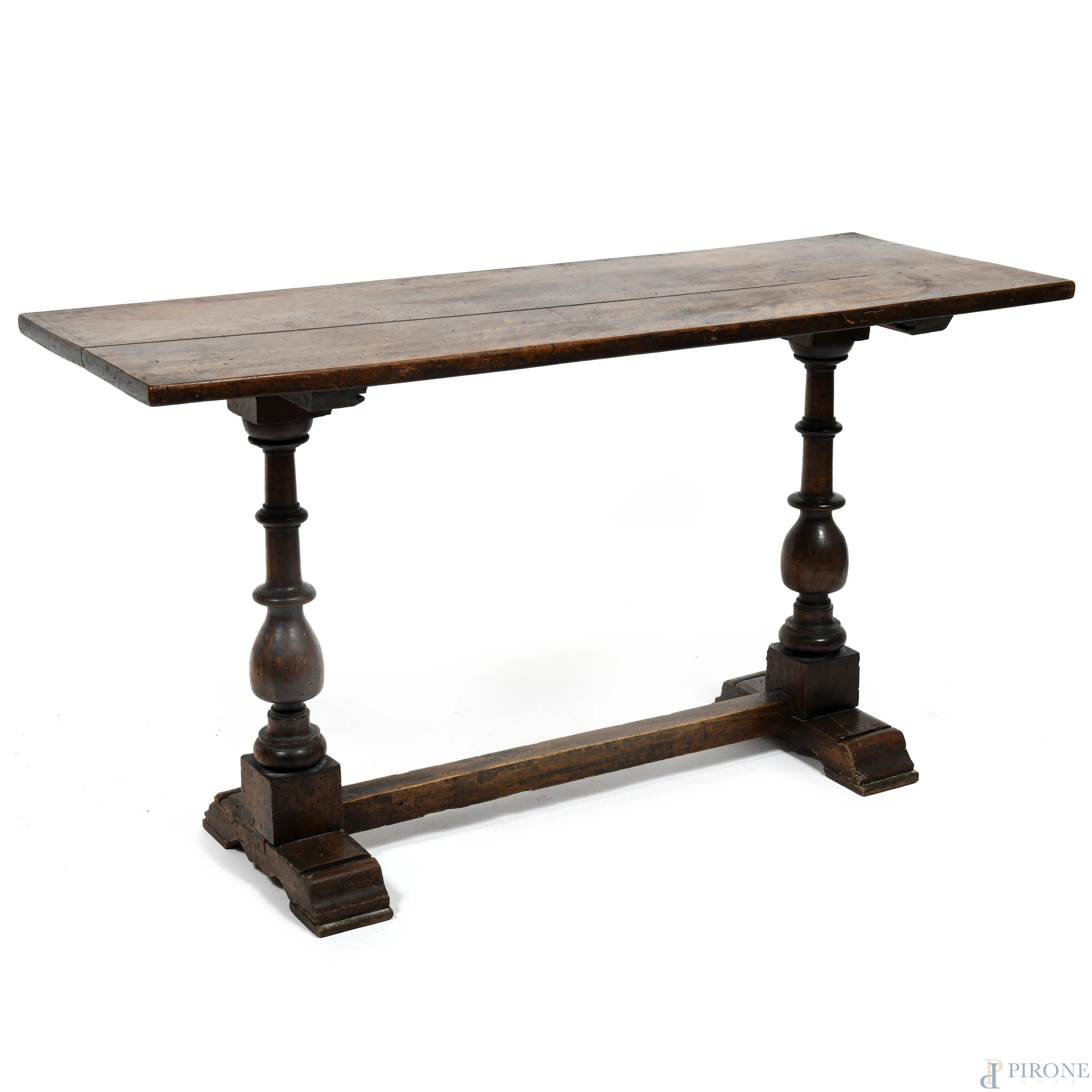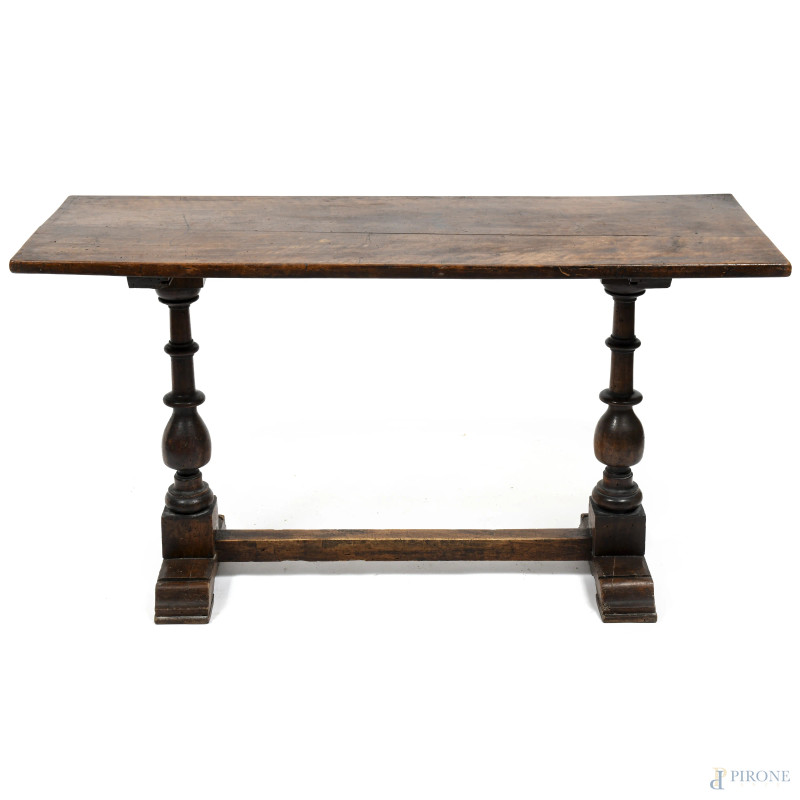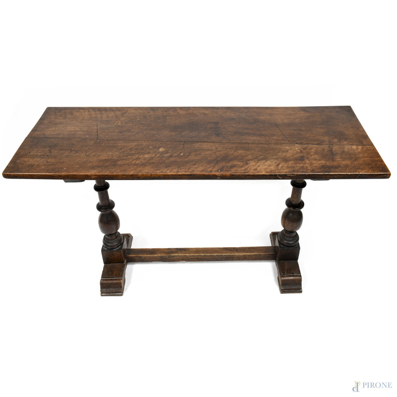 Tavolinetto in noce tipo fratino con piano poggiante su colonnine tornite e raccordate da traversa, XIX secolo, cm 69x124,5x45, (segni di usura, scalfiture, rotture, fori di tarlo, difetti)
