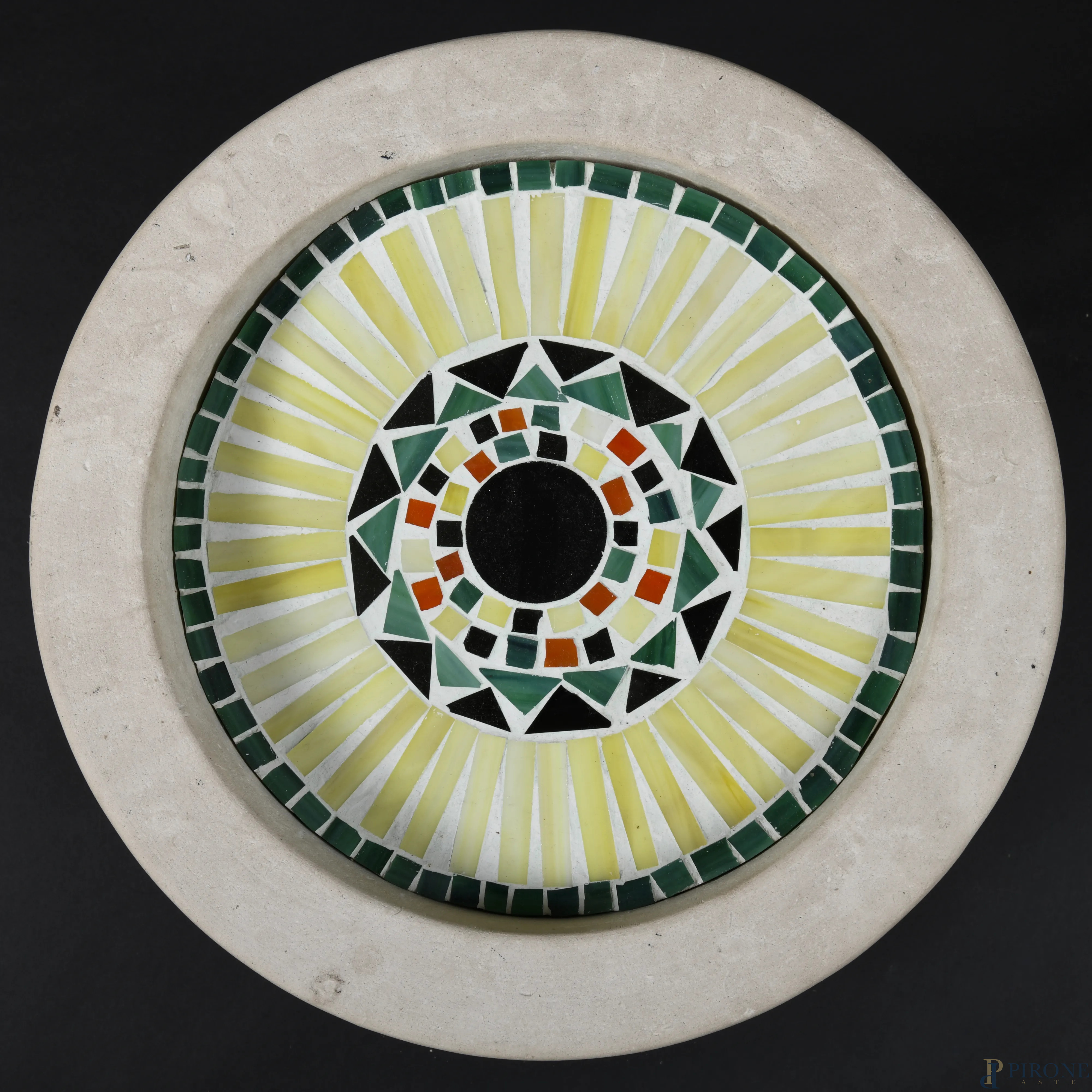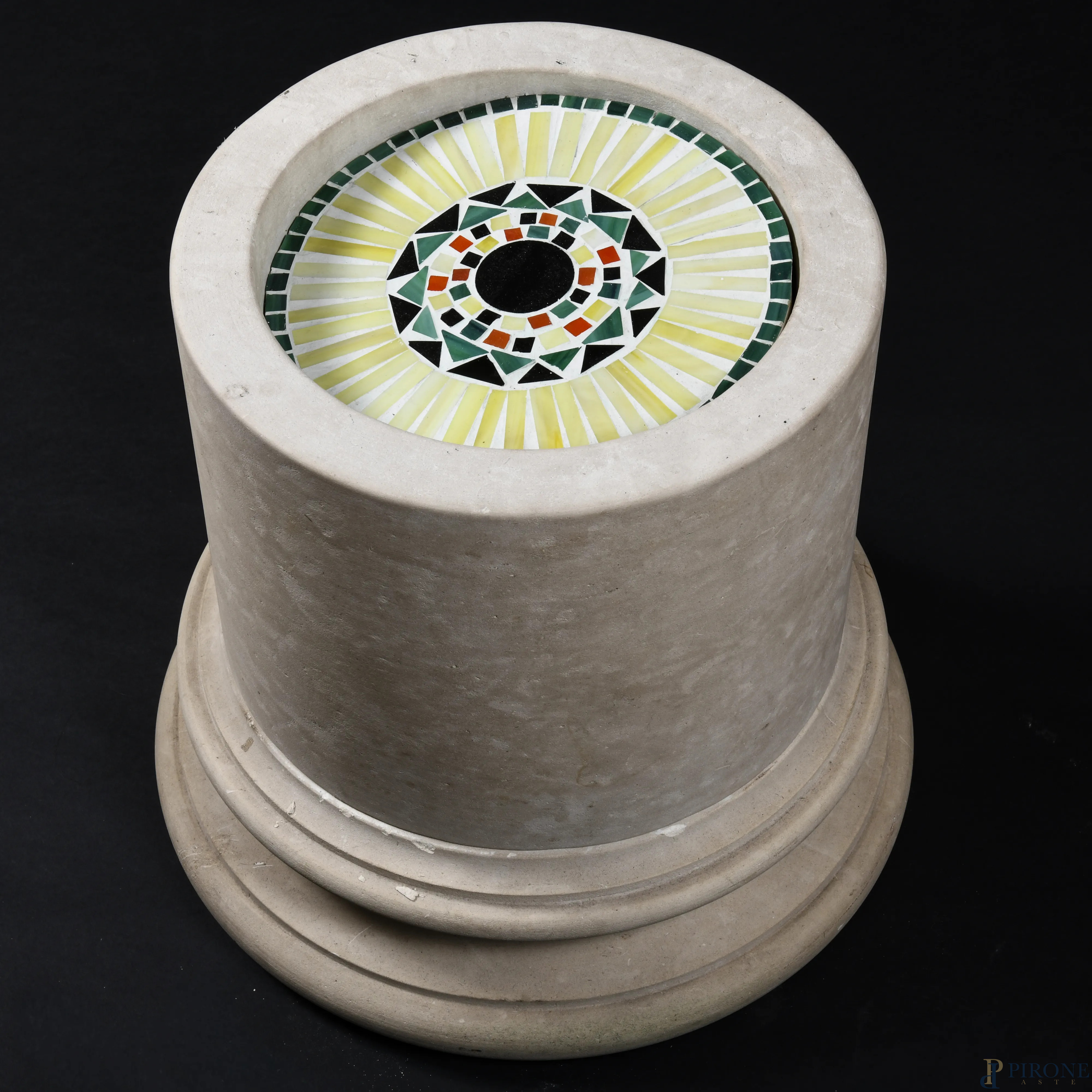 Tavolino a guisa di base di colonna in marmo con piano in gesso e pasta vitrea, XX secolo, cm 40,5x40 circa, (segni di usura, difetti)