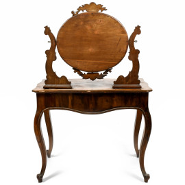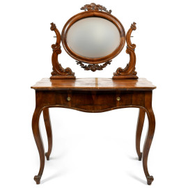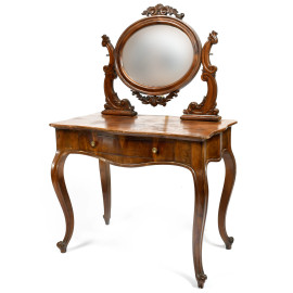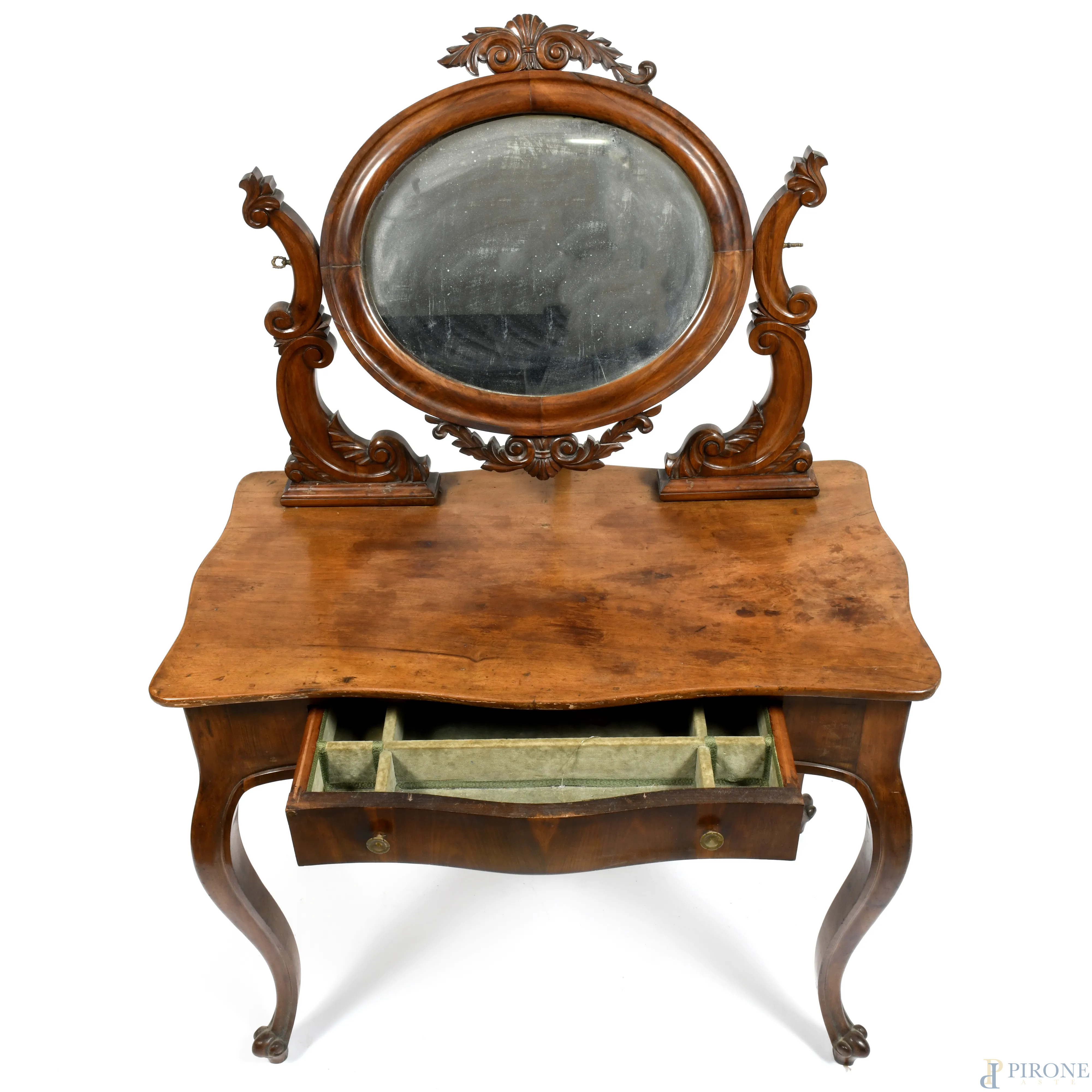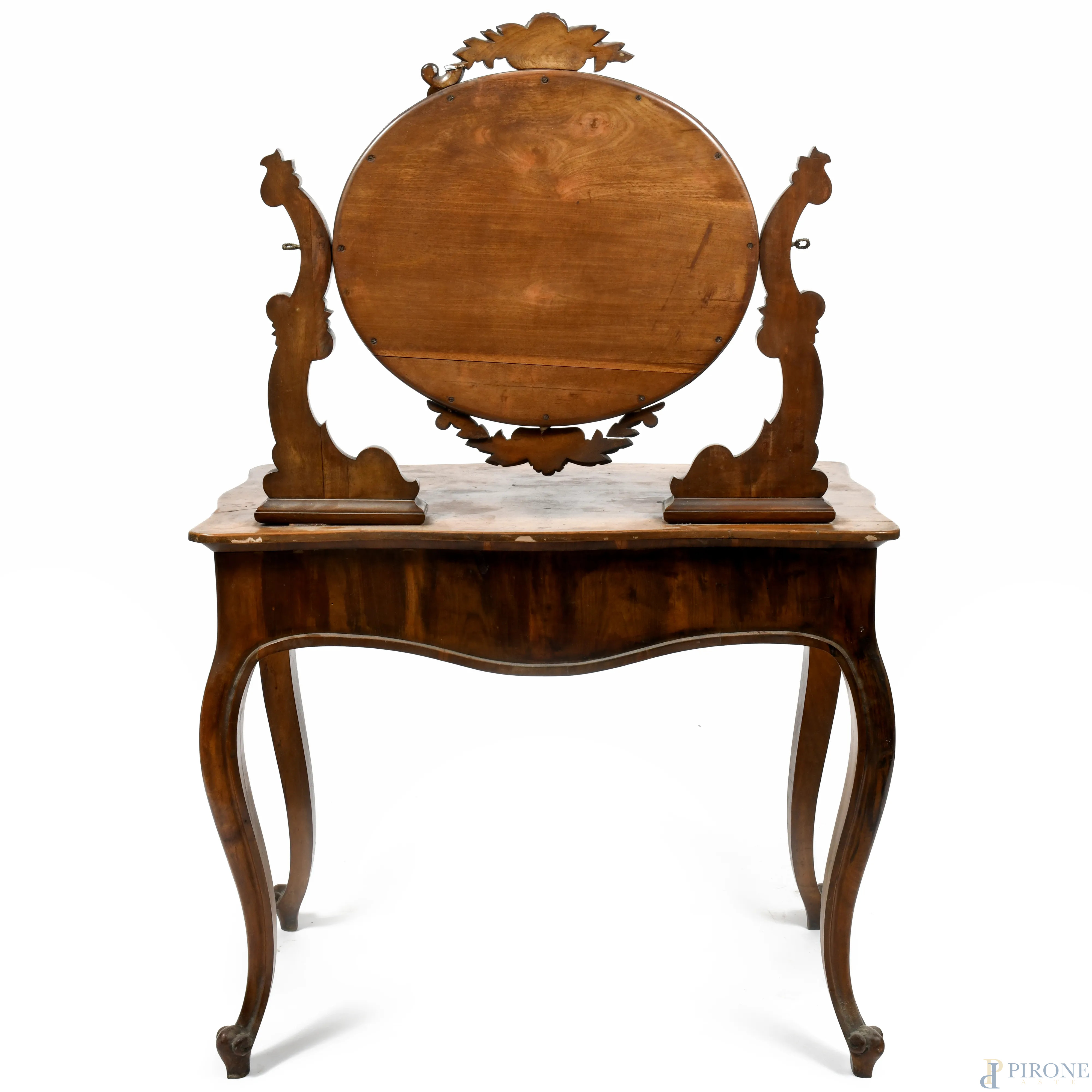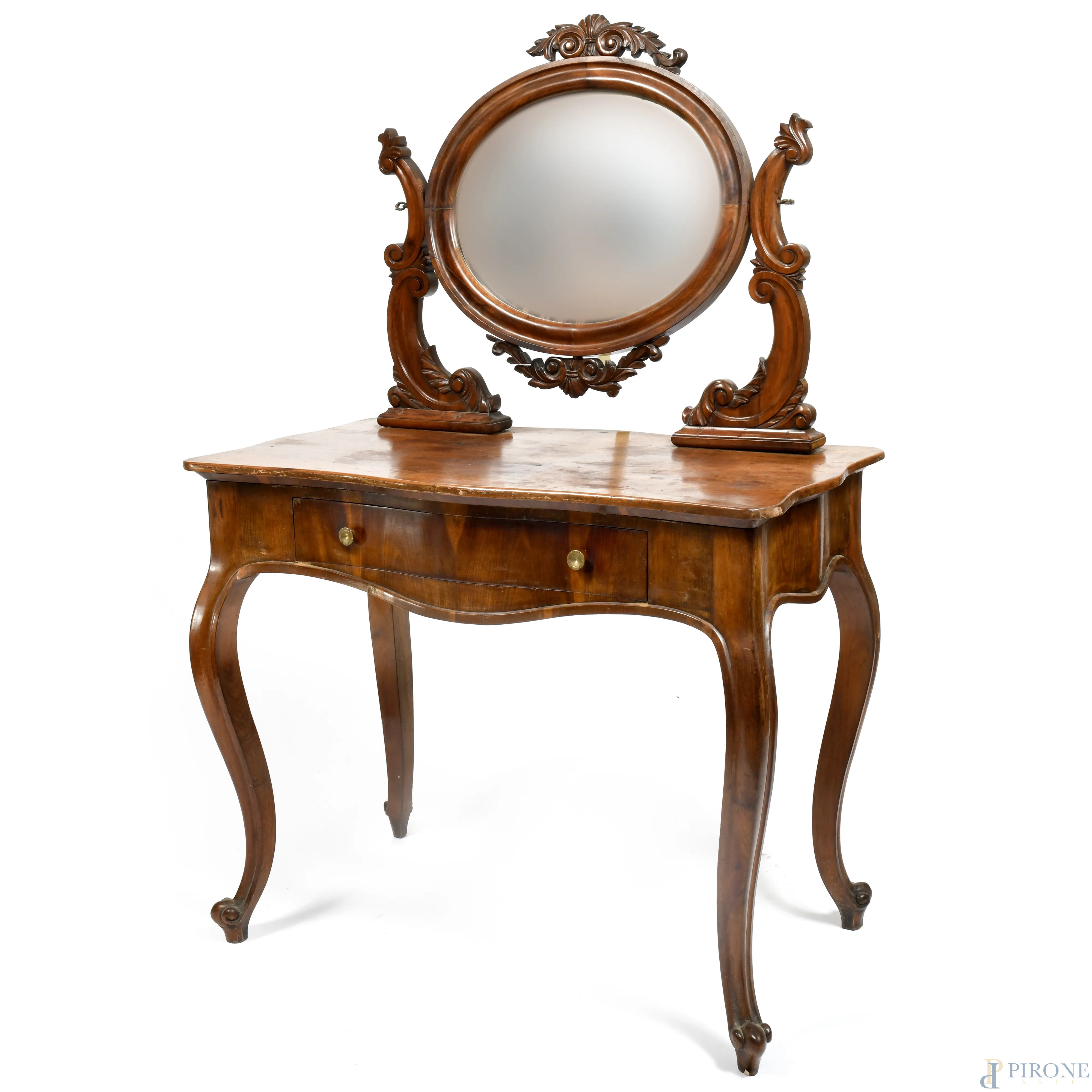 Toletta in noce con fronte mosso a un cassetto, gambe mosse terminanti in piedi ferini, XX secolo, cm 153,5x101x56, (segni di usura, scalfiture, difetti)