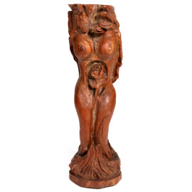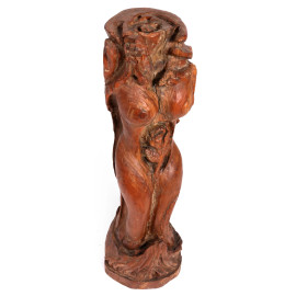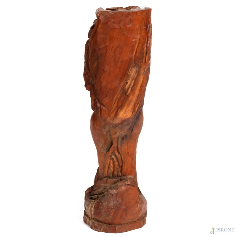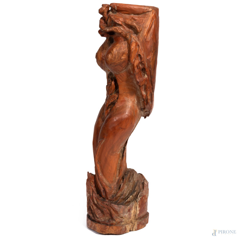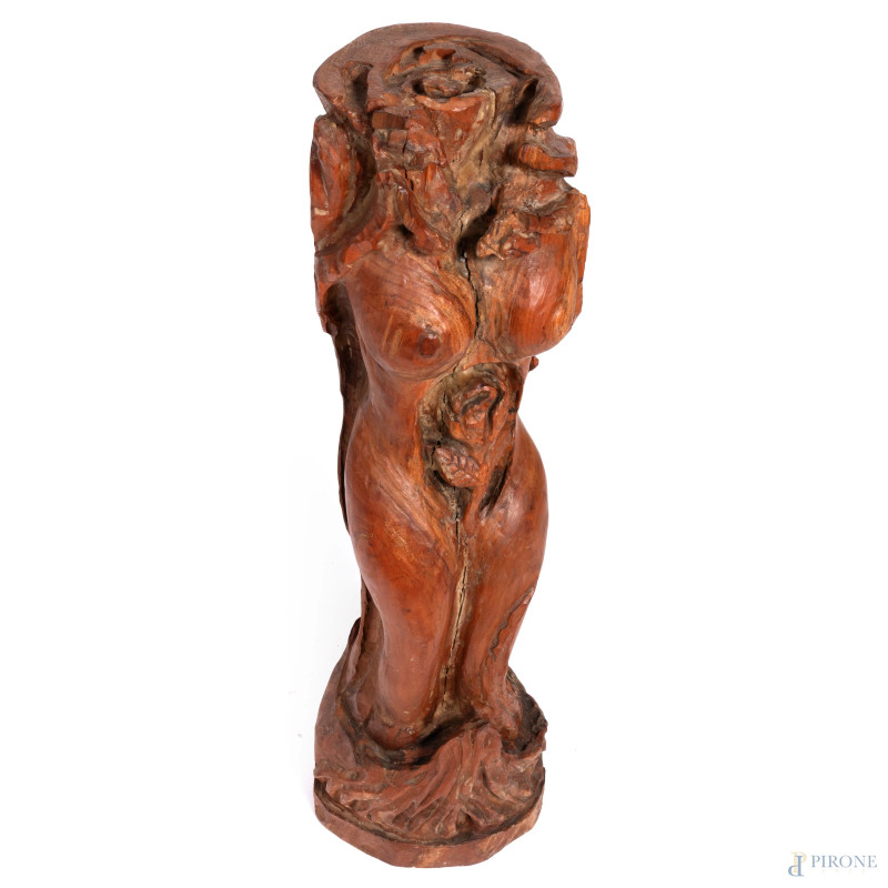 Torso di donna con rosa, XX secolo, scultura lignea, altezza cm 78, (segni di usura, fessurazioni, difetti)