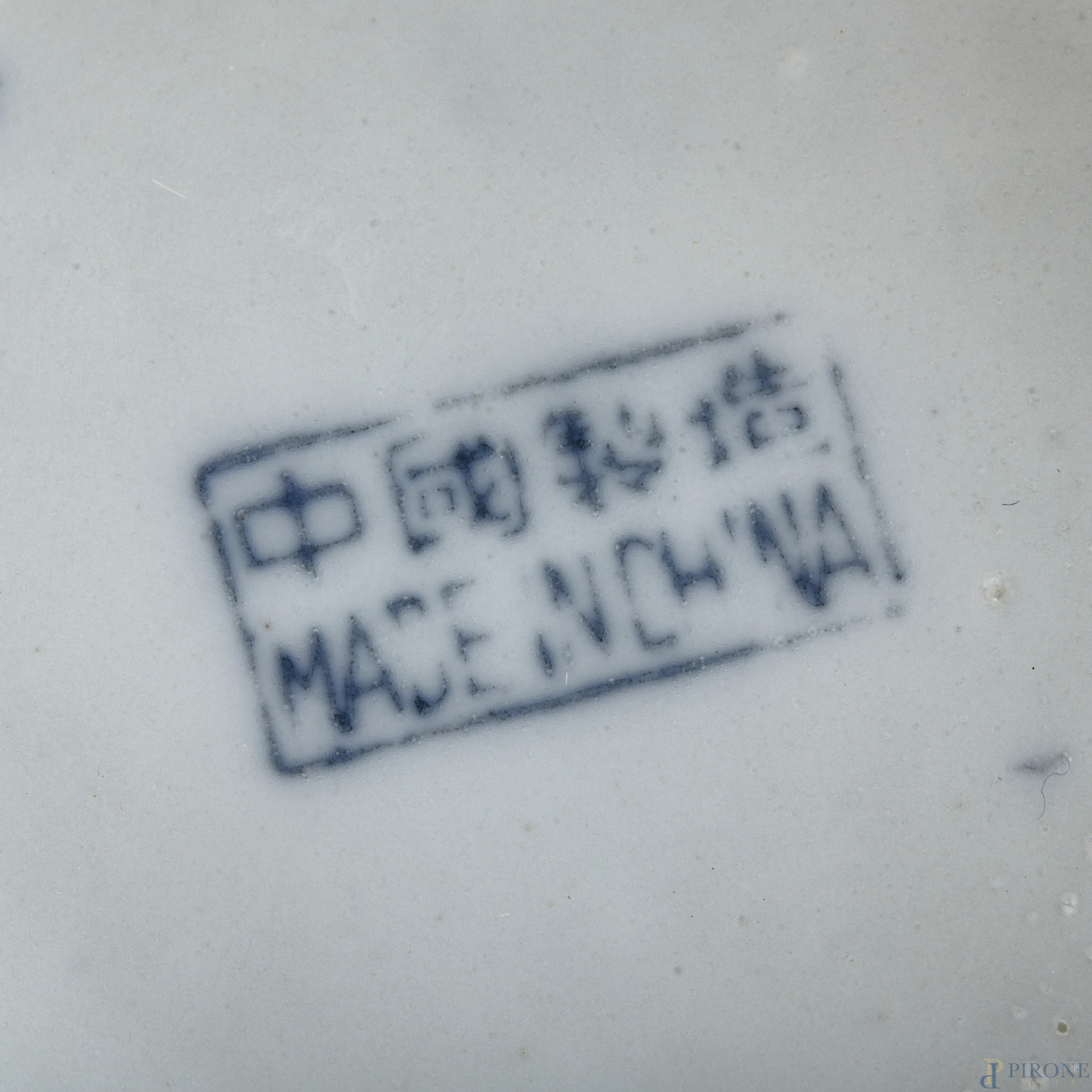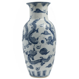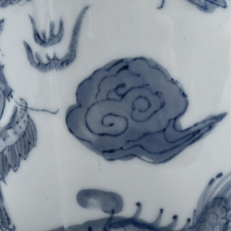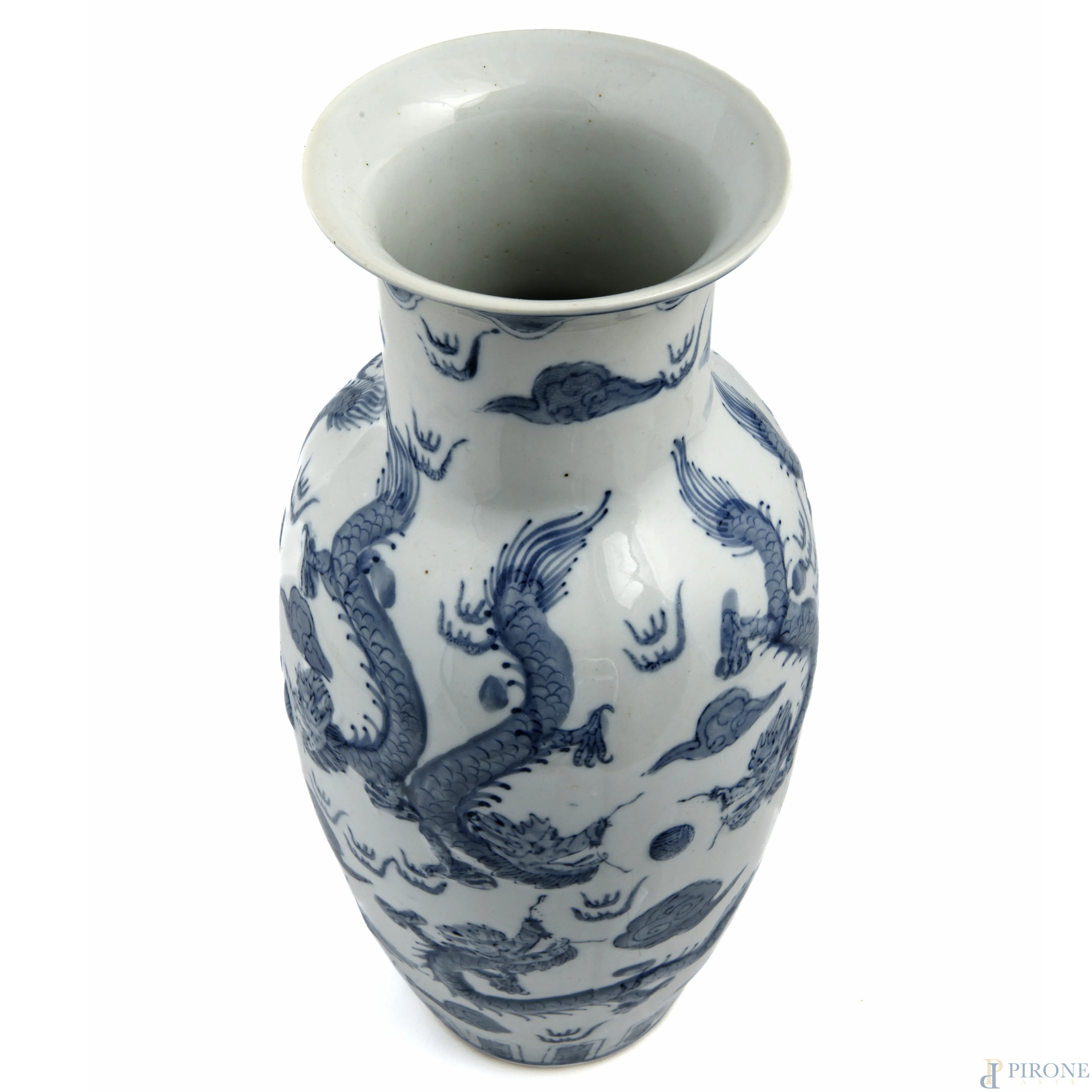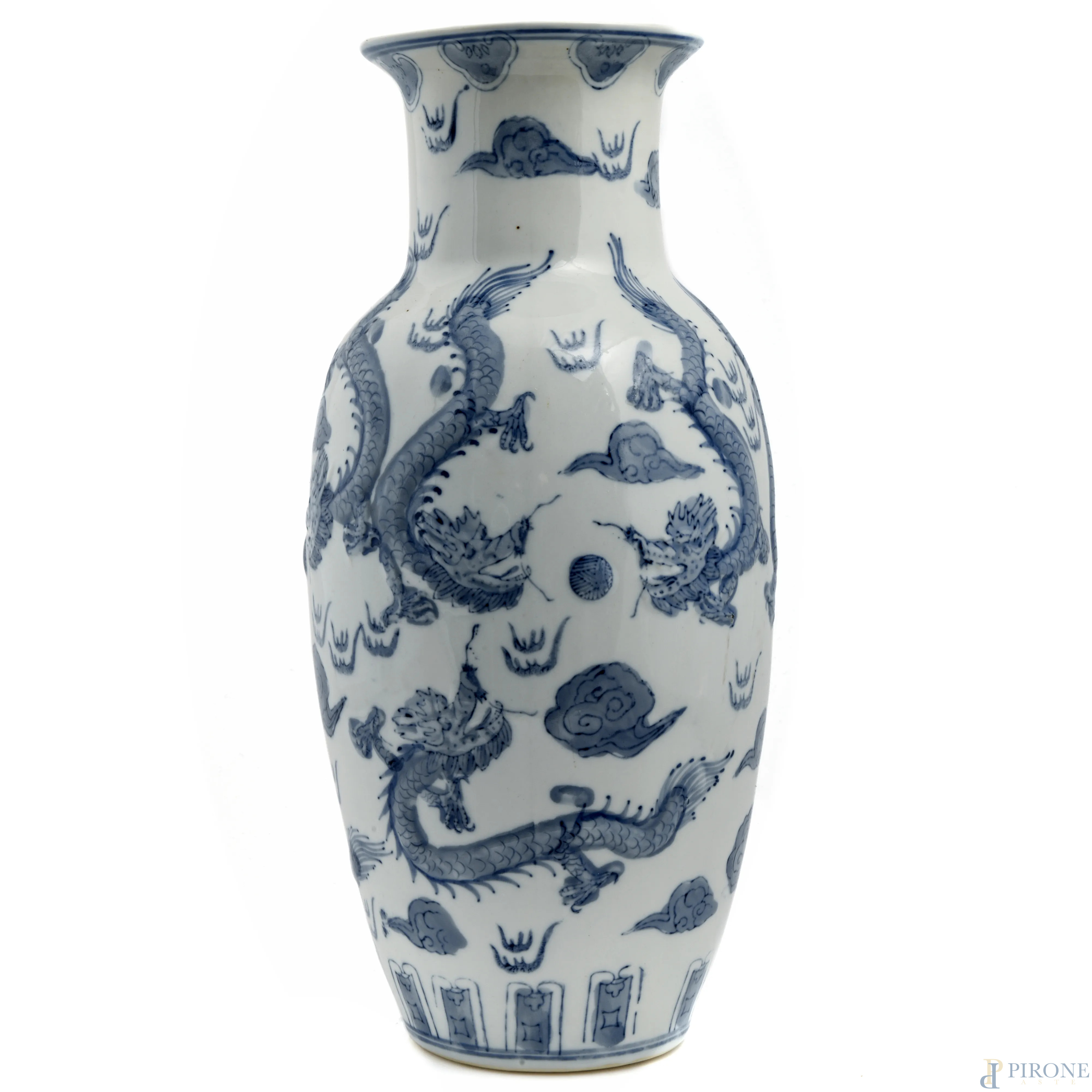Vaso in porcellana bianca decorata con dragoni volanti nei toni dell'azzurro. Cina, XX secolo, altezza cm 40, (lievi segni di usura)